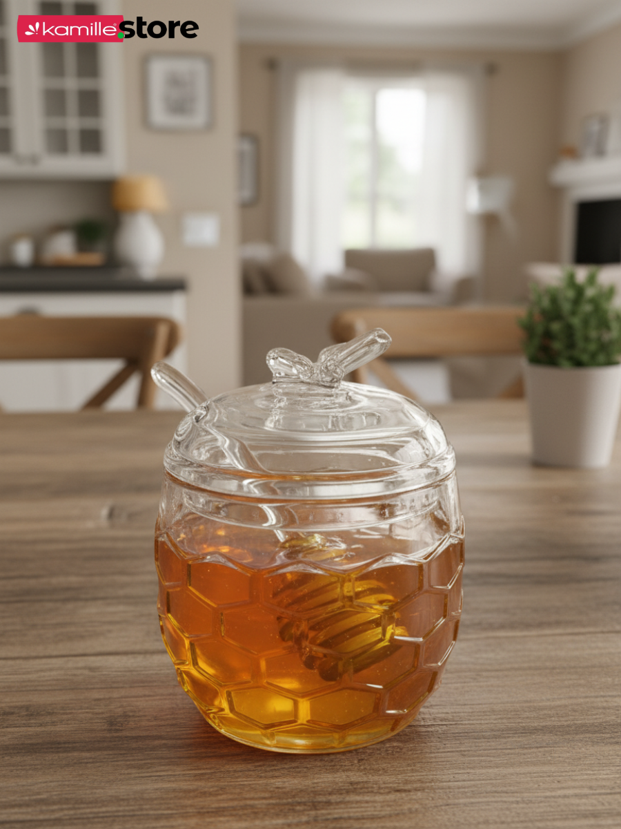 Стеклянная баночка для мёда и варенья объемом 240 мл. с декором в виде медовых сот и пчелкой на крышке, станет незаменимым помощником на вашей кухне. Выполненная из высококачественного стекла, она не только функциональна, но и эстетически привлекательна, оснащена ложкой и крышкой, что обеспечивает удобство использования и хранения. Ложка позволяет аккуратно доставать продукт из баночки, а крышка предотвращает обветривание продукта и попадание пыли и насекомых внутрь. Использовать такую емкость можно для абсолютно разнообразных продуктов, например сахар, сгущенное молоко, джемы или специи.
