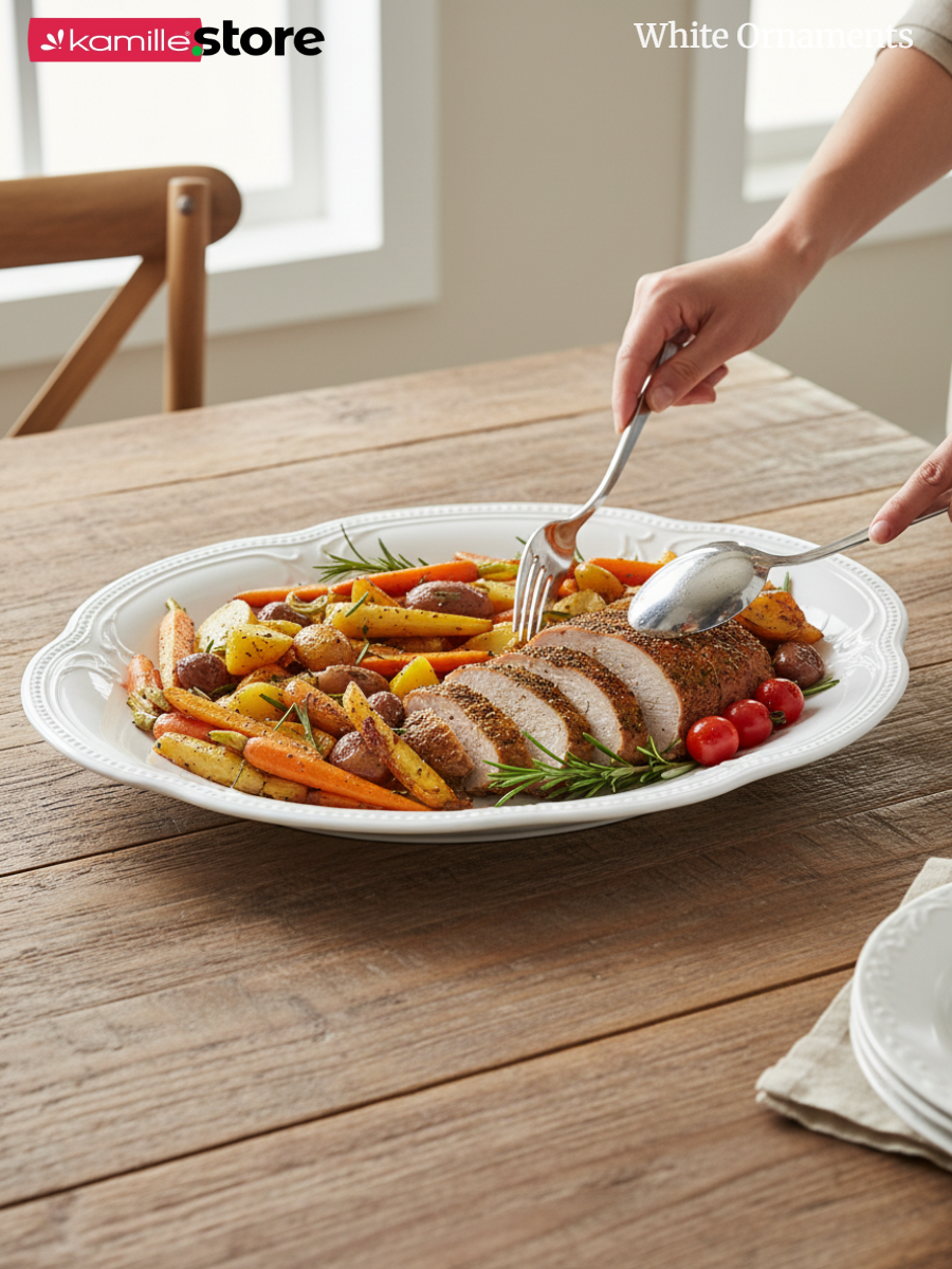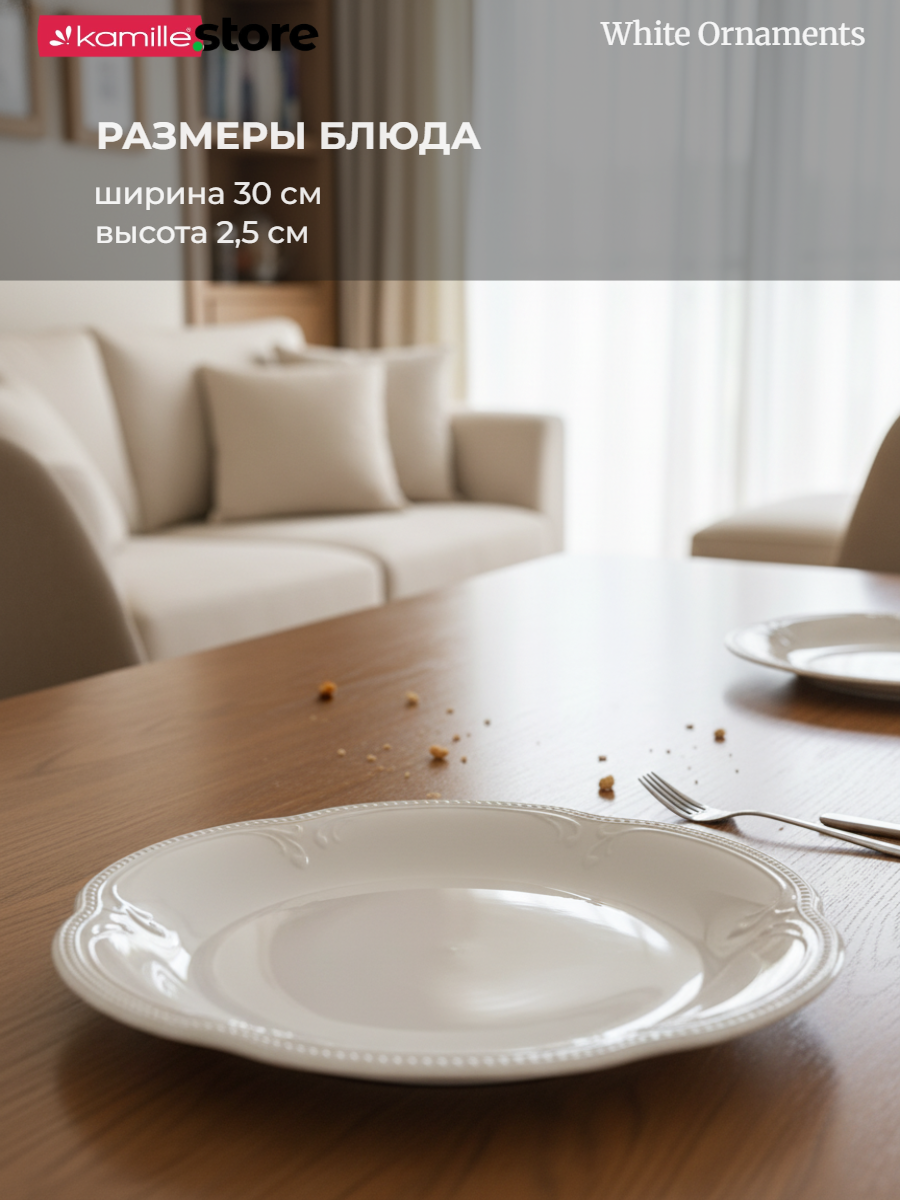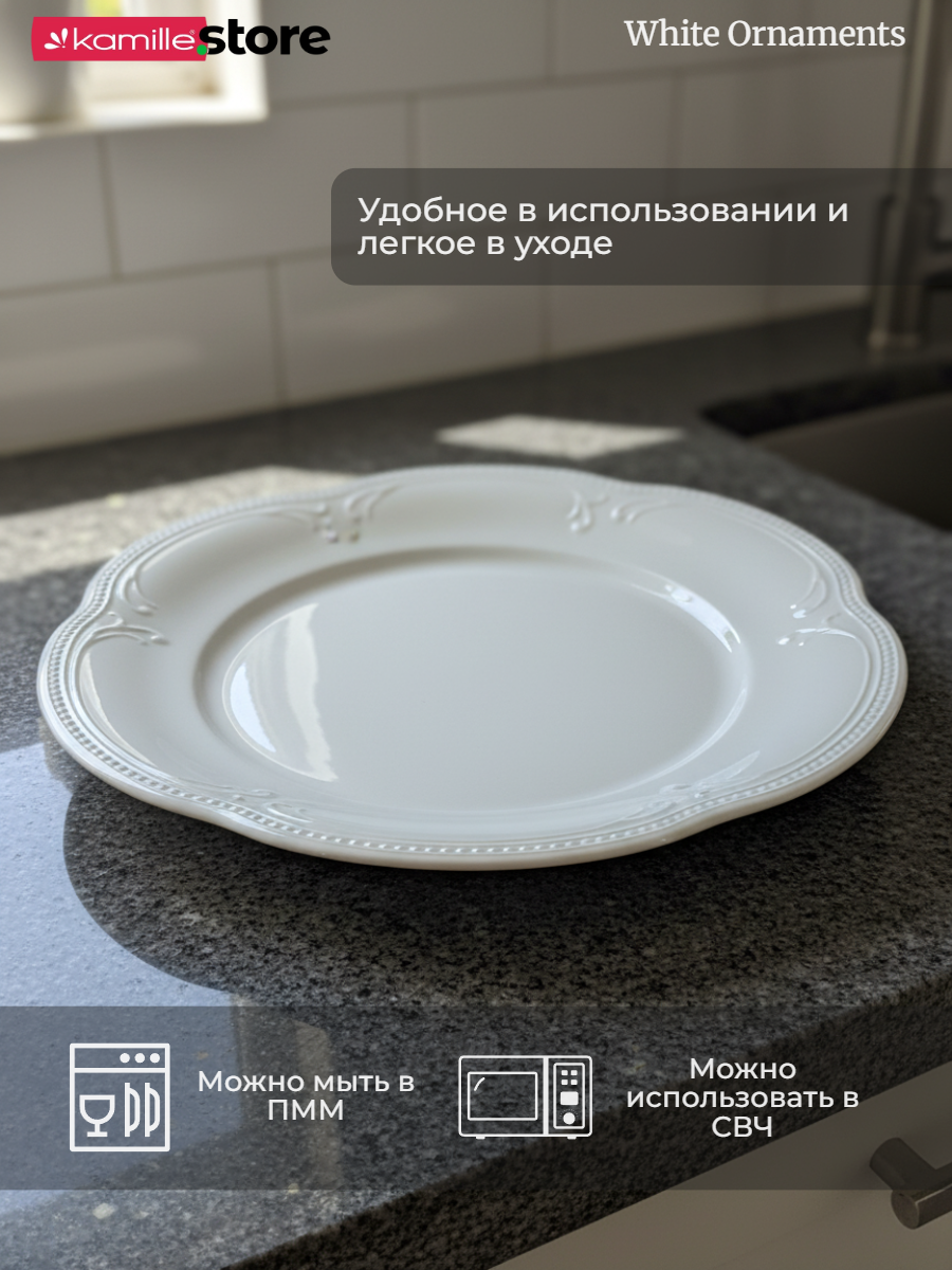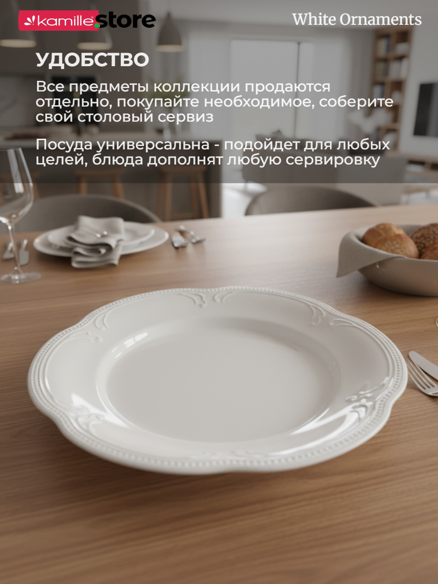 Столовая посуда серии "White Ornaments" - это классическая, изящная, привлекательная, белоснежная и очень практичная посуда. Все предметы из этой коллекции можно мыть в посудомоечной машине и использовать в микроволновых печах. Фарфор этой серии обладает такими характеристиками как: укрепленный край от сколов, особо прочная глазурь, минимальная пористость, практичность и долговечность. Это стильный выбор для сервировки вашего стола.