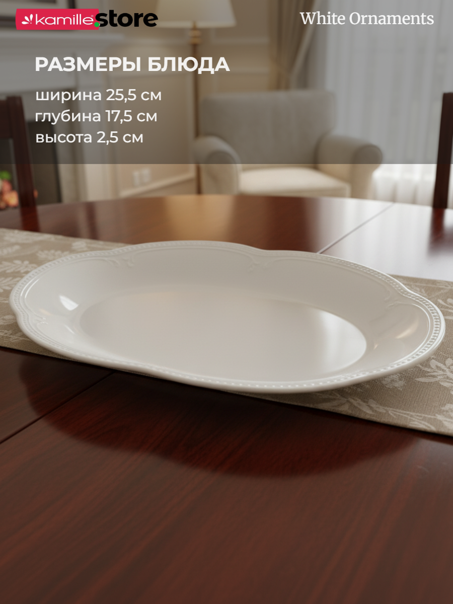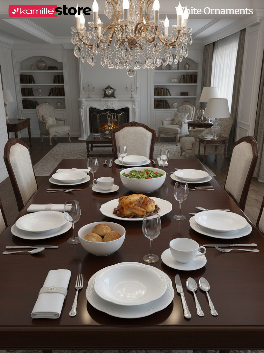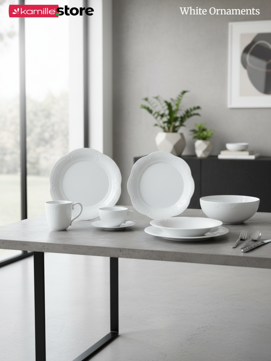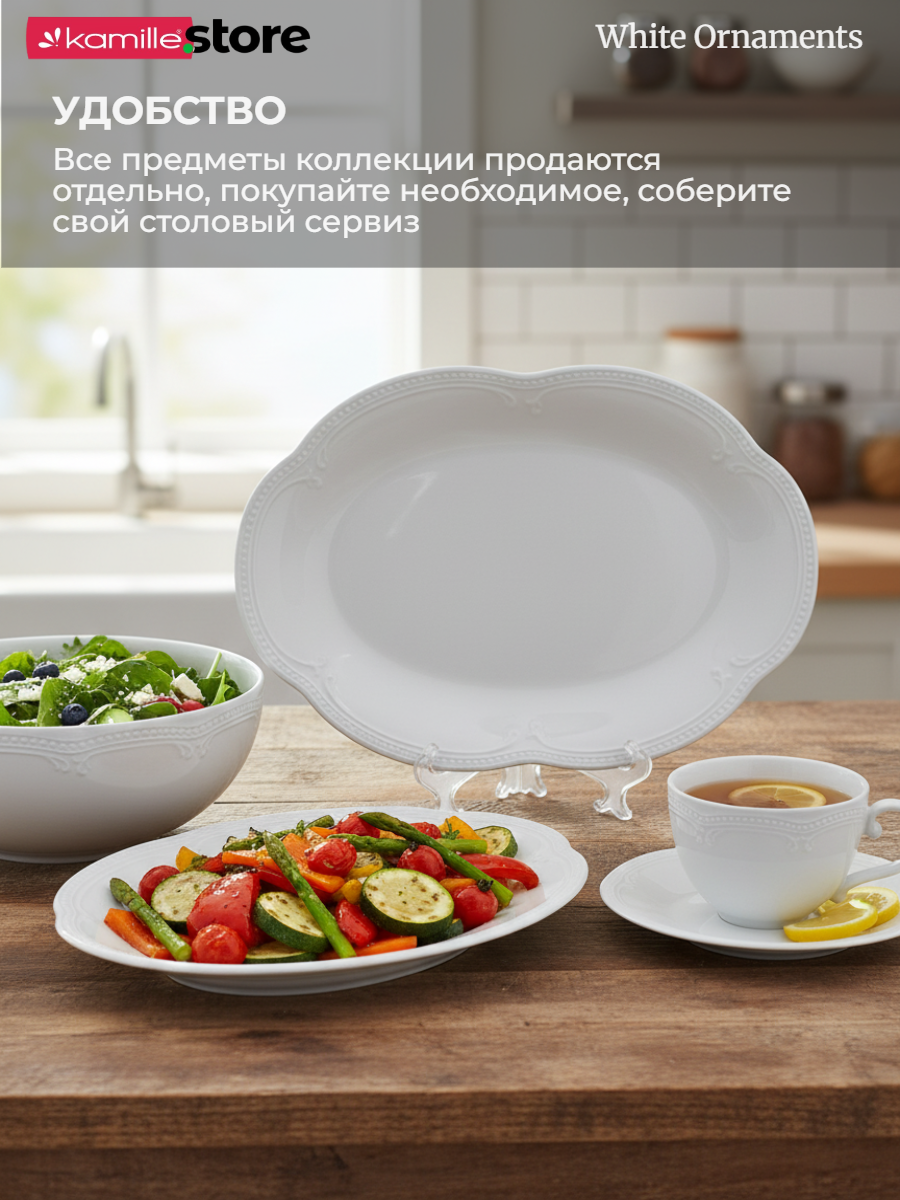 Столовая посуда серии "White Ornaments" - это классическая, изящная, привлекательная, белоснежная и очень практичная посуда. Все предметы из этой коллекции можно мыть в посудомоечной машине и использовать в микроволновых печах. Фарфор этой серии обладает такими характеристиками как: укрепленный край от сколов, особо прочная глазурь, минимальная пористость, практичность и долговечность. Это стильный выбор для сервировки вашего стола.