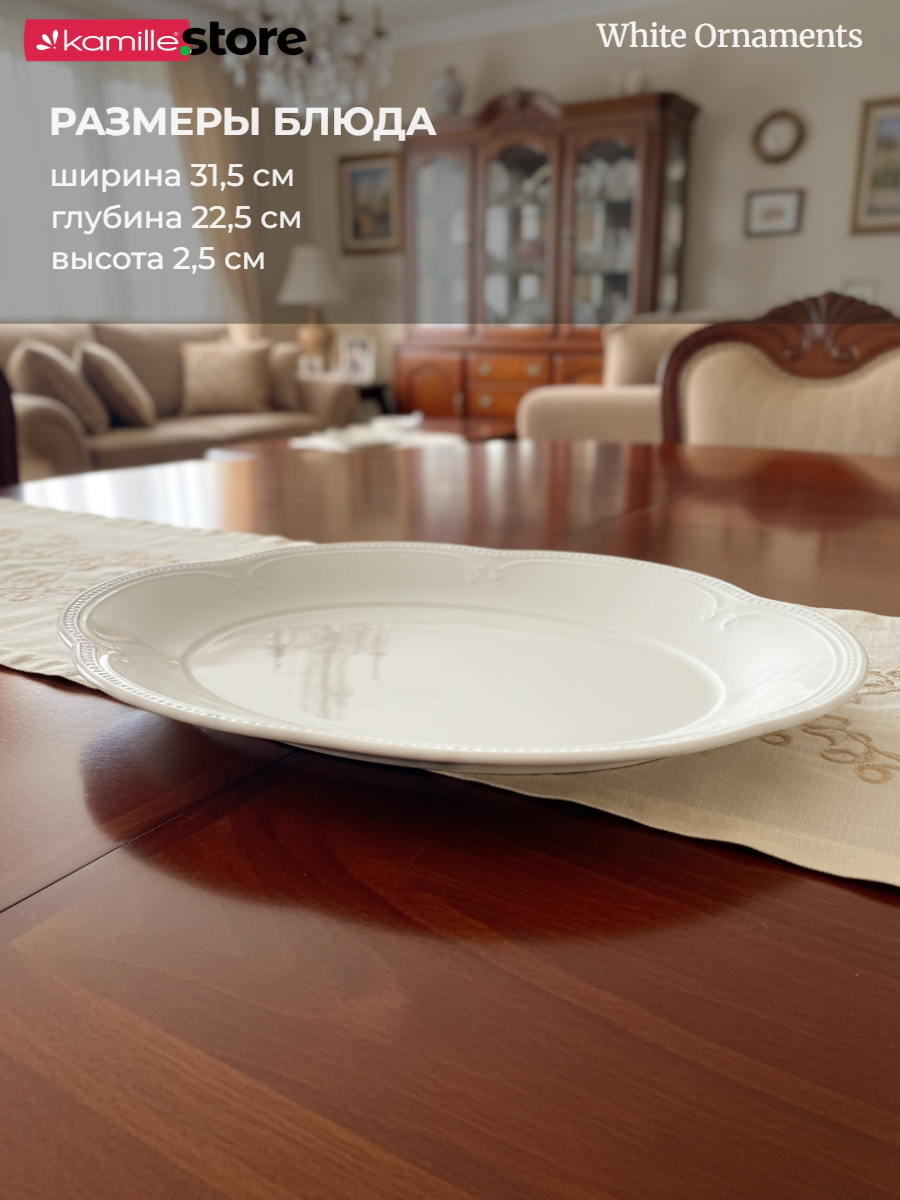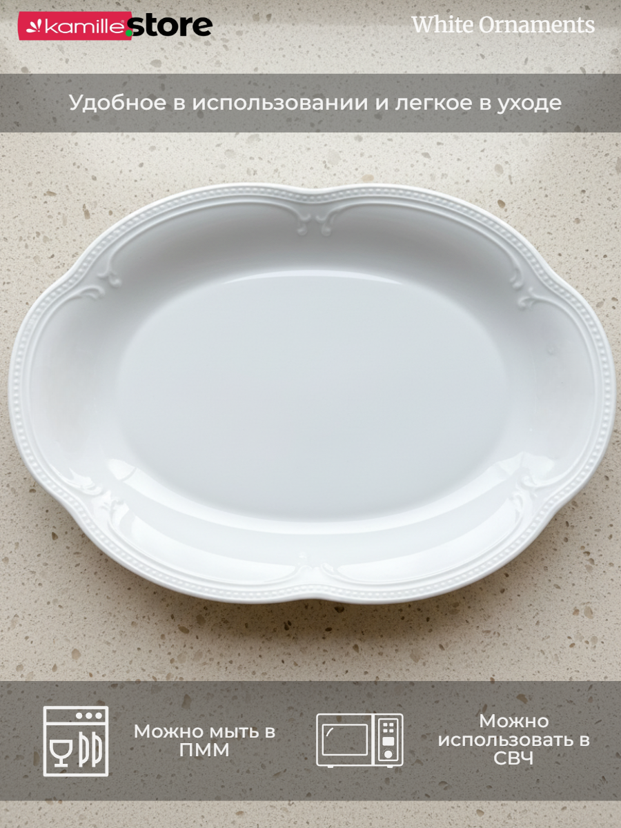 Серия посуды "White Ornaments" универсальна, как для дома, так и для кафе, и ресторанов. Неброский рельефный орнамент, универсальный классический дизайн коллекции - блюда хорошо дополнят любую сервировку.