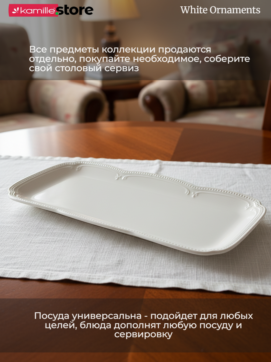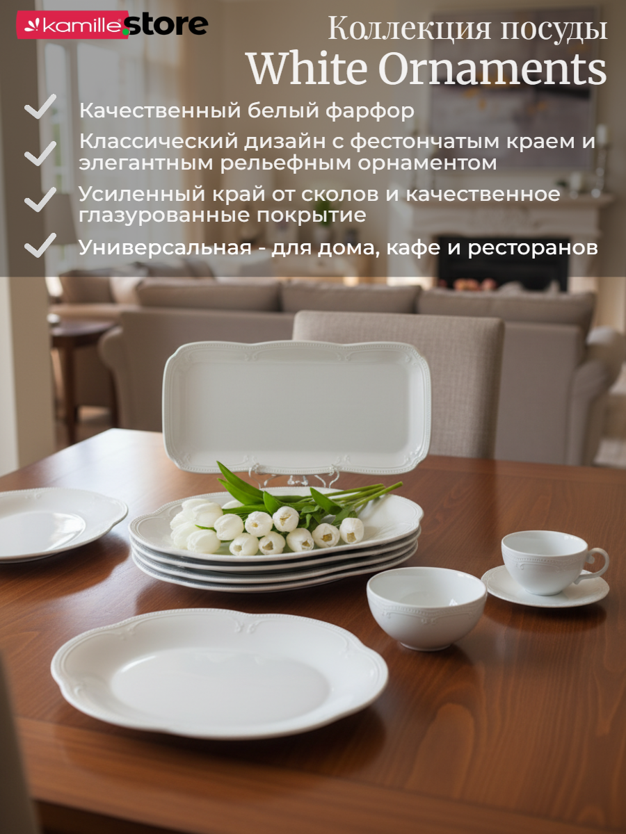 Столовая посуда серии "White Ornaments" - это классическая, изящная, привлекательная, белоснежная и очень практичная посуда. Все предметы из этой коллекции можно мыть в посудомоечной машине и использовать в микроволновых печах. Фарфор этой серии обладает такими характеристиками как: укрепленный край от сколов, особо прочная глазурь, минимальная пористость, практичность и долговечность. Это стильный выбор для сервировки вашего стола.