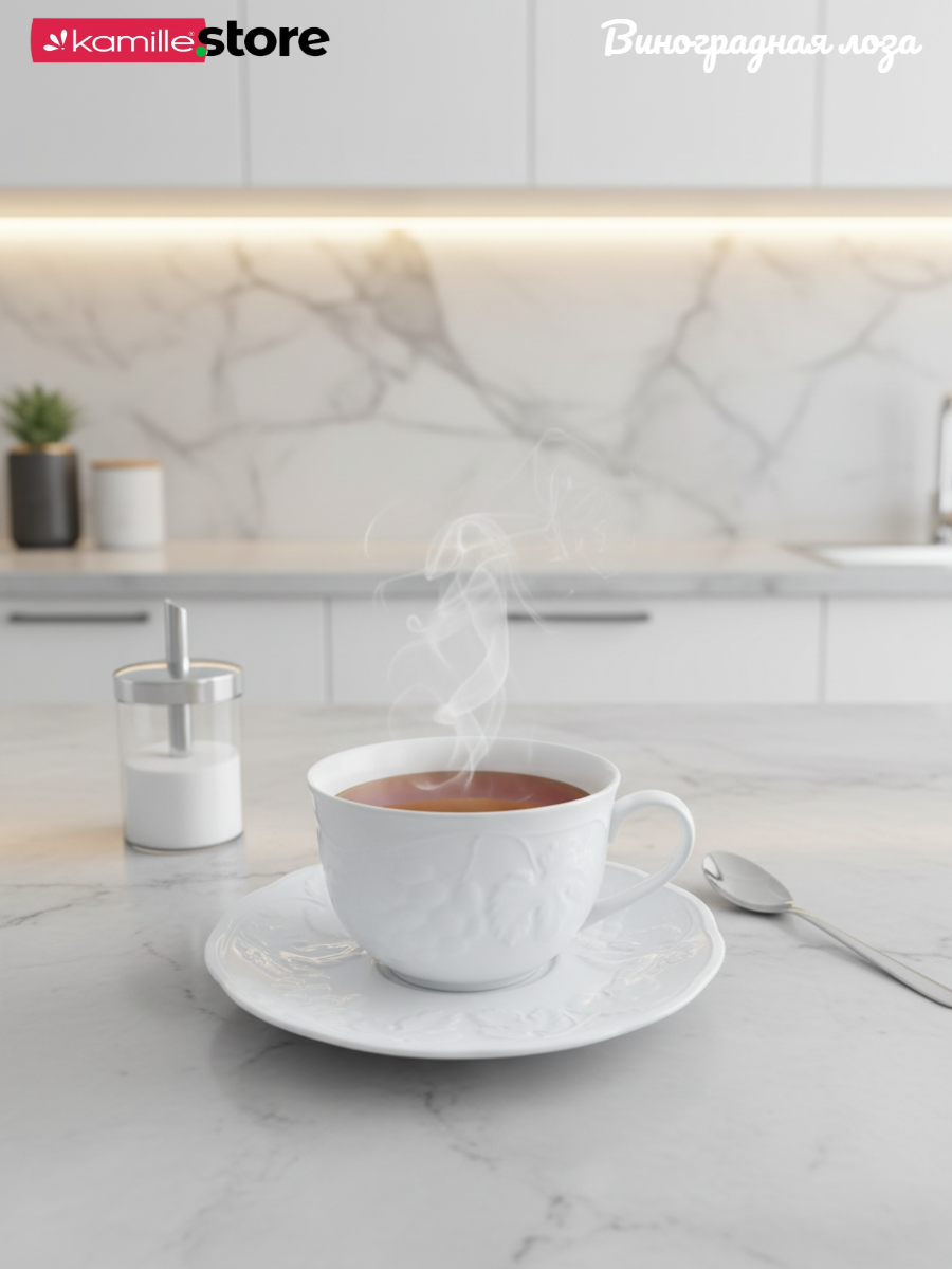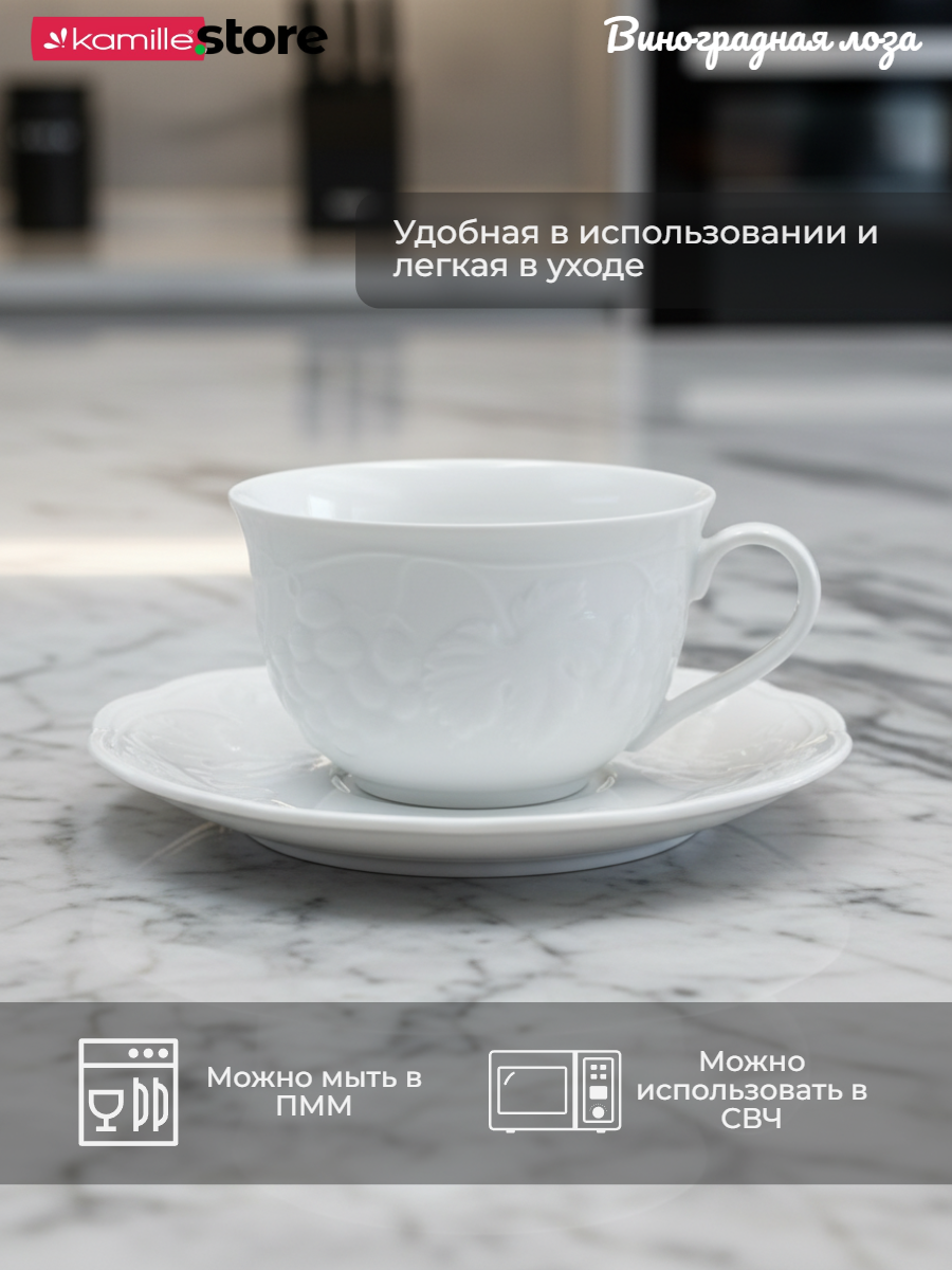 Столовая посуда серии "Виноградная лоза" - это необычная, изящная, привлекательная, белоснежная и очень практичная посуда. Все предметы из этой коллекции можно мыть в посудомоечной машине и использовать в микроволновых печах. Фарфор этой серии обладает такими характеристиками как: укрепленный край от сколов, особо прочная глазурь, минимальная пористость, практичность и долговечность. Это стильный выбор для сервировки вашего стола.