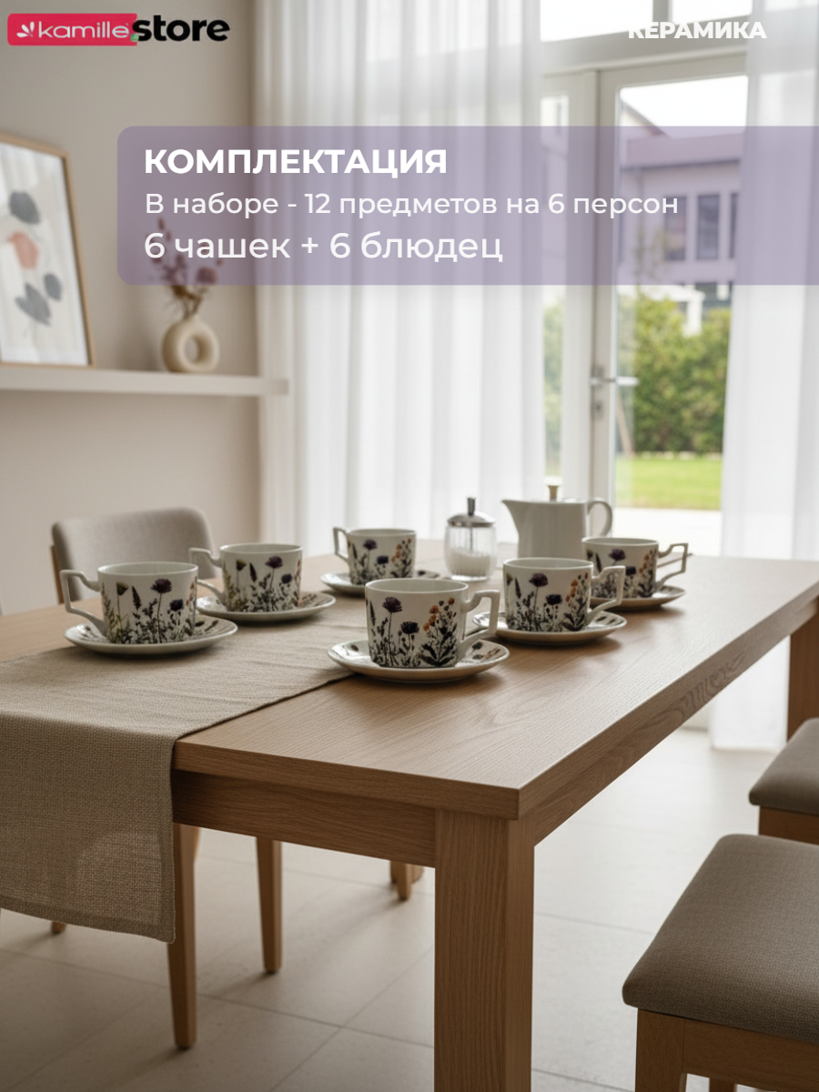 Чайный сервиз "Полевые Цветы" - это стильный и красивый набор посуды на 6 персон, который станет украшением как повседневного чаепития, так и праздничного застолья.