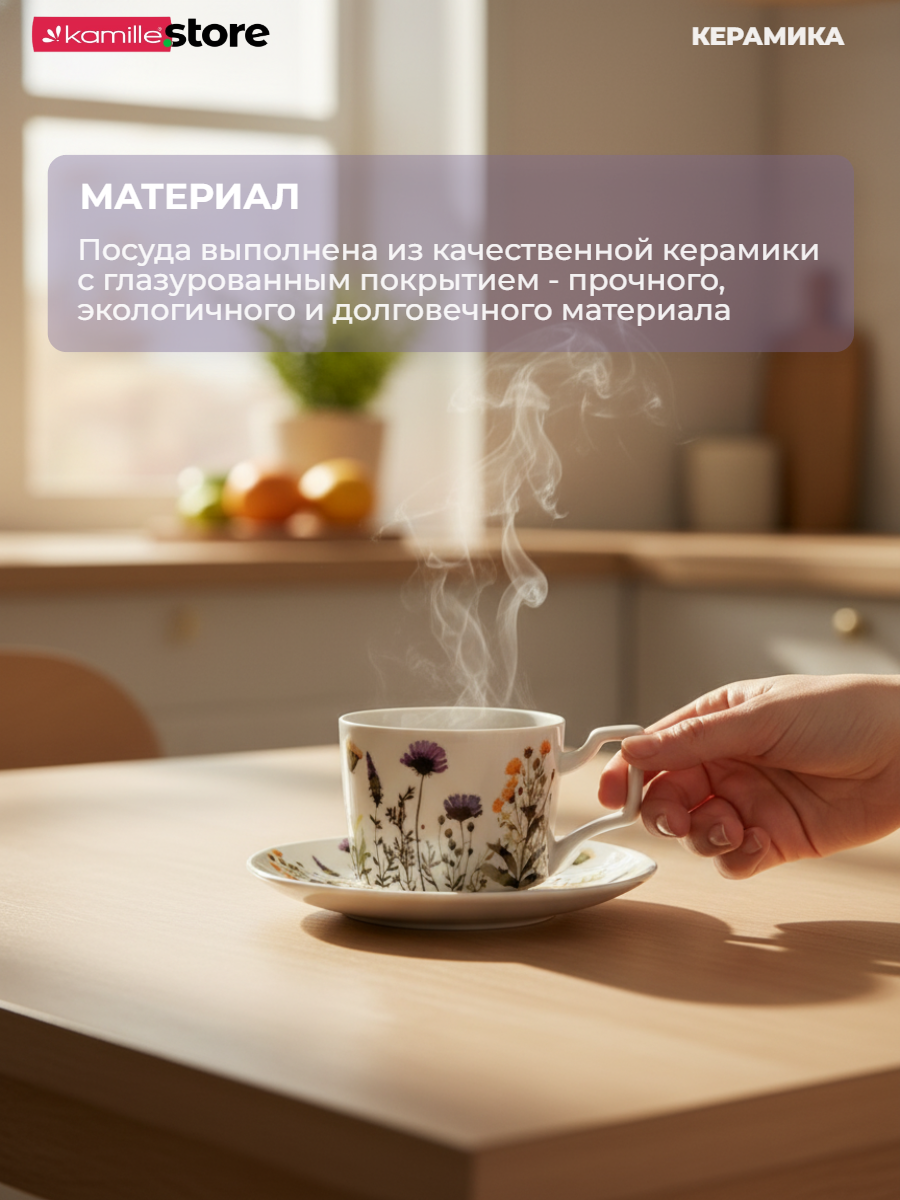 Сервиз выполнен из качественной керамики, что обеспечивает его прочность и долгий срок службы. Белый цвет и изящный рисунок "Полевые цветы" придают посуде нарядный и элегантный вид.
