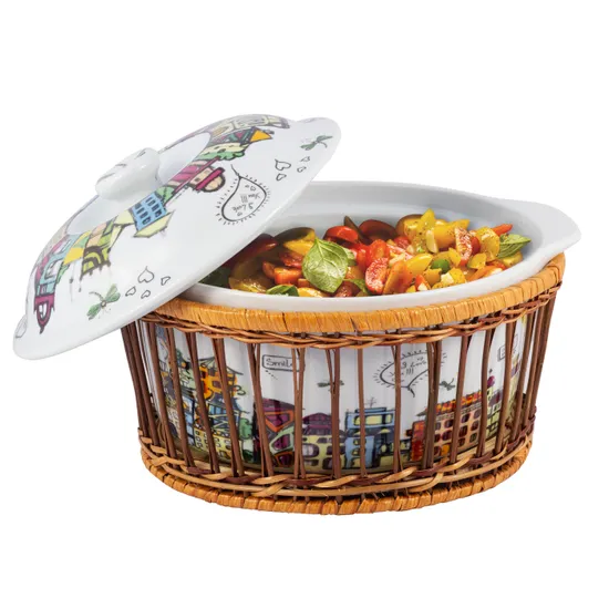 Посуда для запекания Kamille из жаропрочной керамики отличается высоким качеством и стильным дизайном. В таких формах можно не только готовить, но и подавать блюда на стол. Керамика будет сохранять тепло, а аромат пробуждать аппетит у присутствующих. Качественная глазурь и эксклюзивная деколь "города" создадут атмосферу уюта и комфорта, а ротанговая корзинка будет удобной подставкой и несомненно украсит ваш стол. Вы вспомните вкуснейшие блюда Ваших бабушек, которые готовились в керамических горшках в большой печи. Ваши близкие обязательно оценят пищу из керамической посуды.