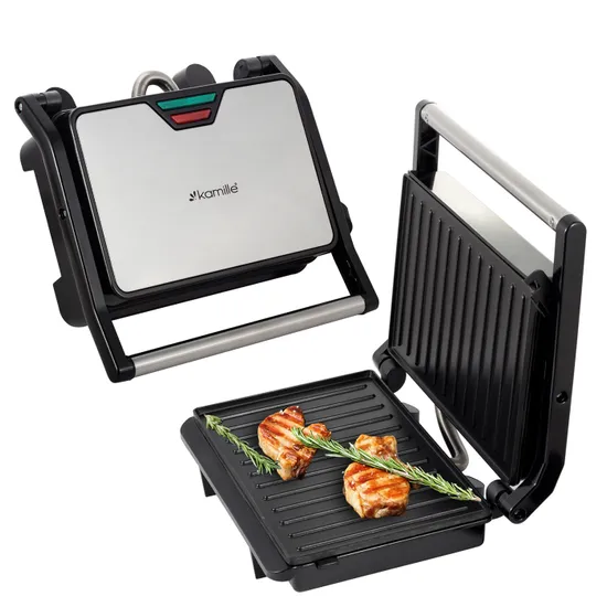 Контактный электрогриль Kamille KM 6722 это компактное и простое в использовании устройство с одним режимом работы, однако такой гриль хорошо справляется с приготовлением и станет незаменимым помощником на кухне или на даче. Он имеет две прямоугольные плиты, которые закрываются при помощи плавающих шарниров, что позволяет готовить не только мясо, но и панини, бургеры или сэндвичи, также отлично подойдет для того, чтобы поджарить овощи, котлеты или хлеб до хрустящей корочки. Модель Kamille KM 6722 оснащена лотком для сбора жира.