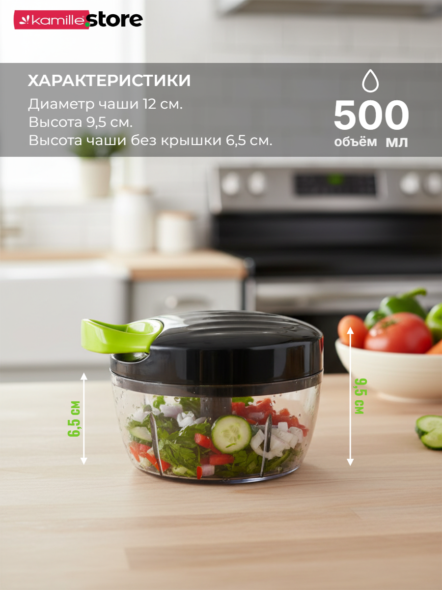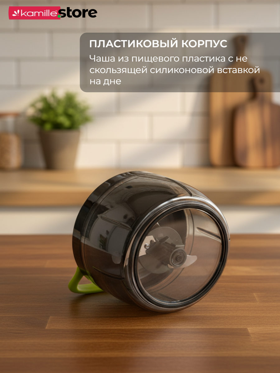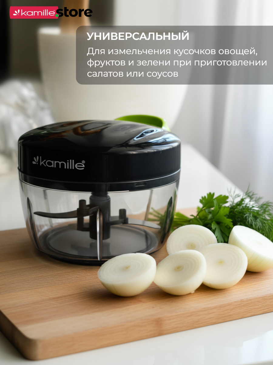 Ручной механический измельчитель Kamille обладает вместительной емкостью из прозрачного пластика, что позволяет визуально контролировать степень помола ингредиентов, и нескользящей силиконовой накладкой на дне которая не позволит измельчителю выскользнуть из рук. Лезвия изготовлены из нержавеющей стали и характеризуются высокой стойкостью к изнашиванию и коррозии. Модель оптимально подходит для измельчения кусочков овощей, фруктов, зелени, лука, чеснока при приготовлении салатов, соусов и заправок. Крышка с пазами для фиксации плотно закрывает контейнер, что исключает брызги и открывание при работе. Устройство не потребляет электроэнергии, поэтому может быть использовано во время отдыха на природе или на даче. Прочный шнур не разорвется и с легкостью выдержит интенсивное использование.