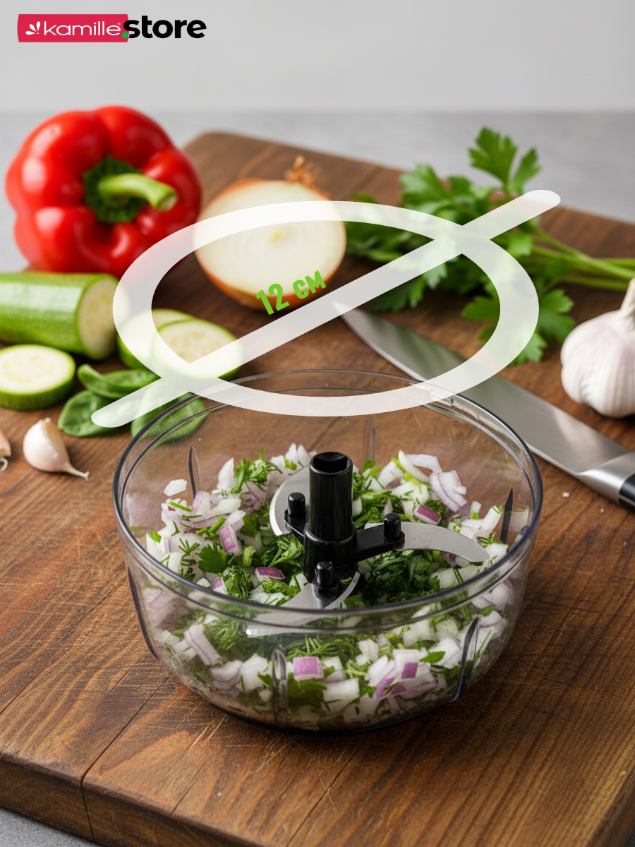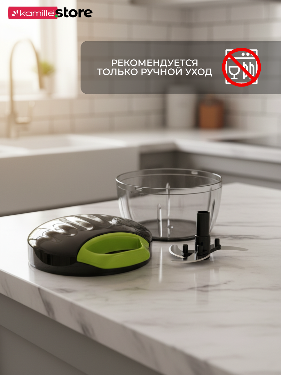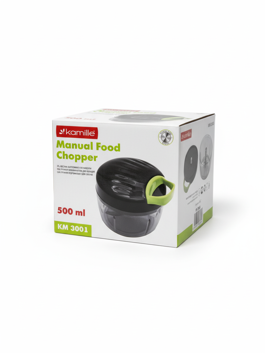 Ручной механический измельчитель Kamille обладает вместительной емкостью из прозрачного пластика, что позволяет визуально контролировать степень помола ингредиентов, и нескользящей силиконовой накладкой на дне которая не позволит измельчителю выскользнуть из рук. Лезвия изготовлены из нержавеющей стали и характеризуются высокой стойкостью к изнашиванию и коррозии. Модель оптимально подходит для измельчения кусочков овощей, фруктов, зелени, лука, чеснока при приготовлении салатов, соусов и заправок. Крышка с пазами для фиксации плотно закрывает контейнер, что исключает брызги и открывание при работе. Устройство не потребляет электроэнергии, поэтому может быть использовано во время отдыха на природе или на даче. Прочный шнур не разорвется и с легкостью выдержит интенсивное использование.