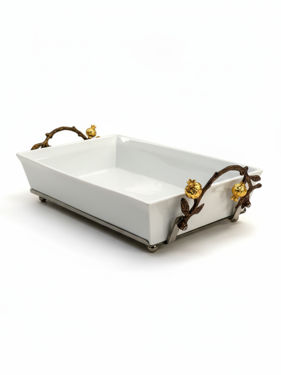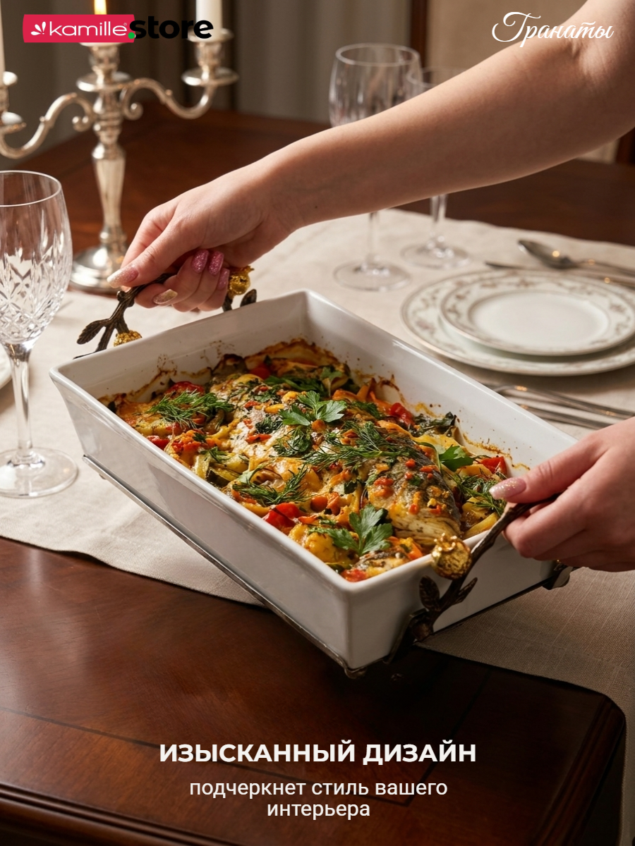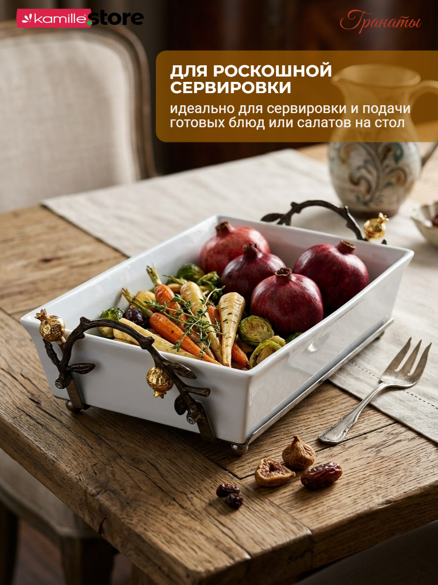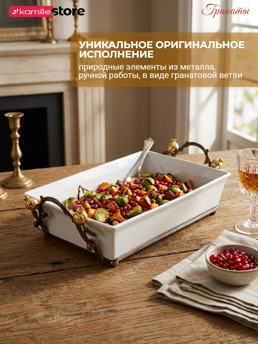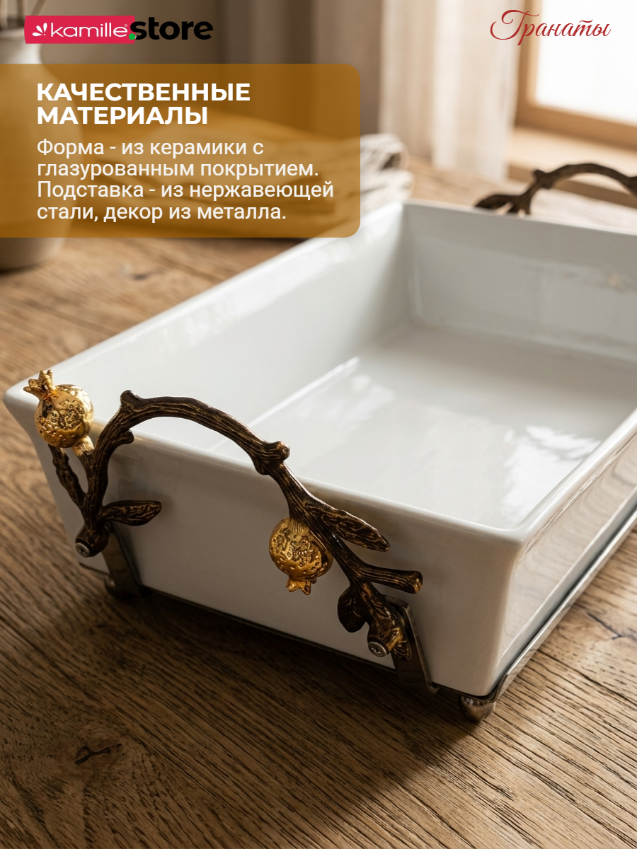 Представляем вашему вниманию стильный и яркий, притягивающей взгляд, набор - форма для запекания на подставке - качественная керамика с глазурованным покрытием, металлическая подставка с декором ручной работы в виде гранатовой ветви, гарантированно никого не оставят равнодушными.