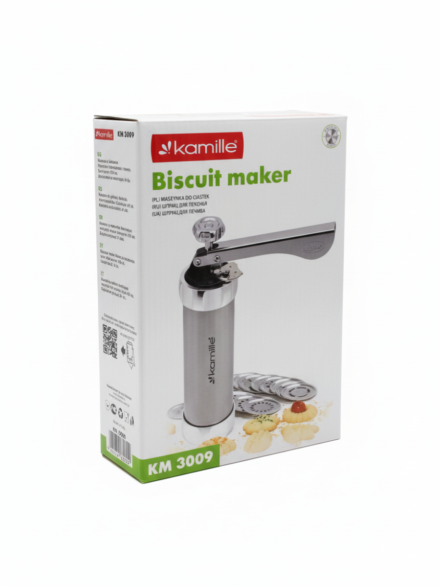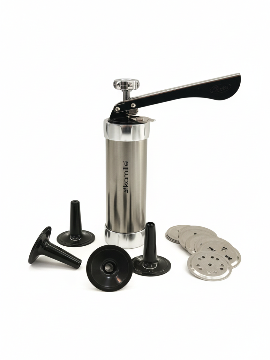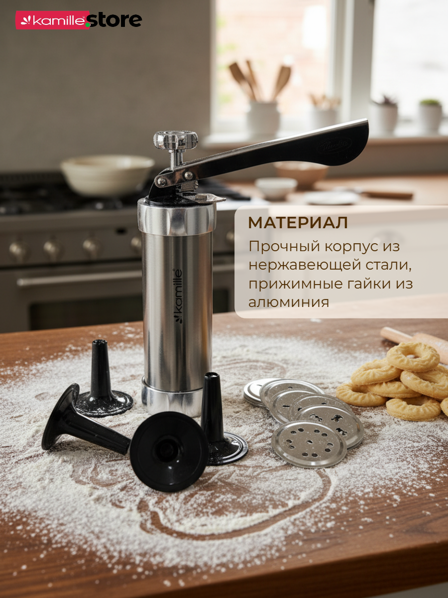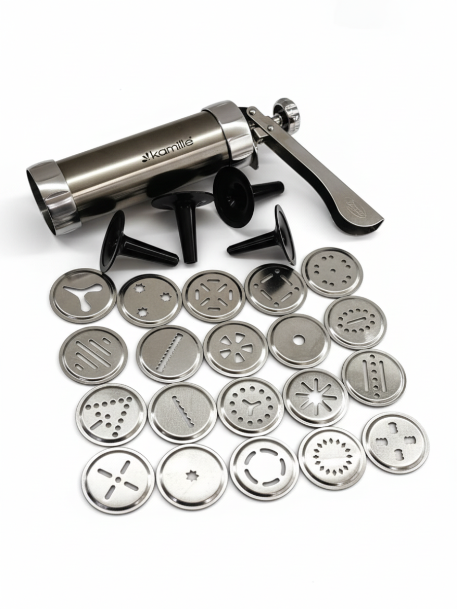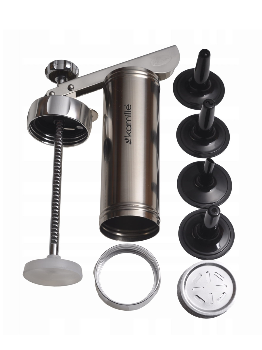 Шприц для печенья из нержавеющей стали Kamille поможет Вам быстро и легко сделать вкусное домашнее печенье, разнообразной формы.