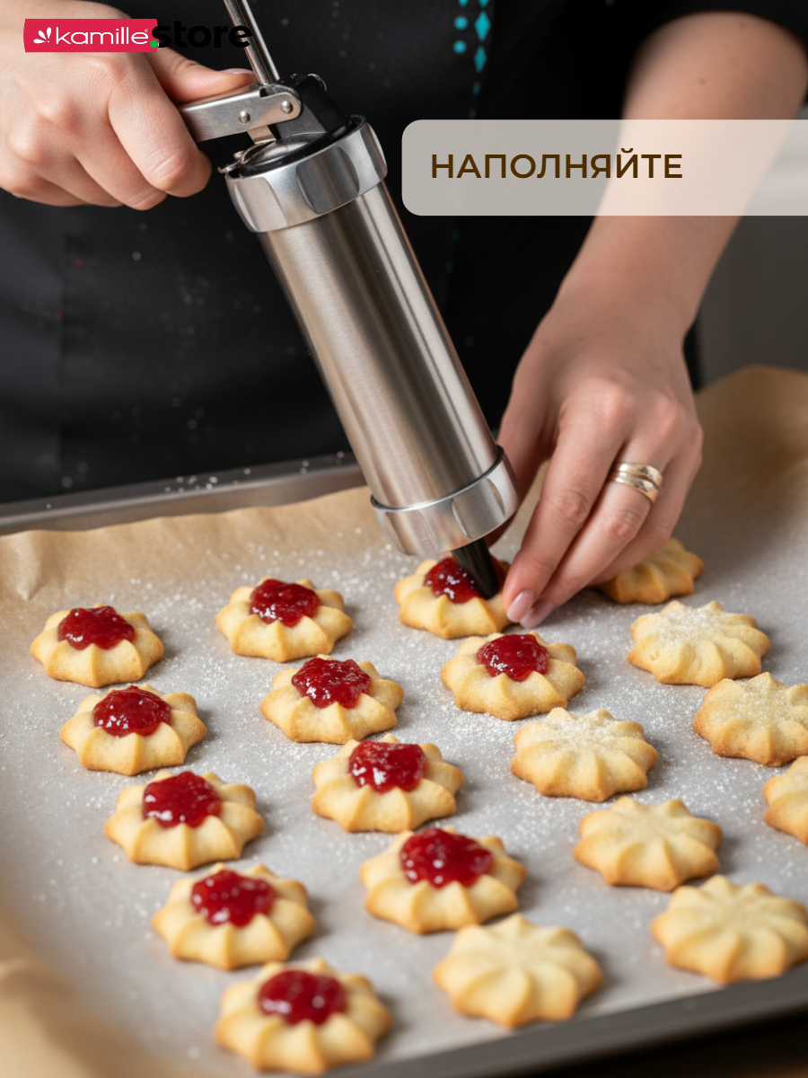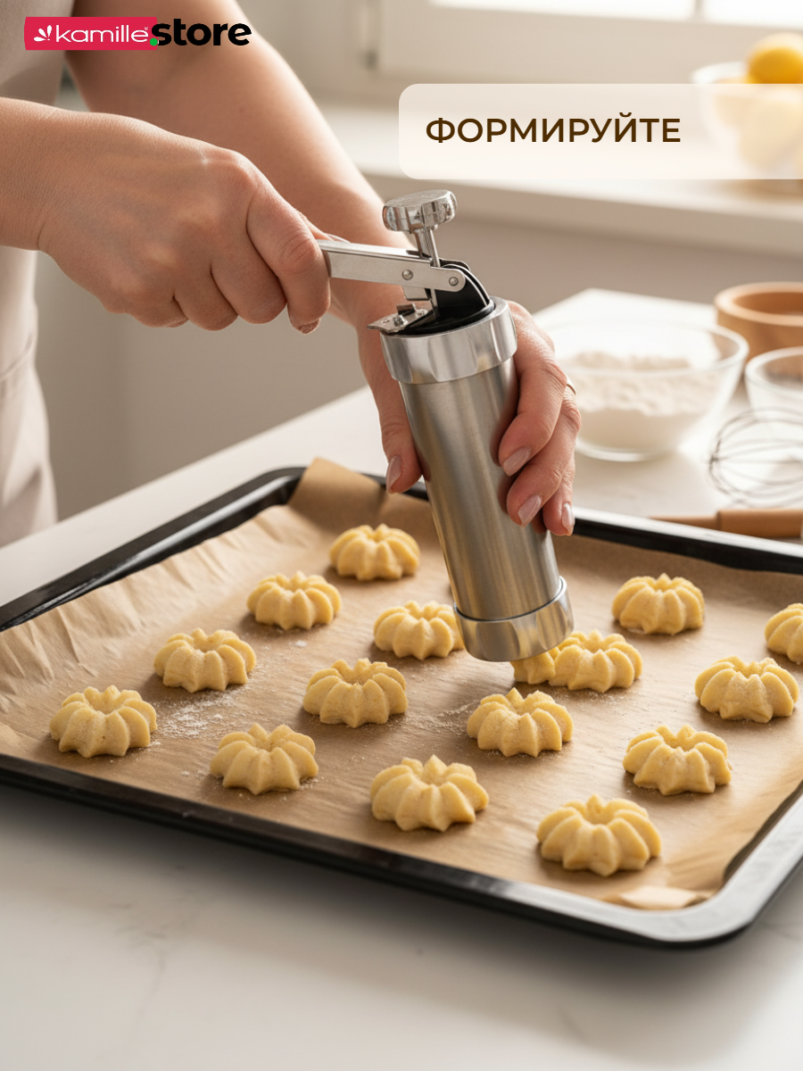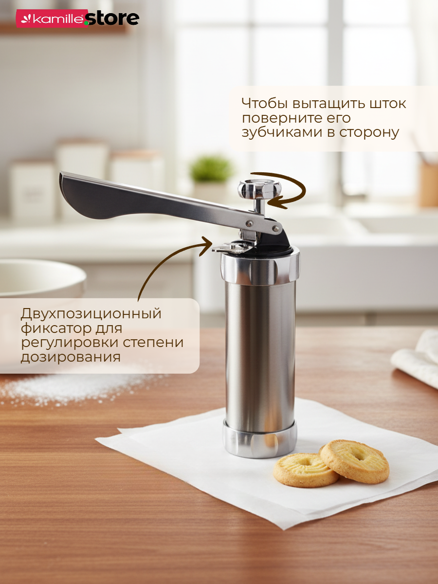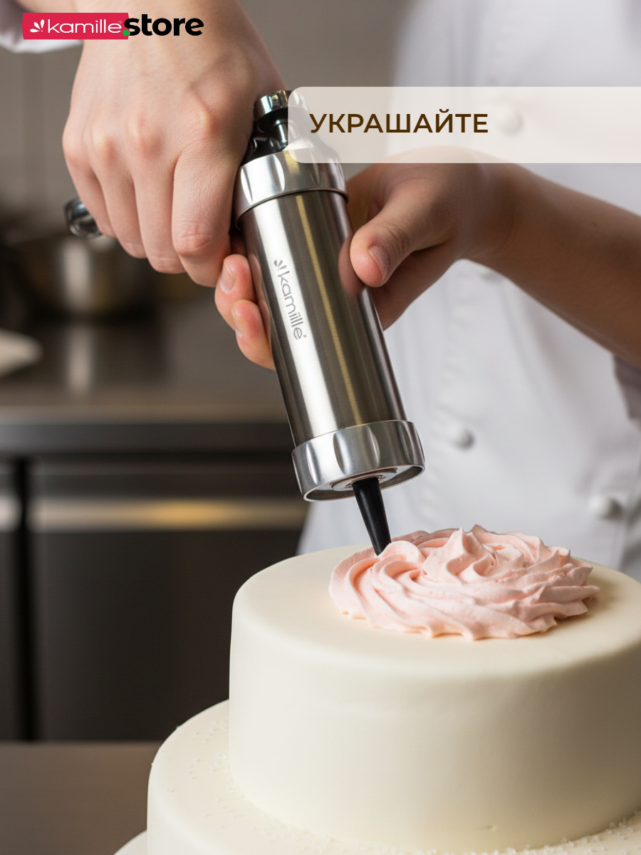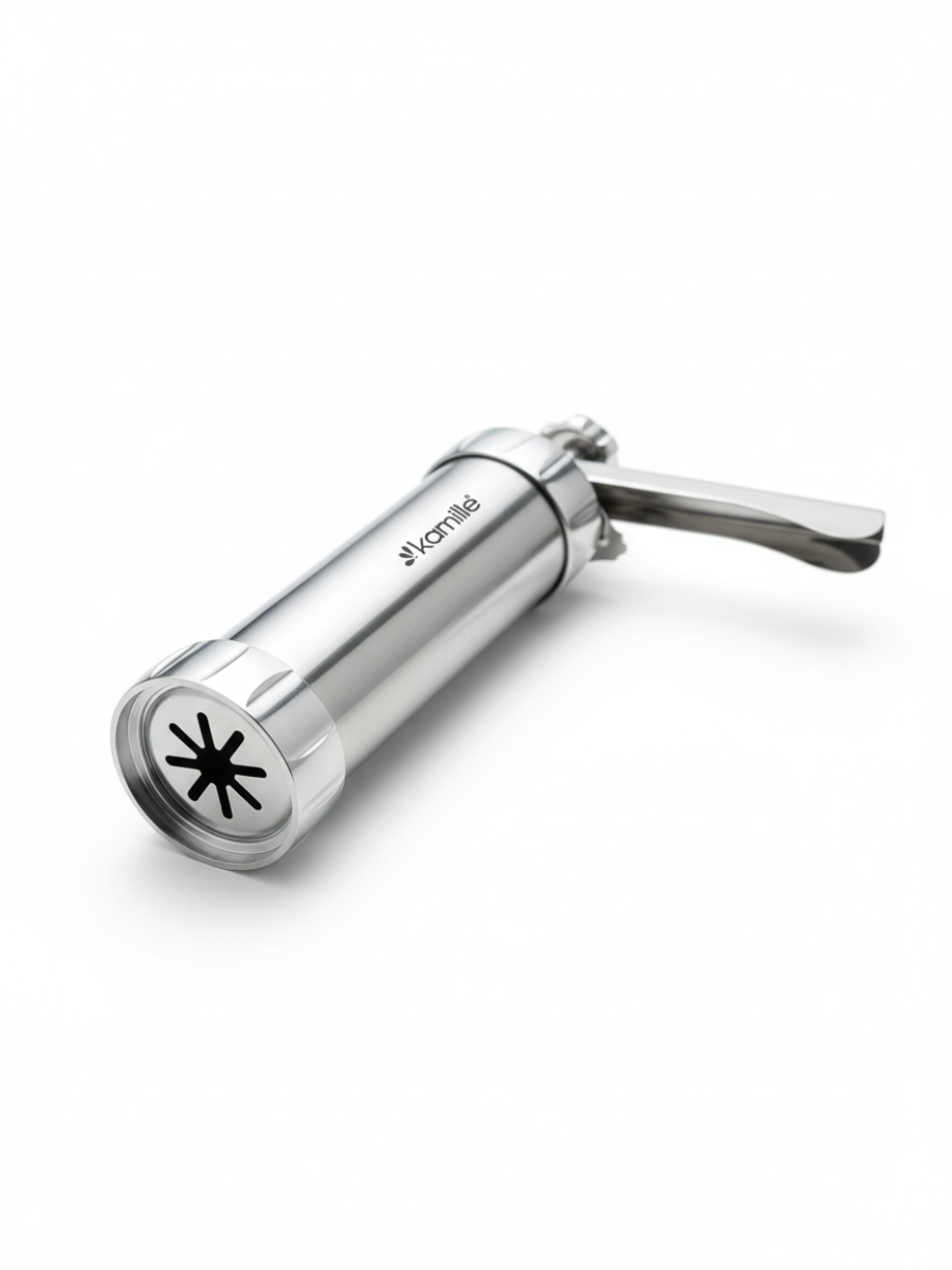 Шприц для печенья из нержавеющей стали Kamille поможет Вам быстро и легко сделать вкусное домашнее печенье, разнообразной формы.