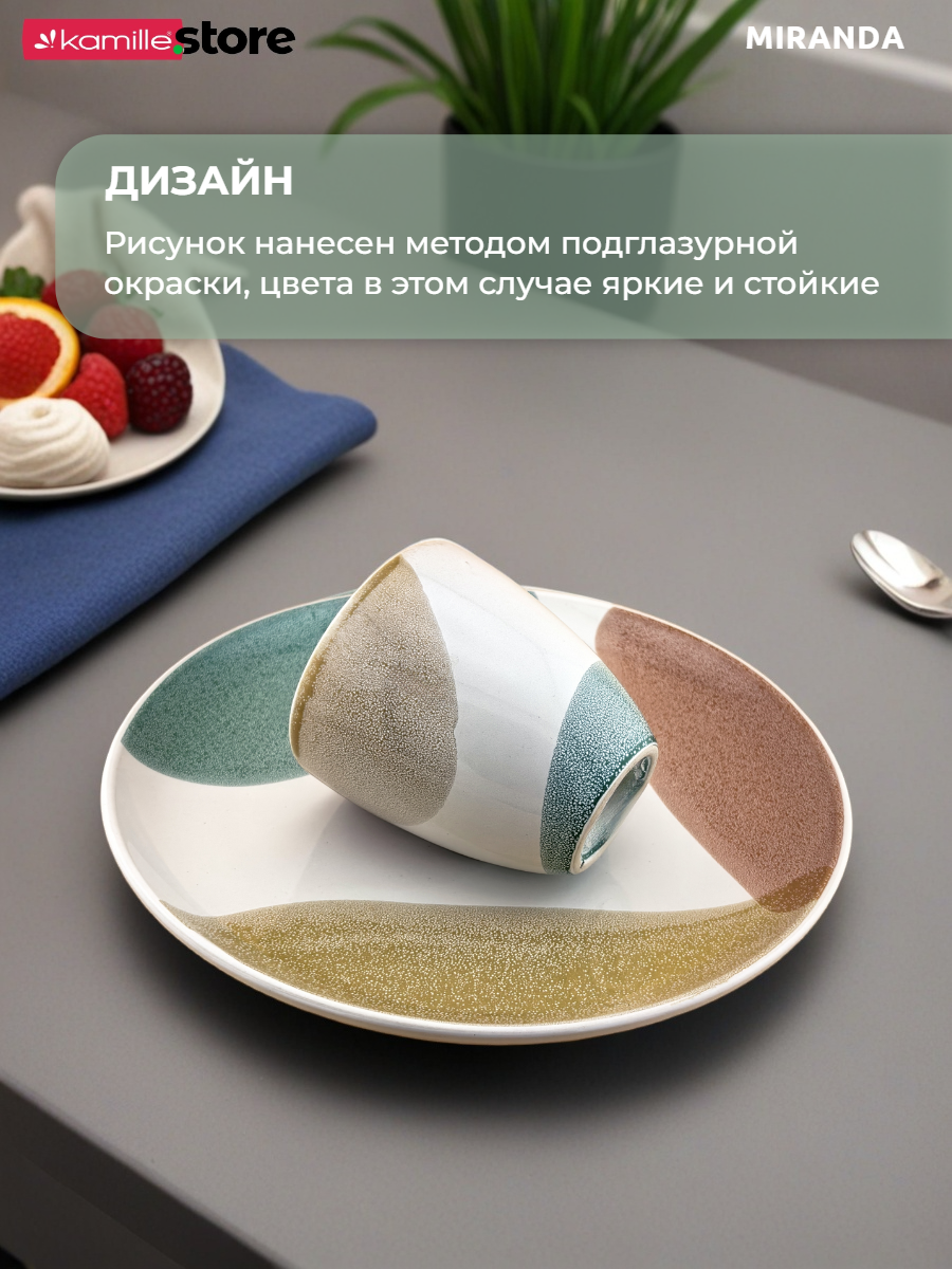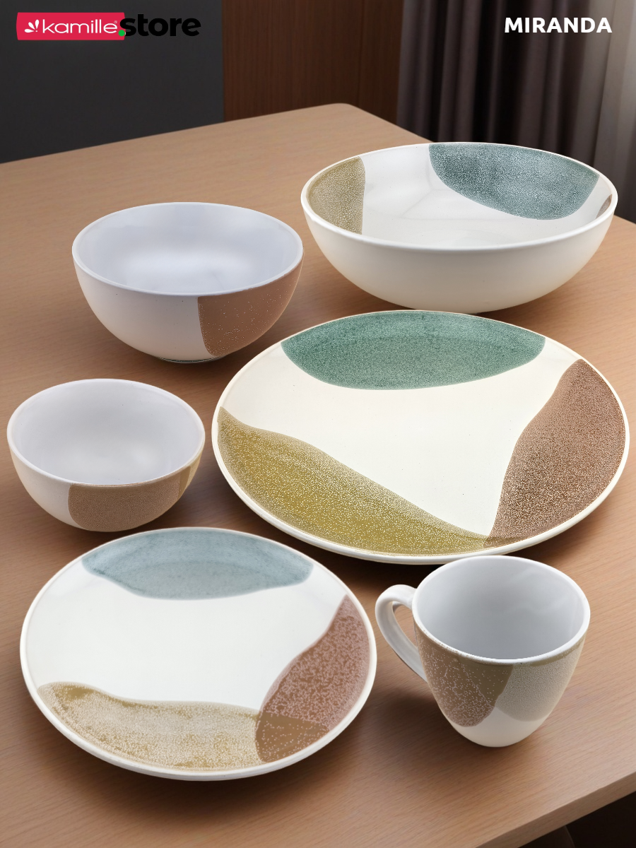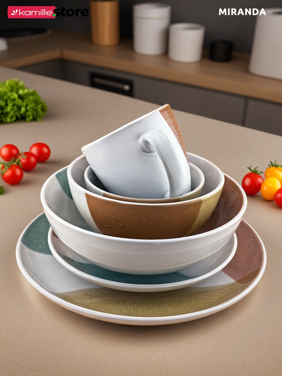 Столовый обеденный сервиз из коллекции MIRANDA - это яркая, качественная, привлекательная и очень практичная посуда. Все изделия изготовлены по технологии высокотемпературного обжига из качественной керамики, рисунок нанесен методом подглазурной окраски, цвета в этом случае яркие и более стойкие, в сочетании с прочной глянцевой глазурью посуда прослужит вам не один год.