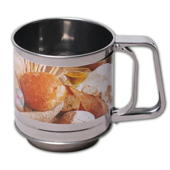 Кружка-сито Kamille – отличное приспособление для просеивания муки и других сыпучих продуктов. Кружка-сито выполнена из высококачественной нержавеющей стали и оснащена двойным ситовым дном и специальной ручкой, внутри которой находится пружинка, благодаря чему Вы сможете просеивать нужный Вам продукт с помощью легких нажатий.
