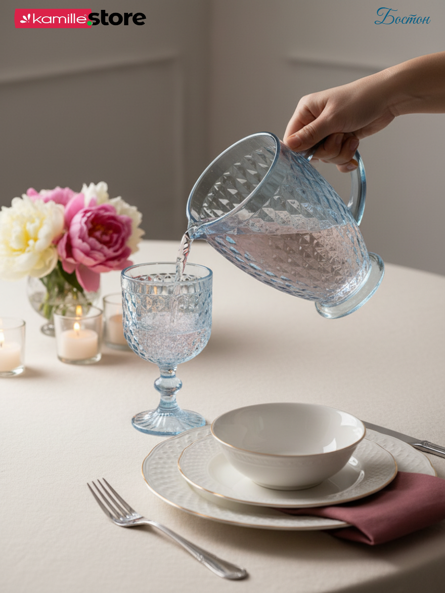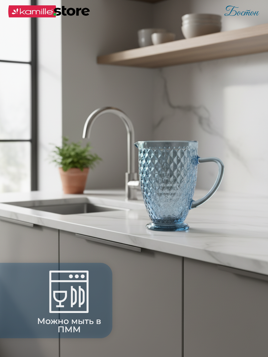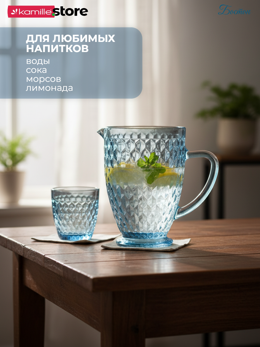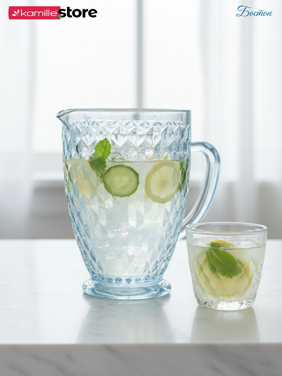 Стеклянный кувшин на ножке объемом 1,1 литра представляет собой стильный и функциональный аксессуар, выполнен в классическом дизайне, который очарует вас сиянием алмазных граней, и доставит удовольствие при повседневном использовании и праздничной сервировке.