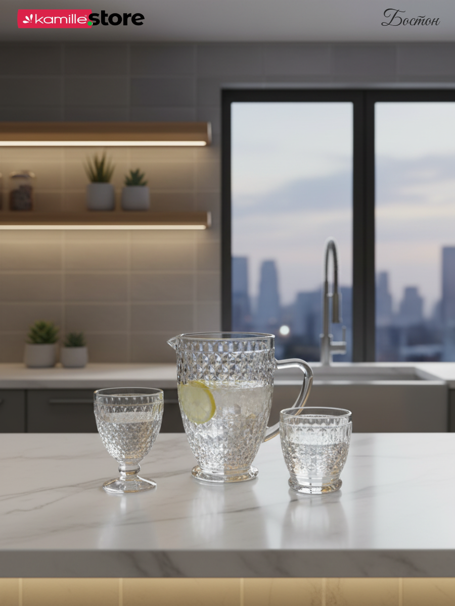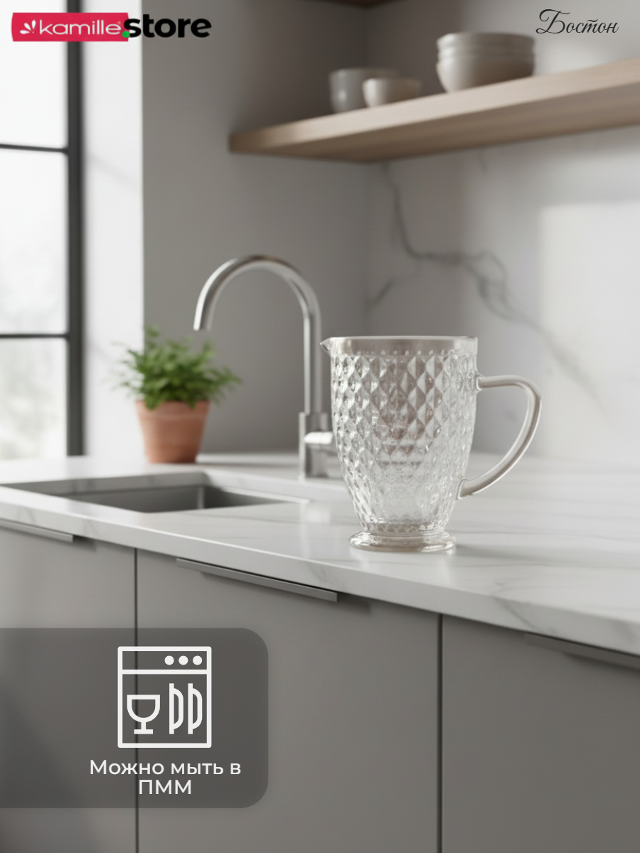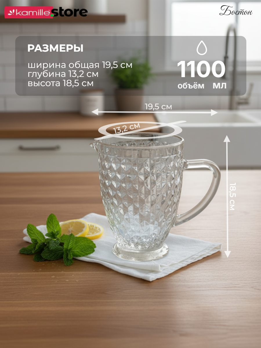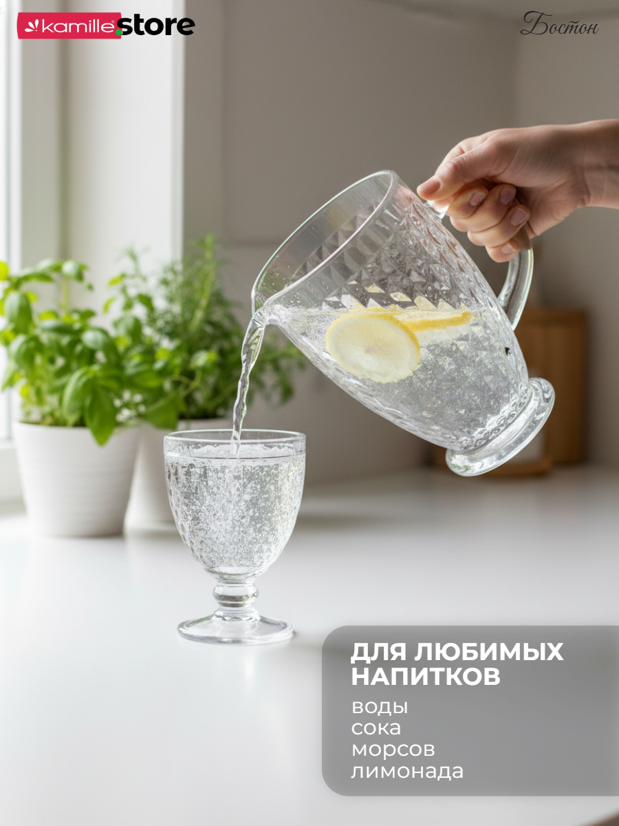 Стеклянный кувшин на ножке объемом 1,1 литра представляет собой стильный и функциональный аксессуар, выполнен в классическом дизайне, который очарует вас сиянием алмазных граней, и доставит удовольствие при повседневном использовании и праздничной сервировке.