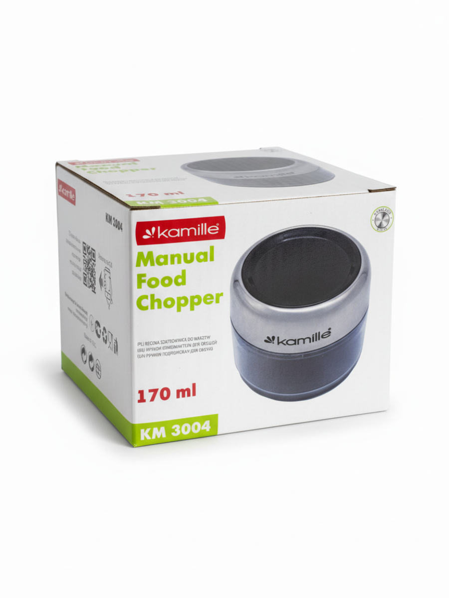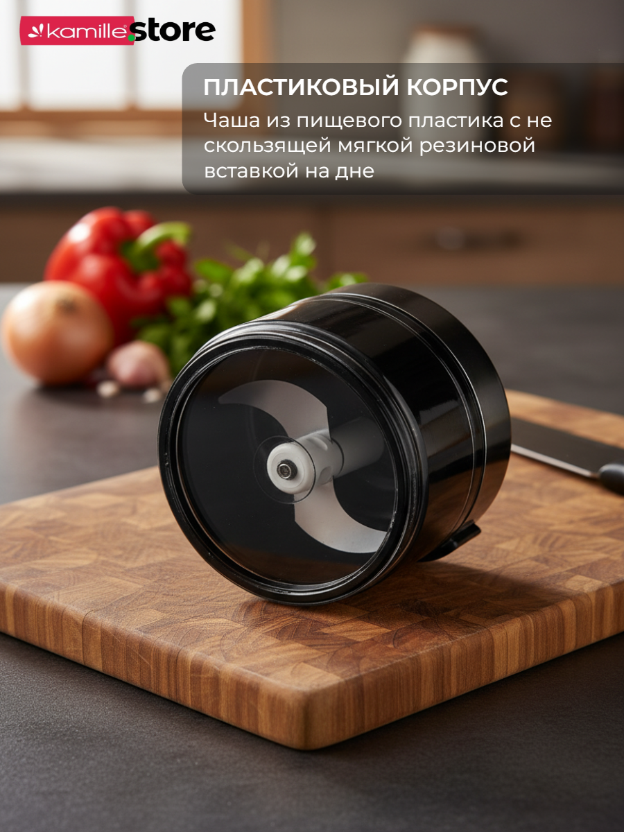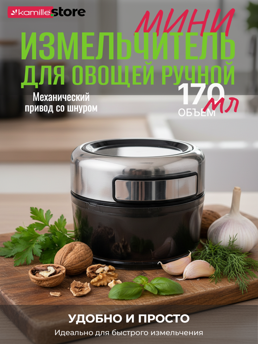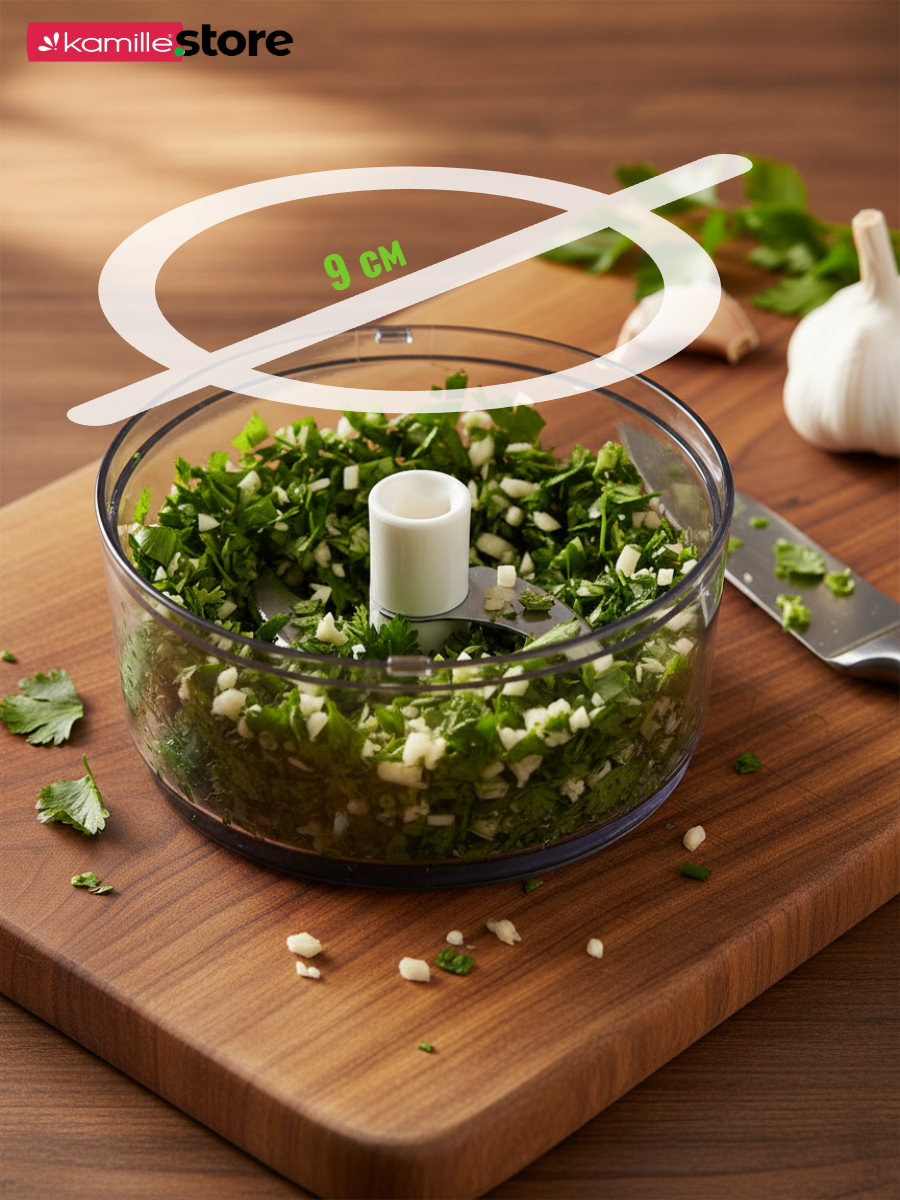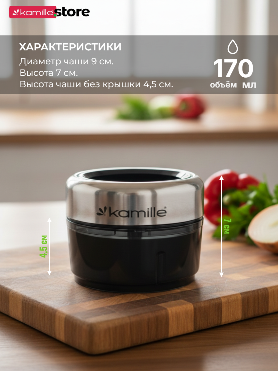 Ручной механический измельчитель Kamille обладает стильным дизайном со вставкой из нержавеющей стали, компактными размерами и удобной конструкцией, на дне чаши есть нескользящая резиновая накладка которая не позволит измельчителю скользить по рабочей поверхности во время использования. Лезвия изготовлены из нержавеющей стали и характеризуются высокой стойкостью к изнашиванию и коррозии. Модель оптимально подходит для измельчения небольших кусочков овощей, зелени, лука, чеснока, орехов, ягод при приготовлении салатов, соусов и заправок. Крышка с пазами для фиксации плотно закрывает контейнер, что исключает брызги и открывание при работе. Устройство не потребляет электроэнергии, поэтому может быть использовано во время отдыха на природе или на даче. Прочный шнур не разорвется и с легкостью выдержит интенсивное использование.