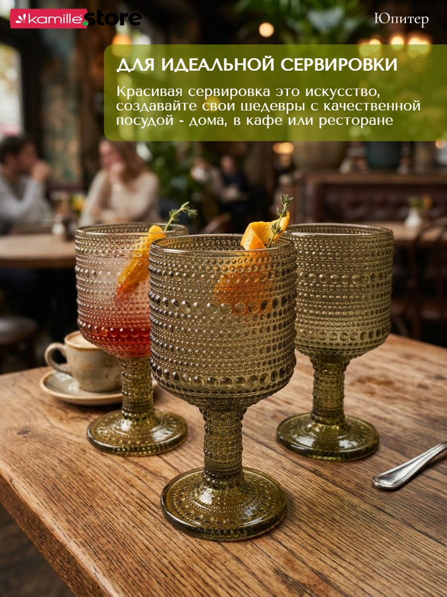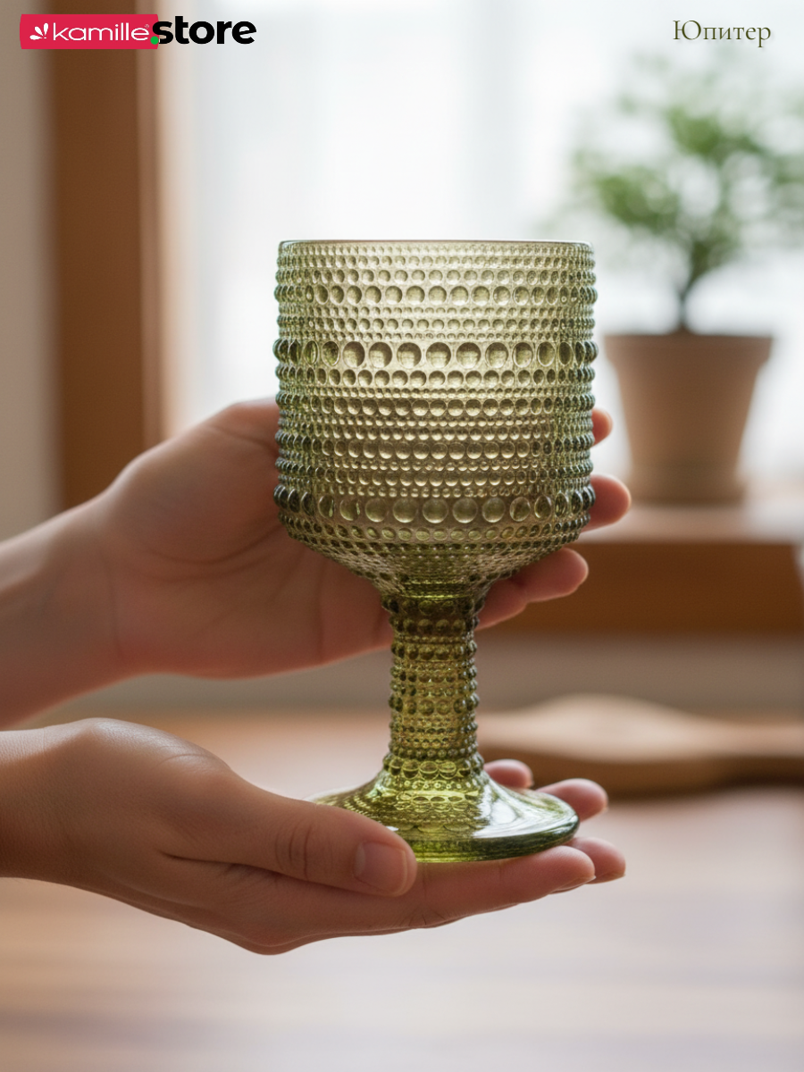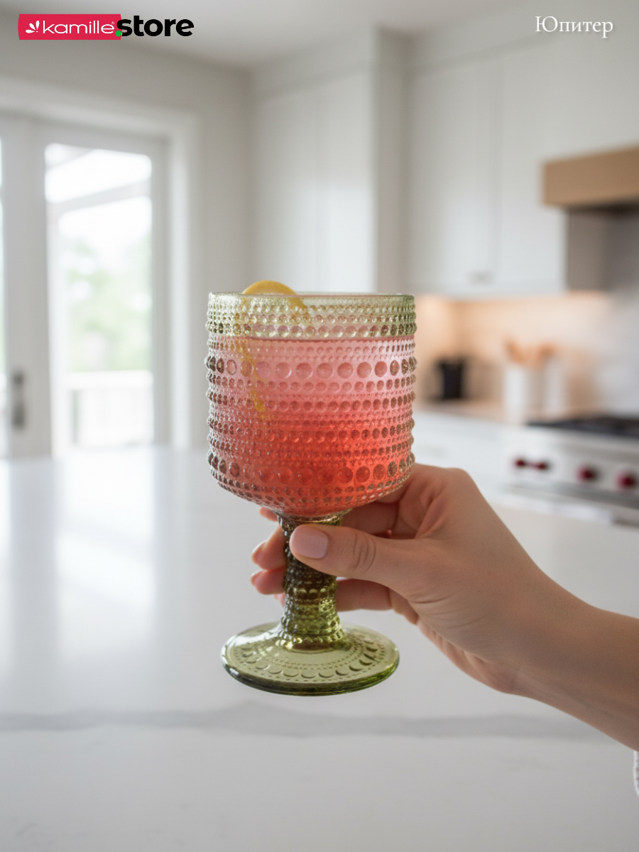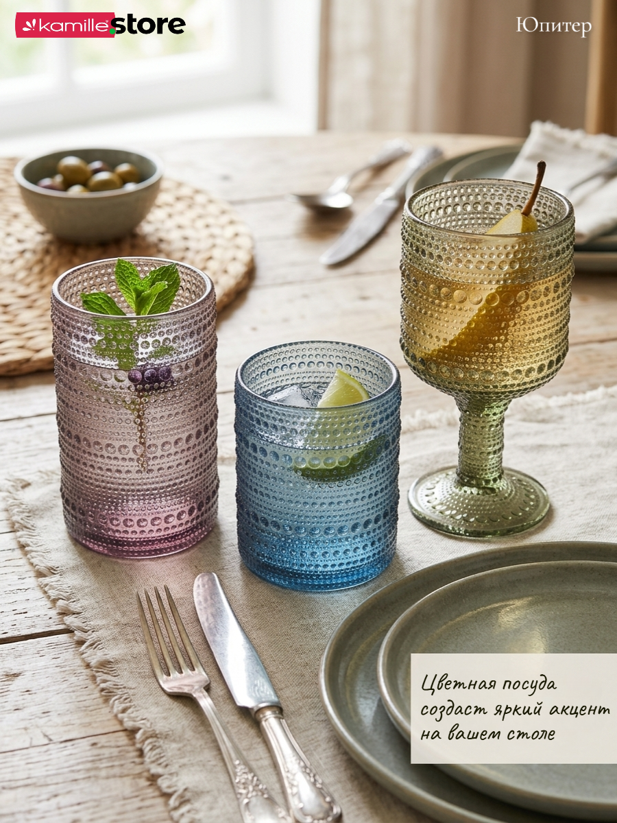 - Цветное стекло и рельефная отделка на поверхности бокалов придает им уникальный и привлекательный вид.
