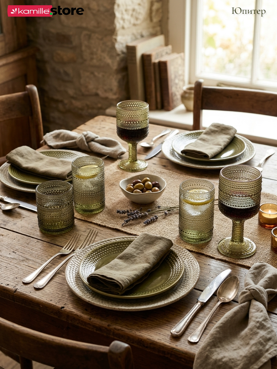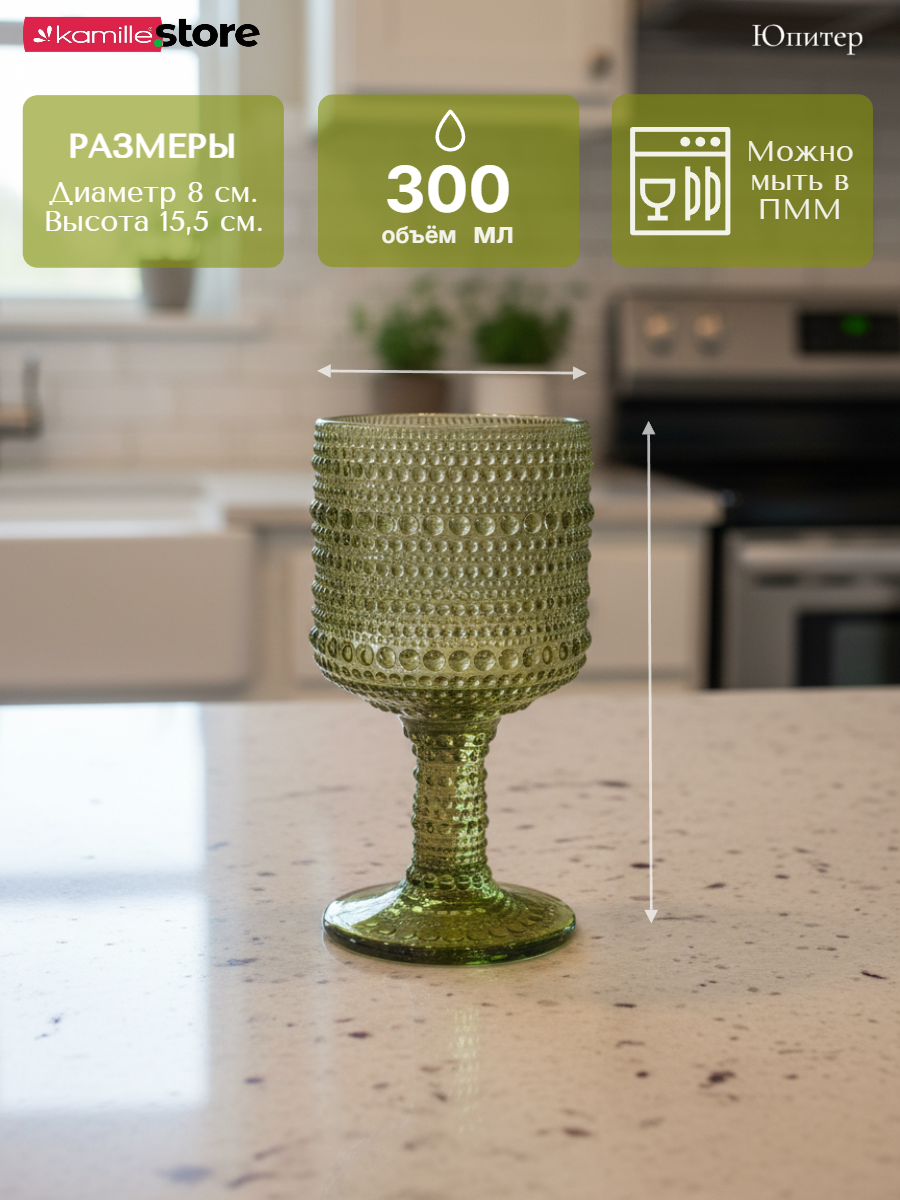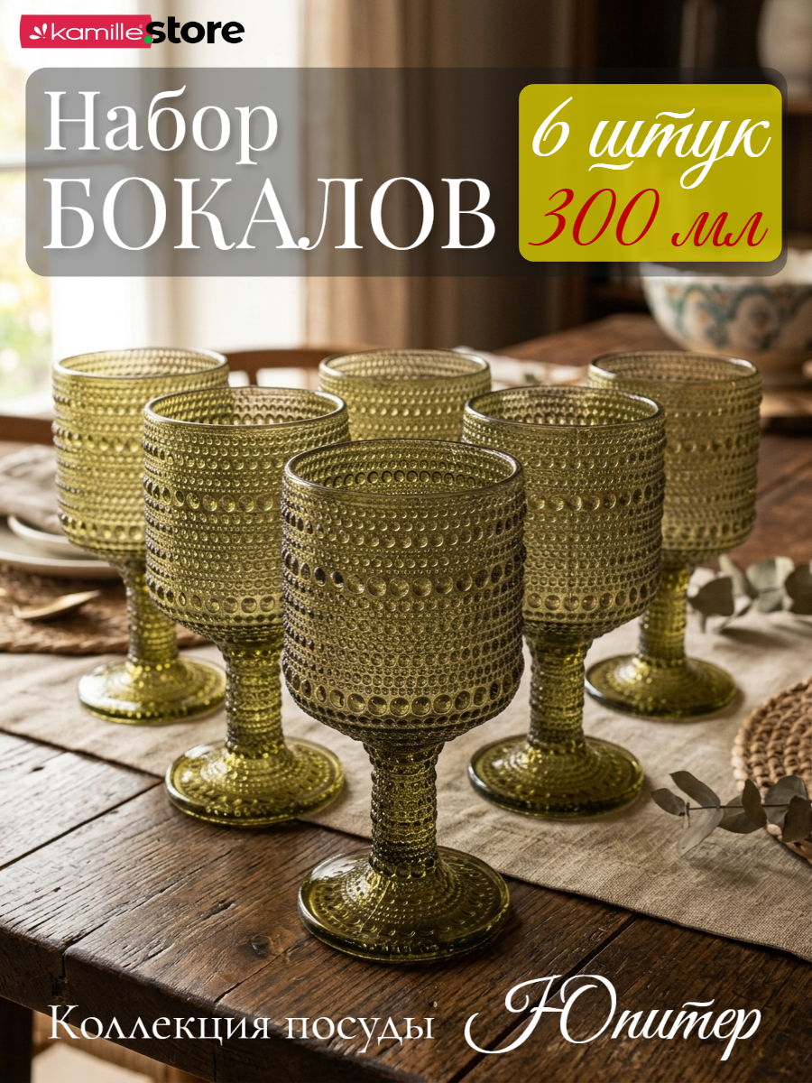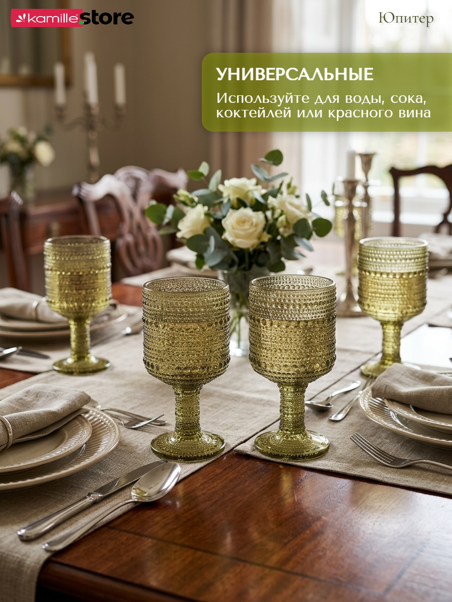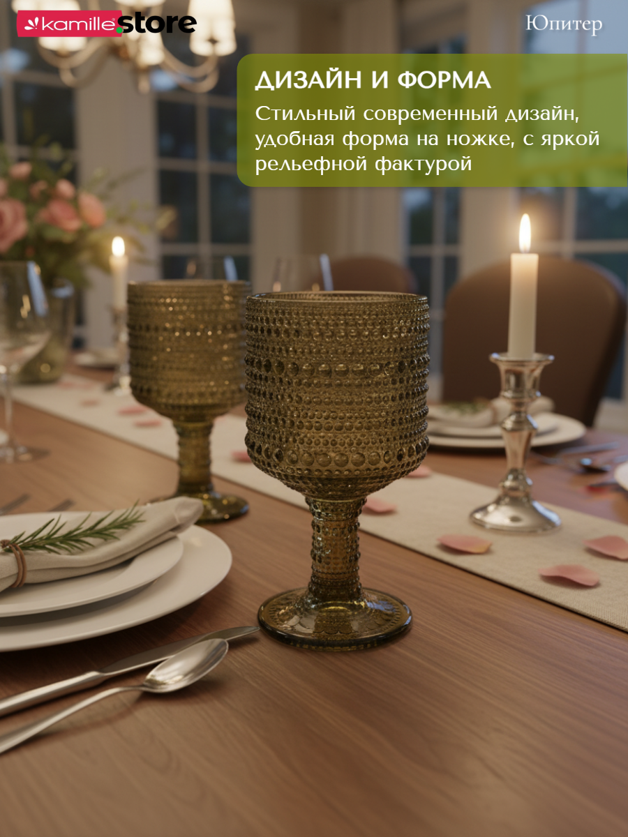 - Цветное стекло и рельефная отделка на поверхности бокалов придает им уникальный и привлекательный вид.