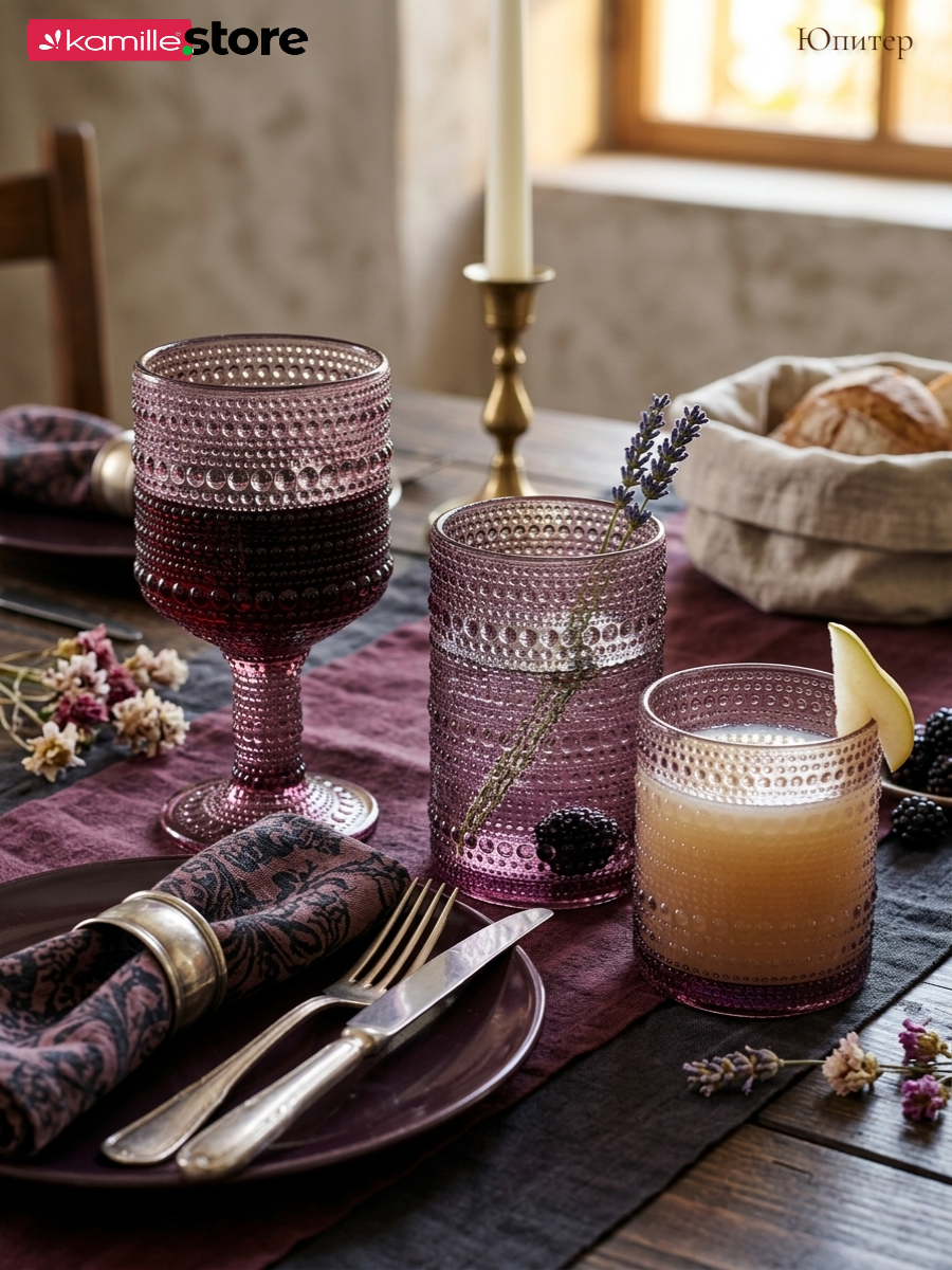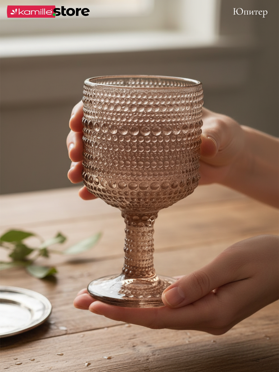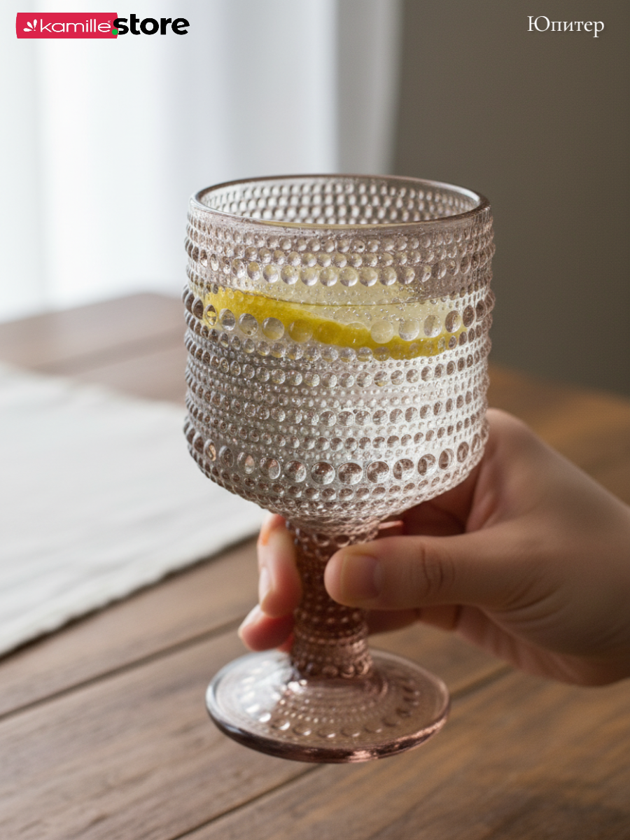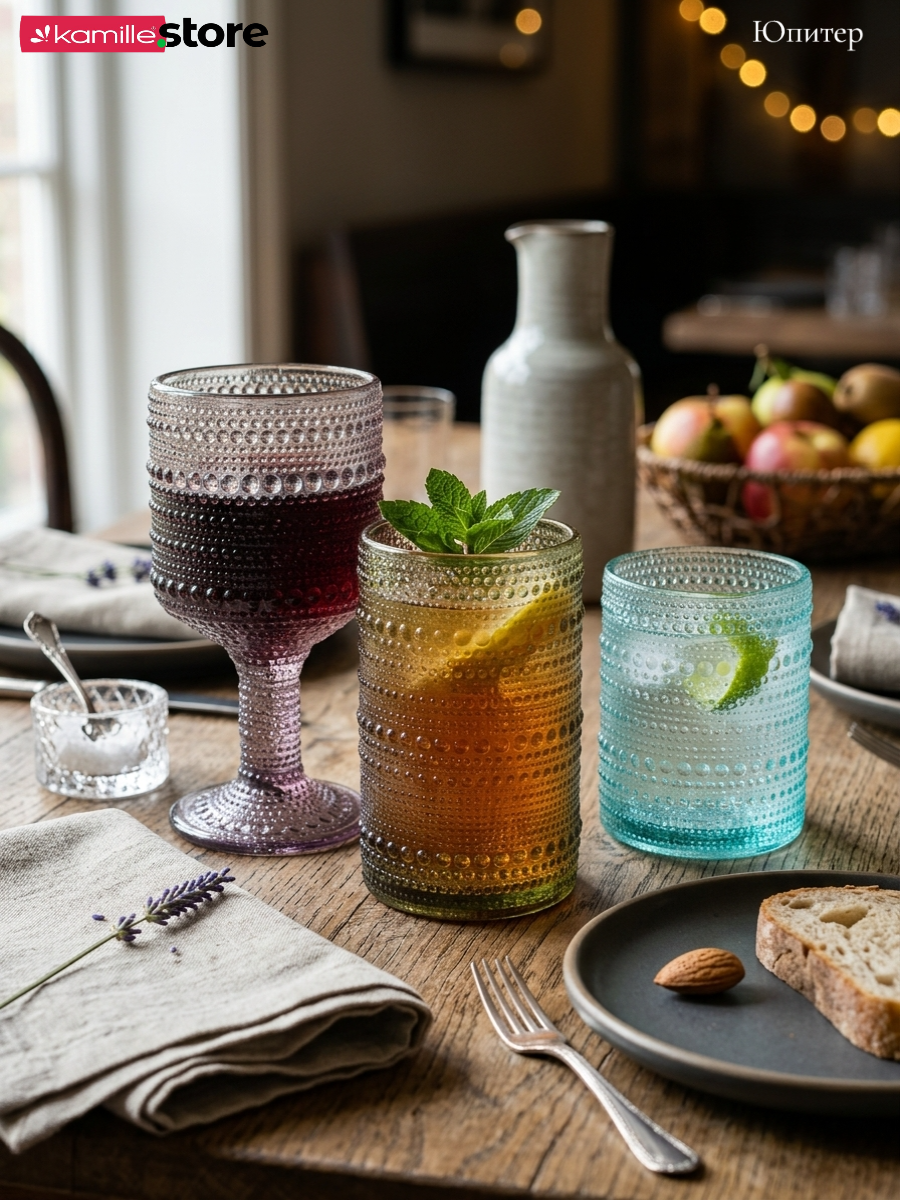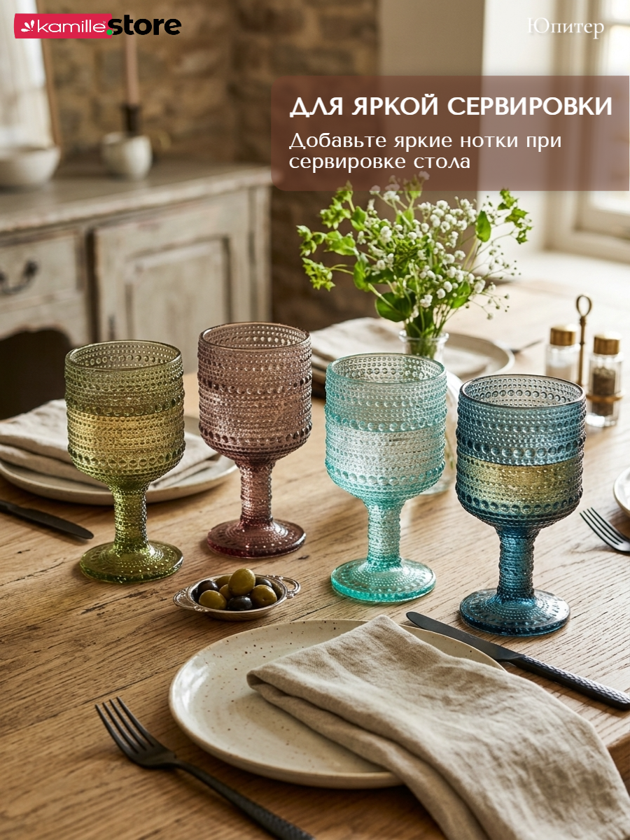 - Цветное стекло и рельефная отделка на поверхности бокалов придает им уникальный и привлекательный вид.