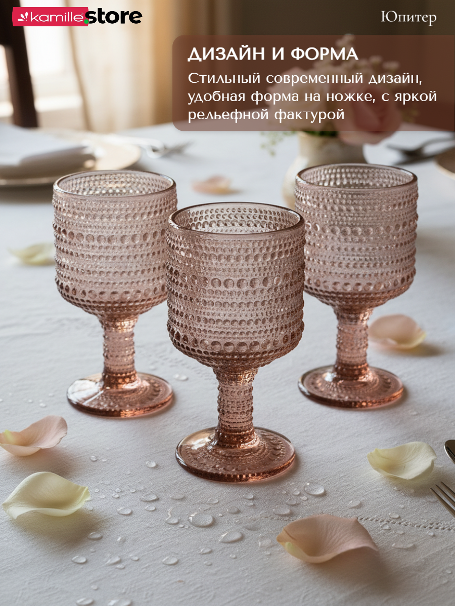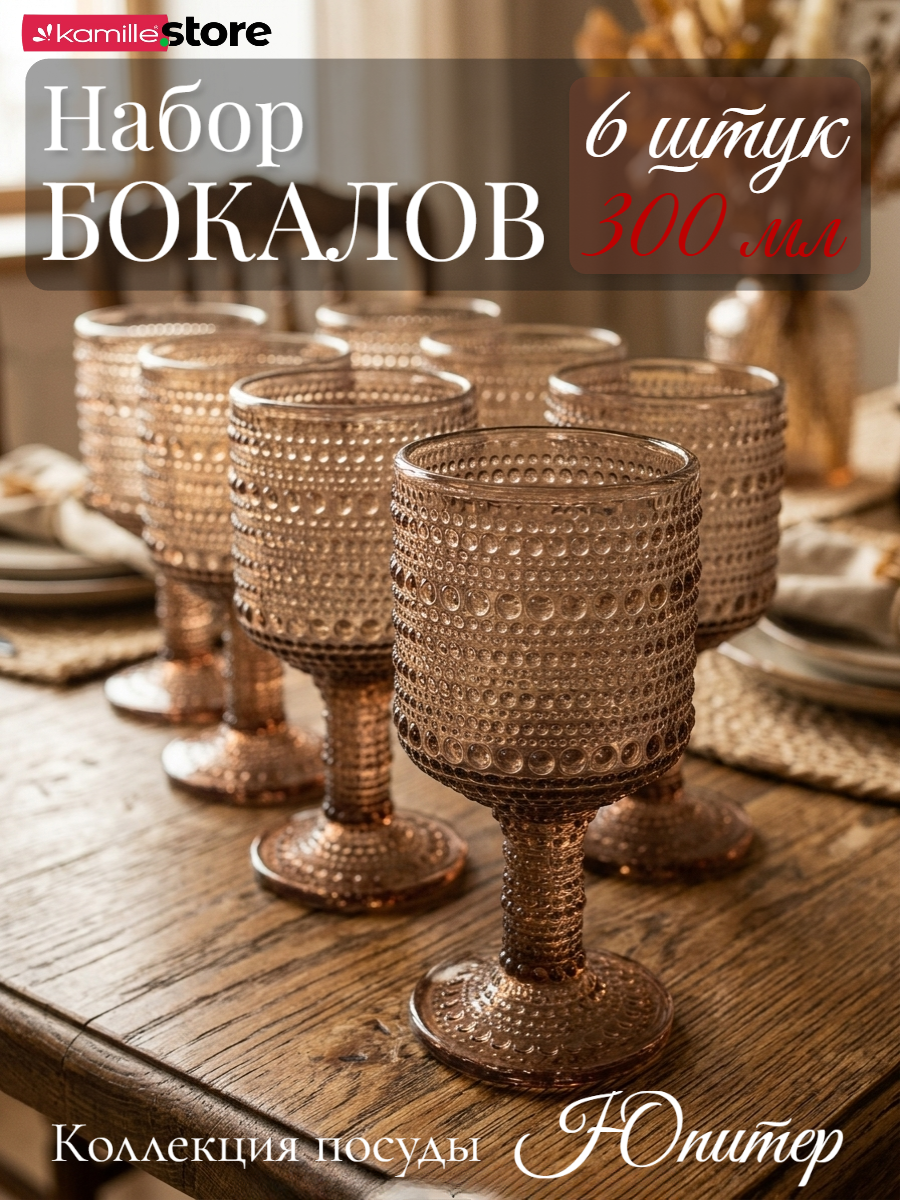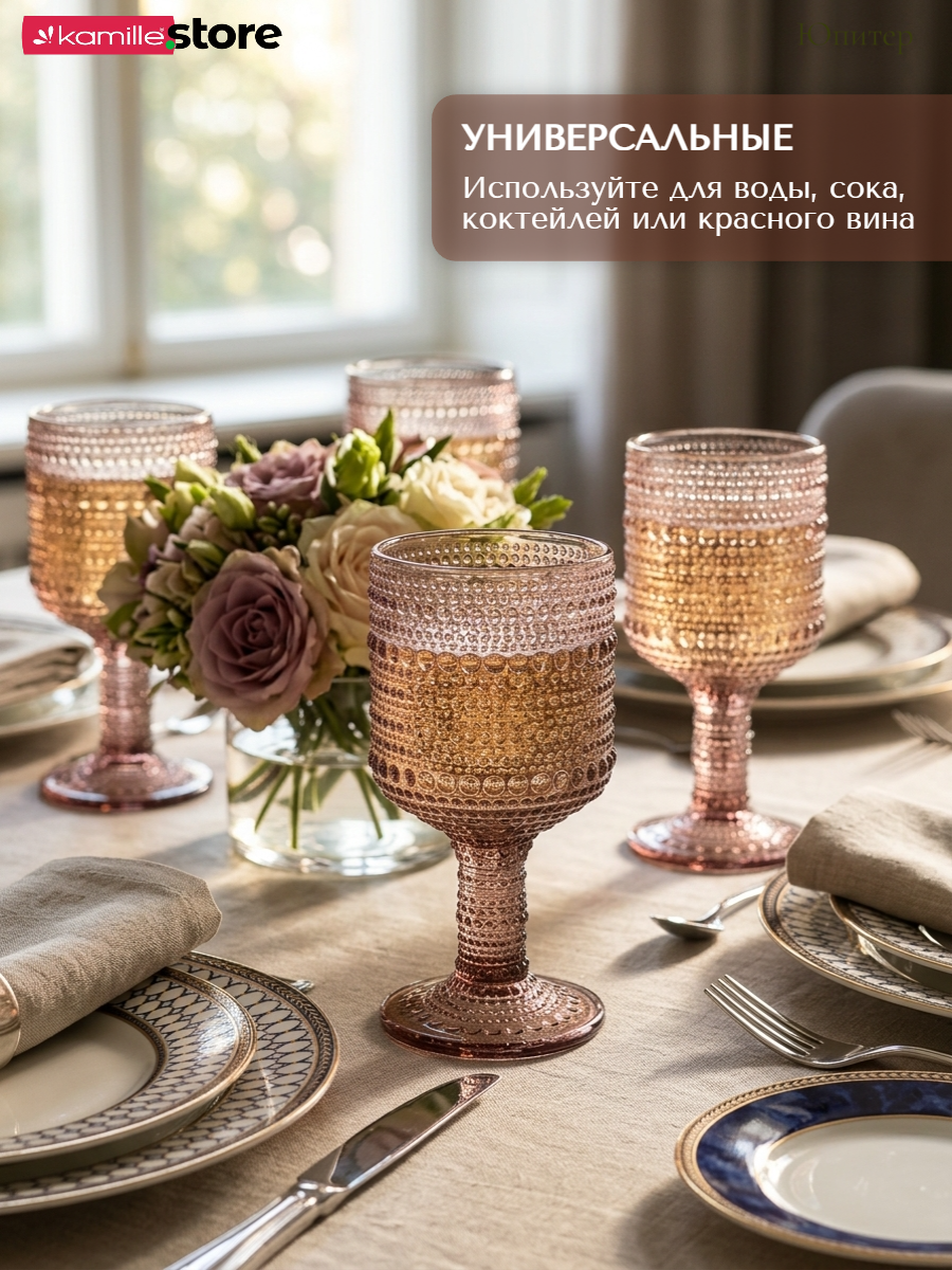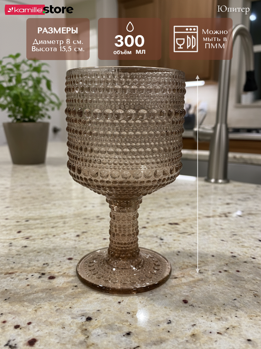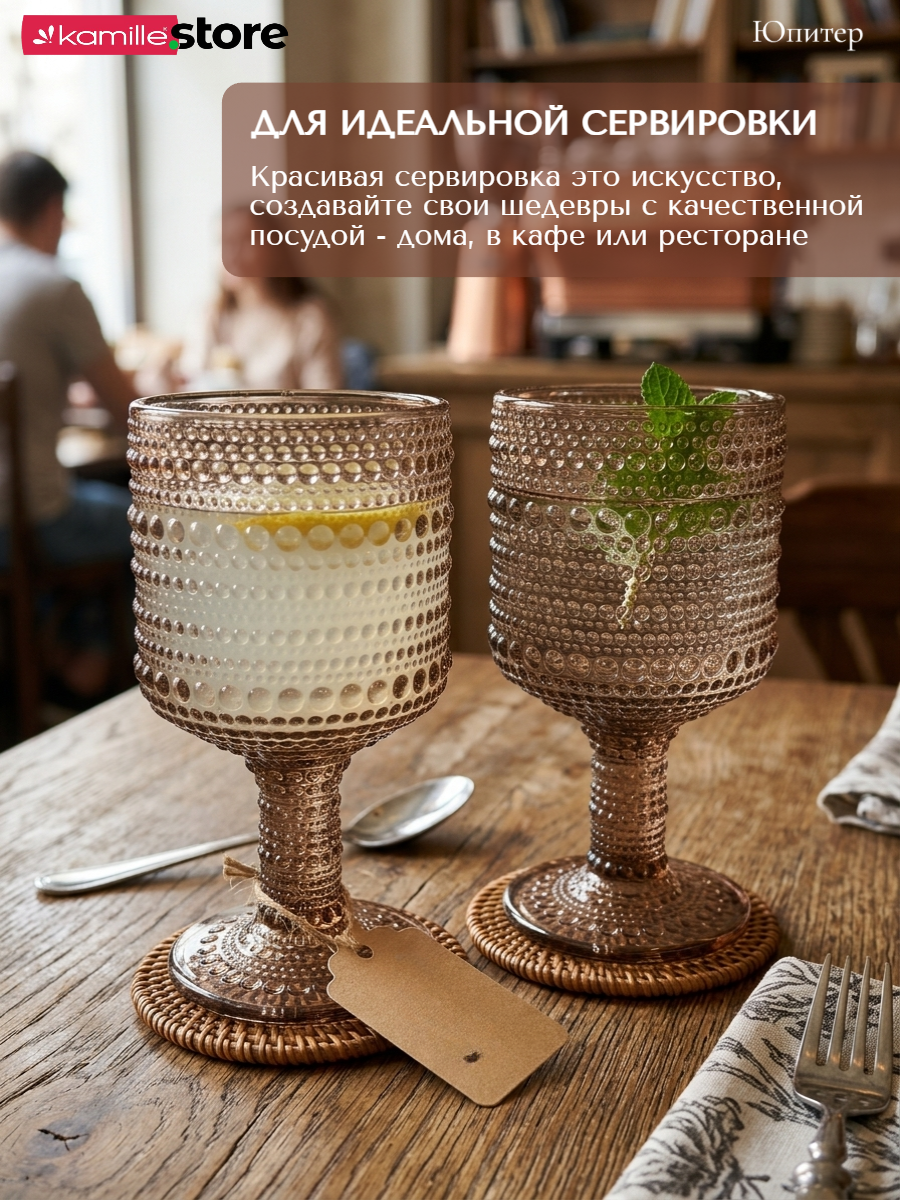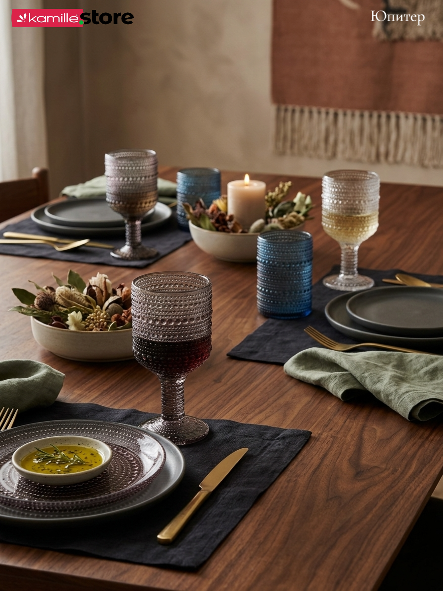 - Цветное стекло и рельефная отделка на поверхности бокалов придает им уникальный и привлекательный вид.