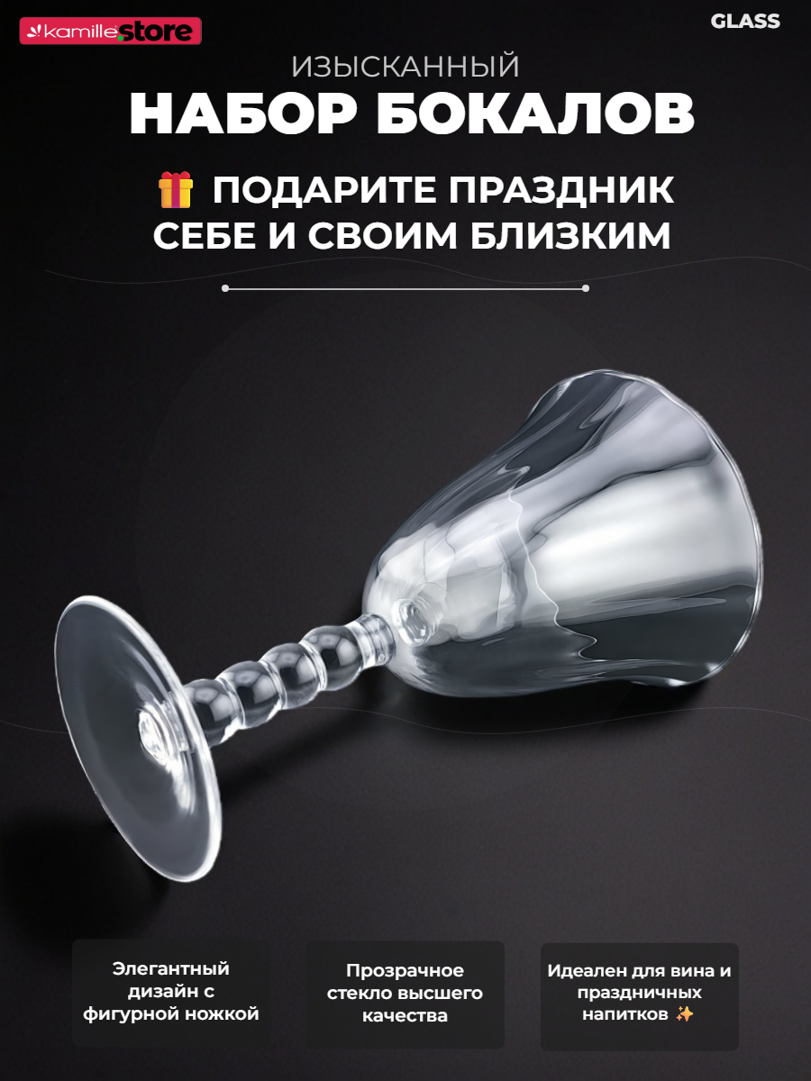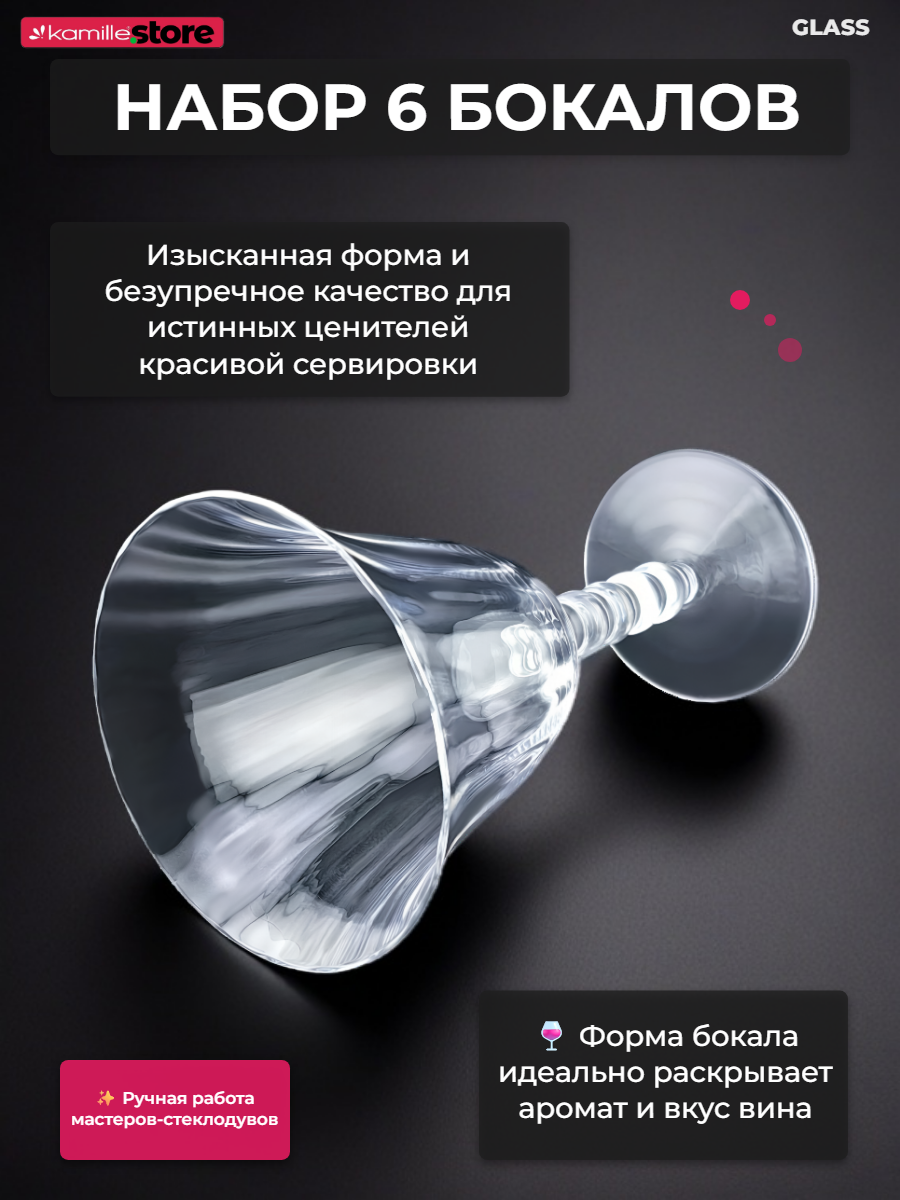 Бокалы для вина, чарующие и пленительные. Необычным дизайн, роскошный и лаконичный одновременно превращает каждый бокал в уникальный предмет, достойный внимания коллекционеров. Сервировка дополненная такой посудой, выглядит по-настоящему роскошно. Изделия выполнены из высококачественного хрустального стекла без добавления свинца. Безупречная прозрачность бокалов, позволяет в полной мере насладиться видом и вкусом любимых напитков. Набор состоит из 6 бокалов объемом по 400 мл.