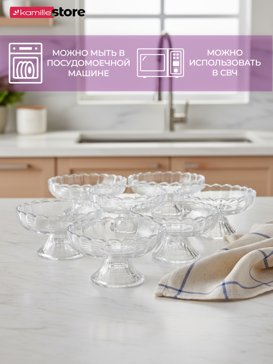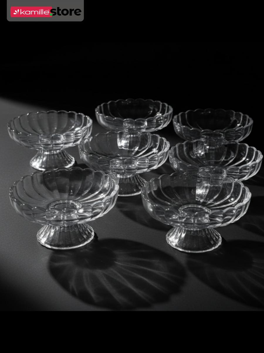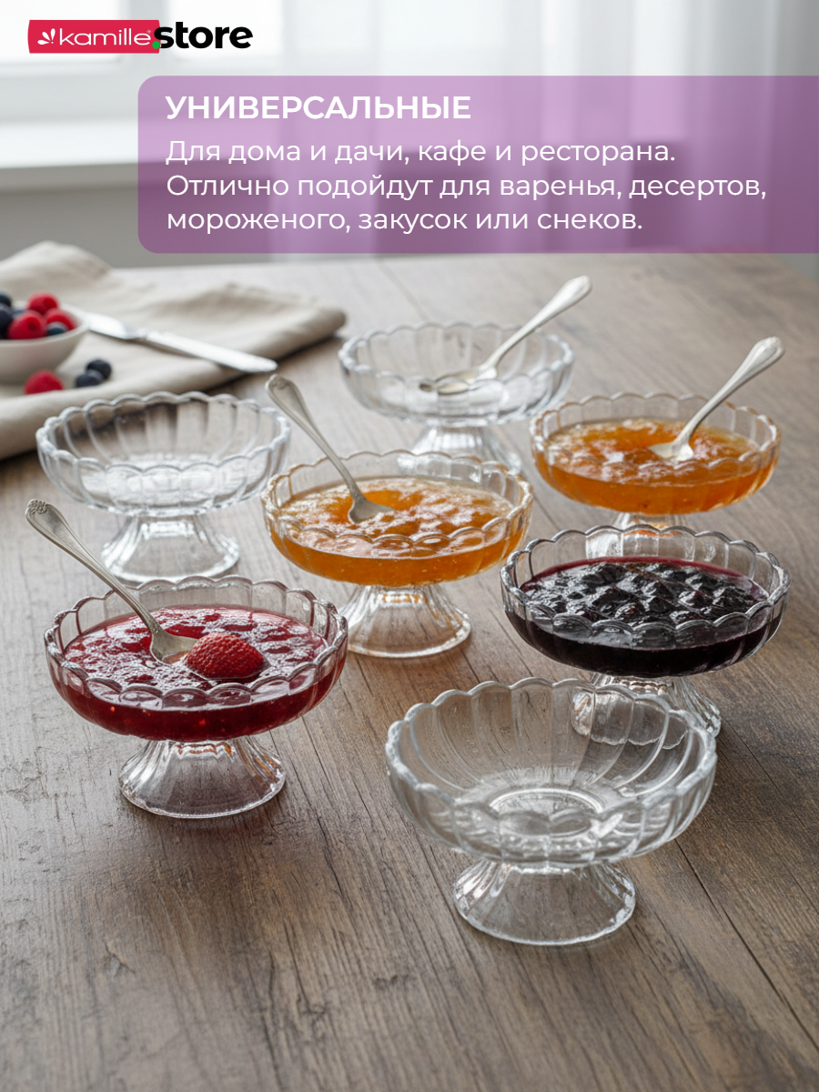 Стеклянные креманки станут незаменимыми помощниками при сервировке стола красивой посудой. Удобна форма позволяет подавать различные десерты, мороженое, снеки или закуски. Изготовлены из хрустального стекла с оригинальным дизайном, обладают высокой прозрачностью и прочностью, что позволяет наслаждаться видом и вкусом продукта. Посуда прекрасно впишется в интерьер Вашей кухни и станет достойным дополнением к кухонному инвентарю.