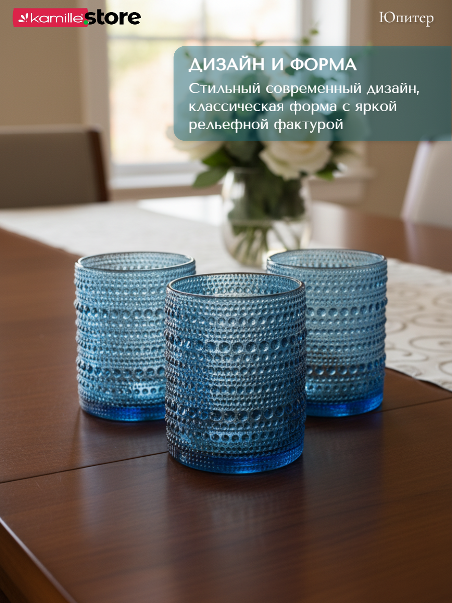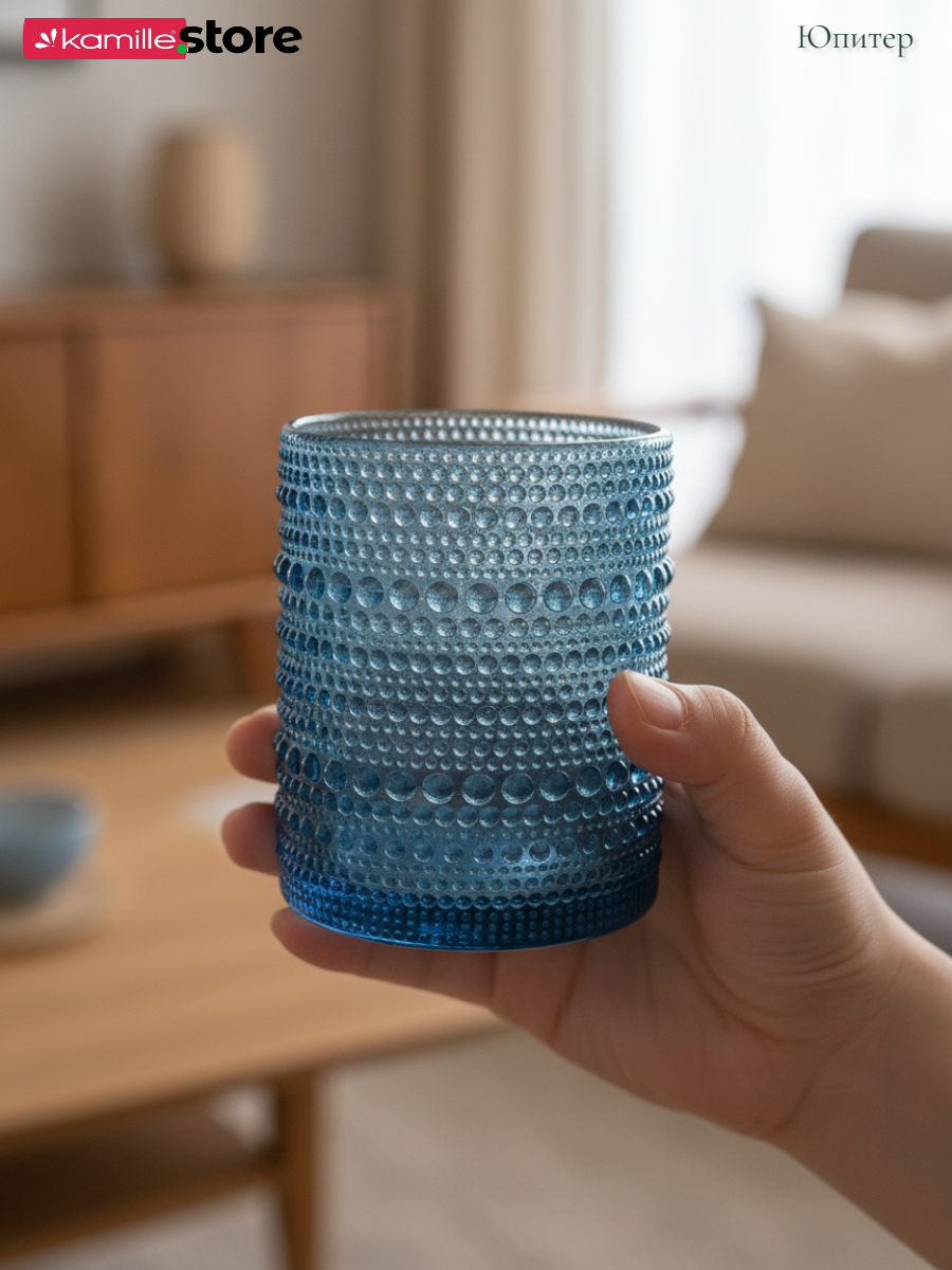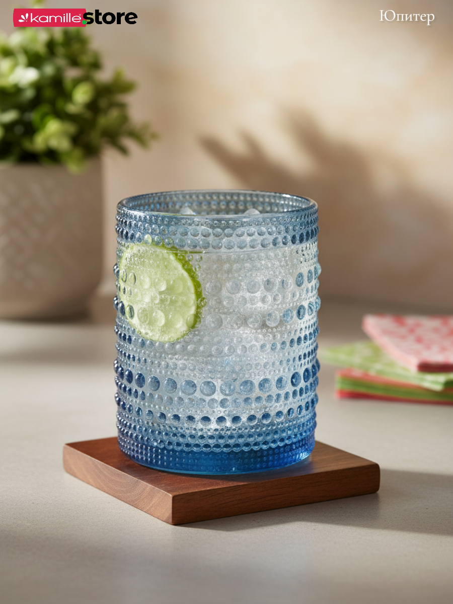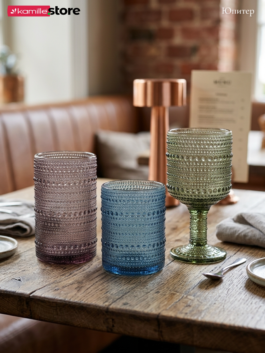 - Цветное стекло и рельефная отделка на поверхности стаканов придает им уникальный и привлекательный вид.