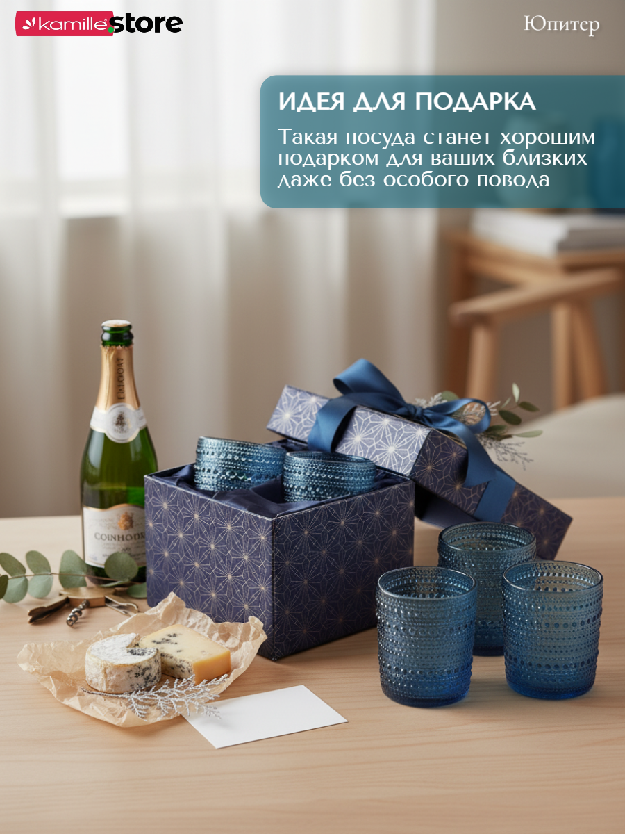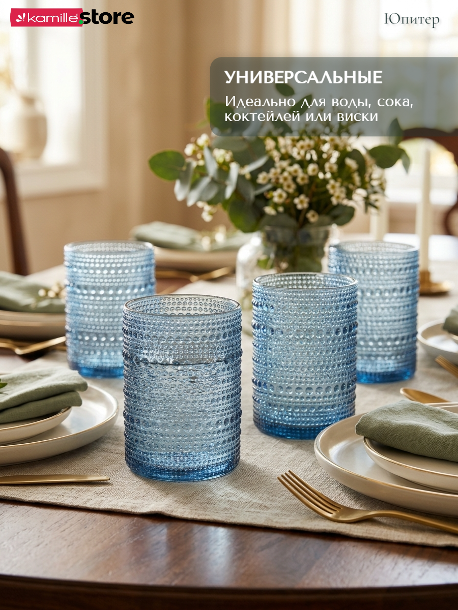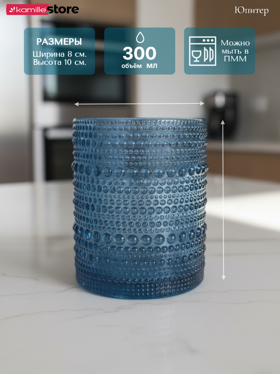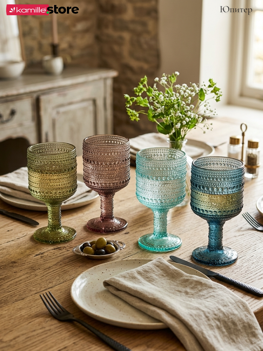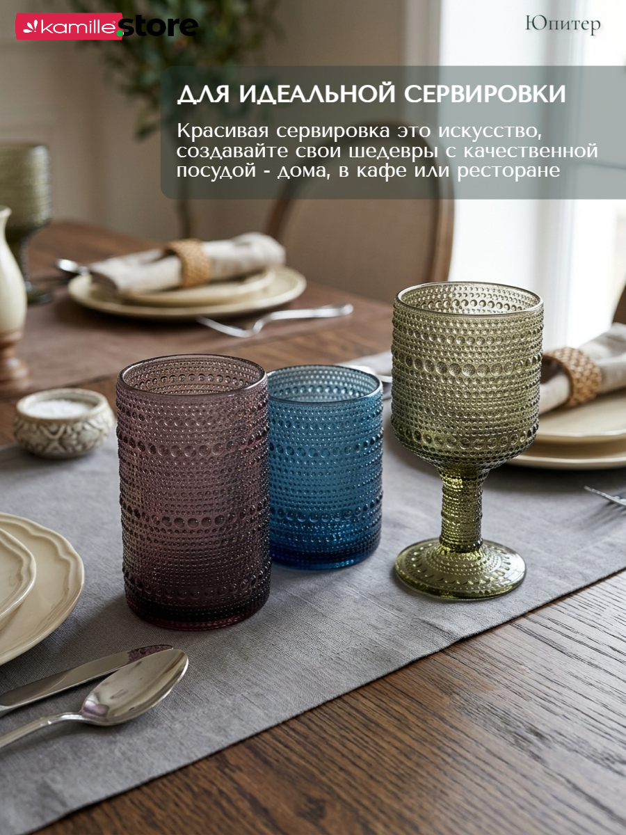 - Цветное стекло и рельефная отделка на поверхности стаканов придает им уникальный и привлекательный вид.