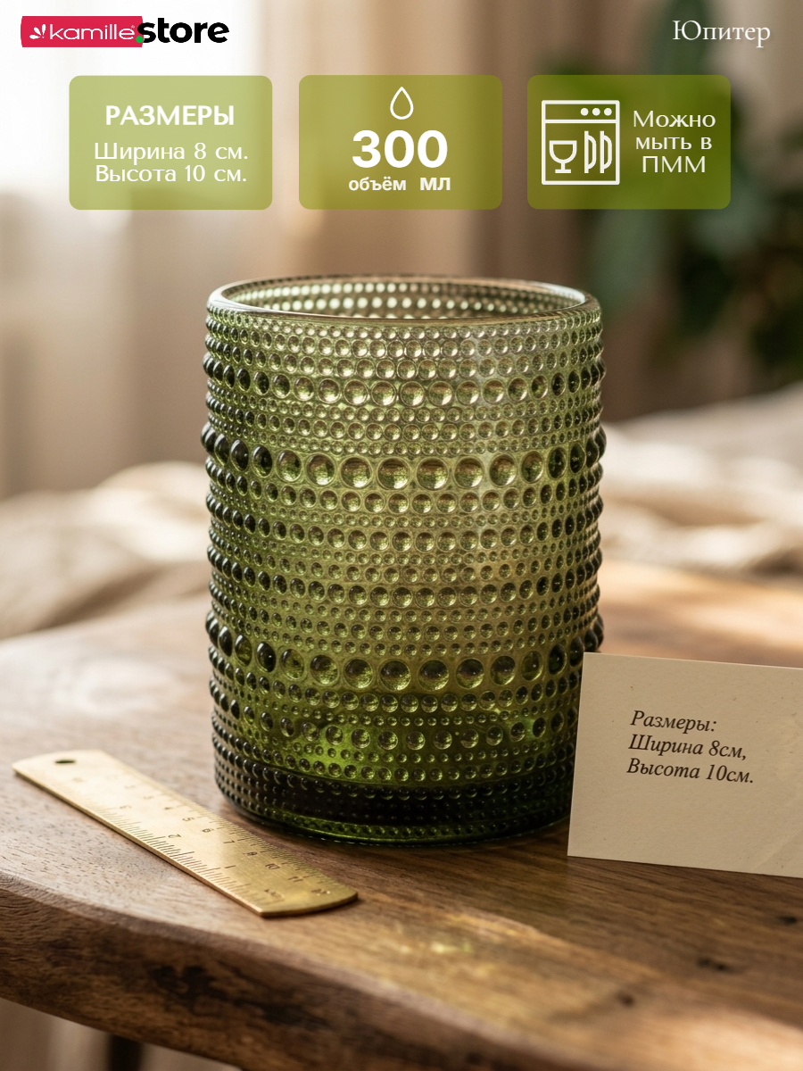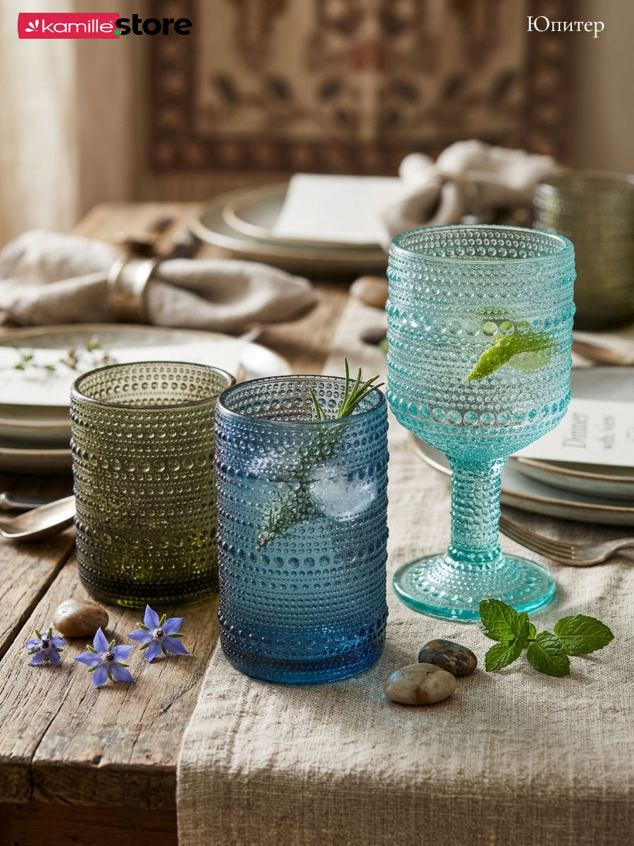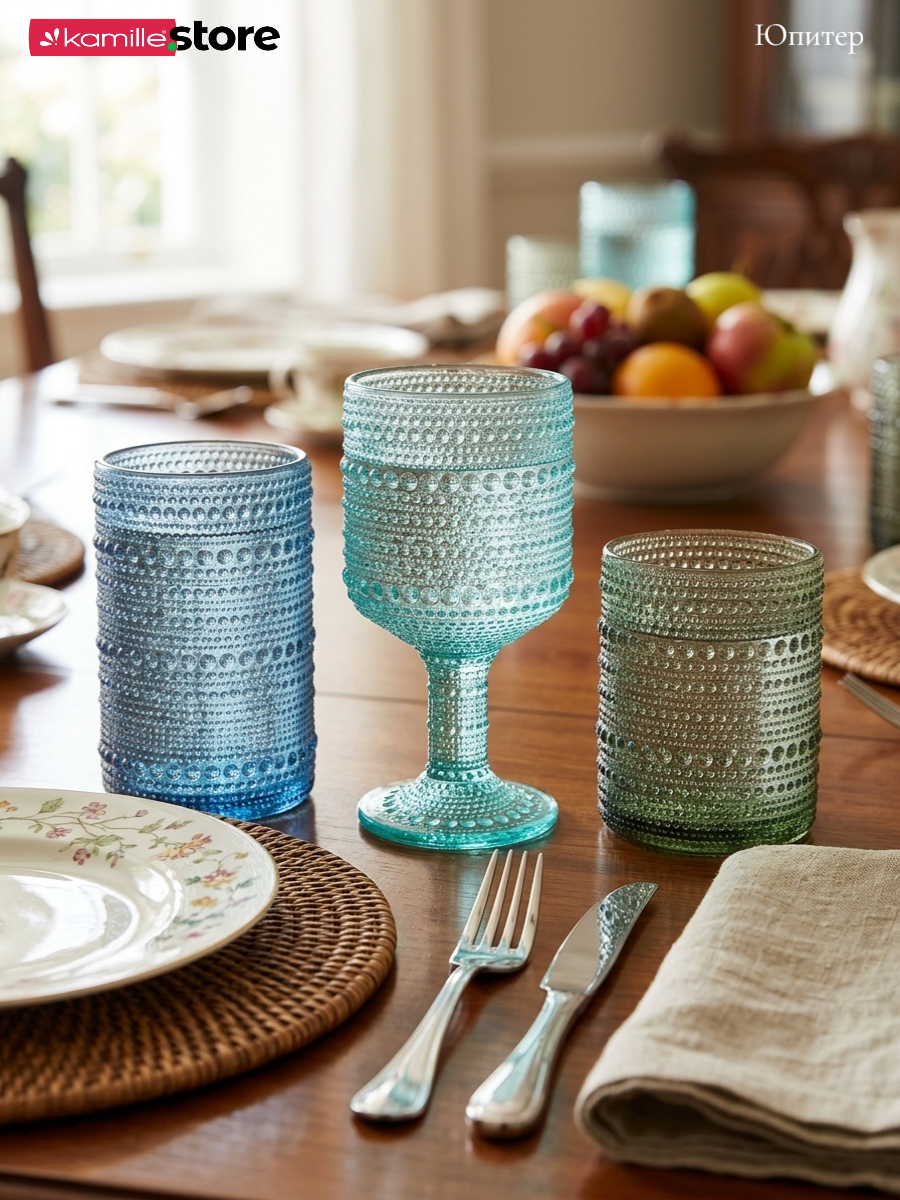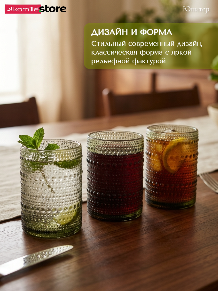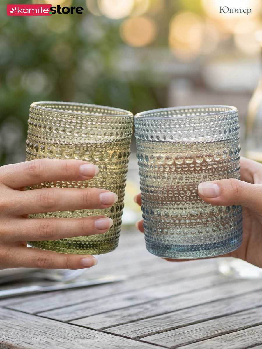 - Цветное стекло и рельефная отделка на поверхности стаканов придает им уникальный и привлекательный вид.