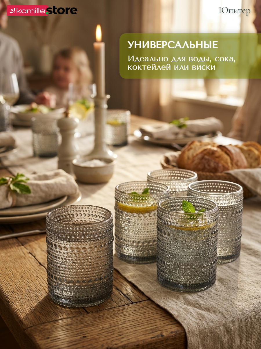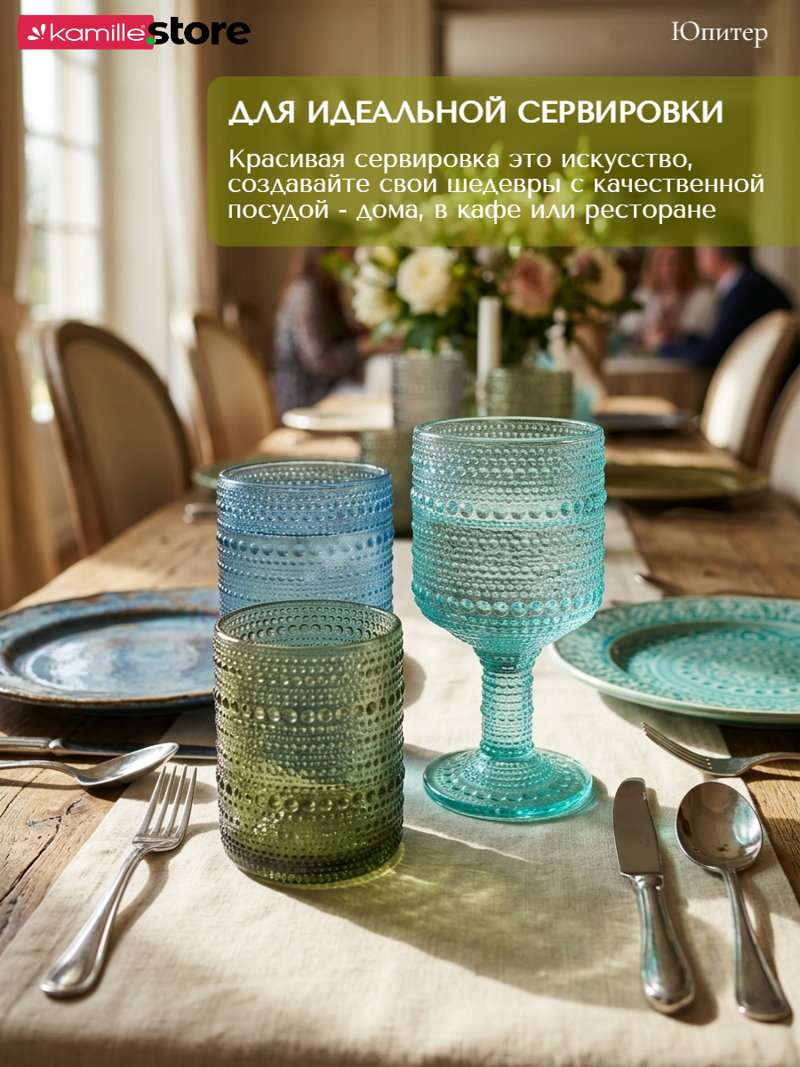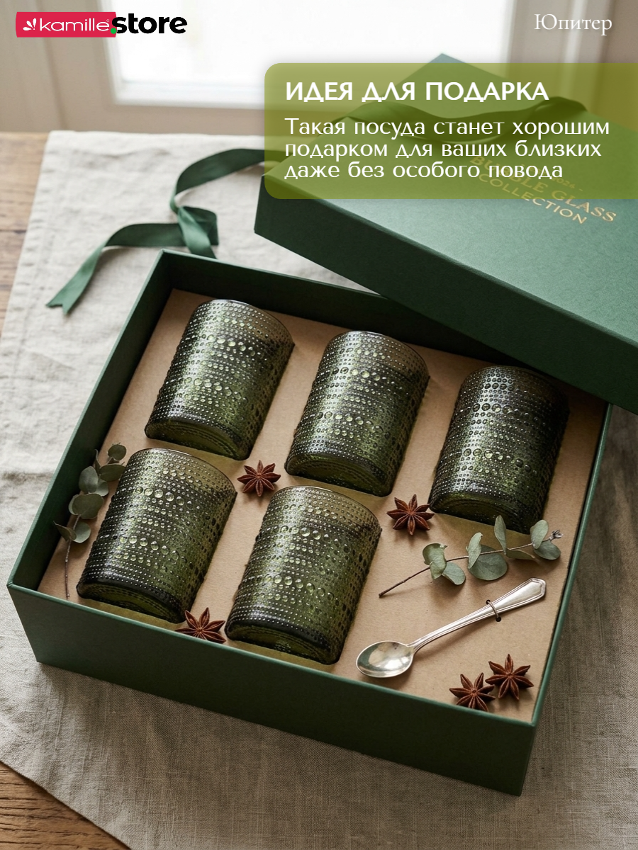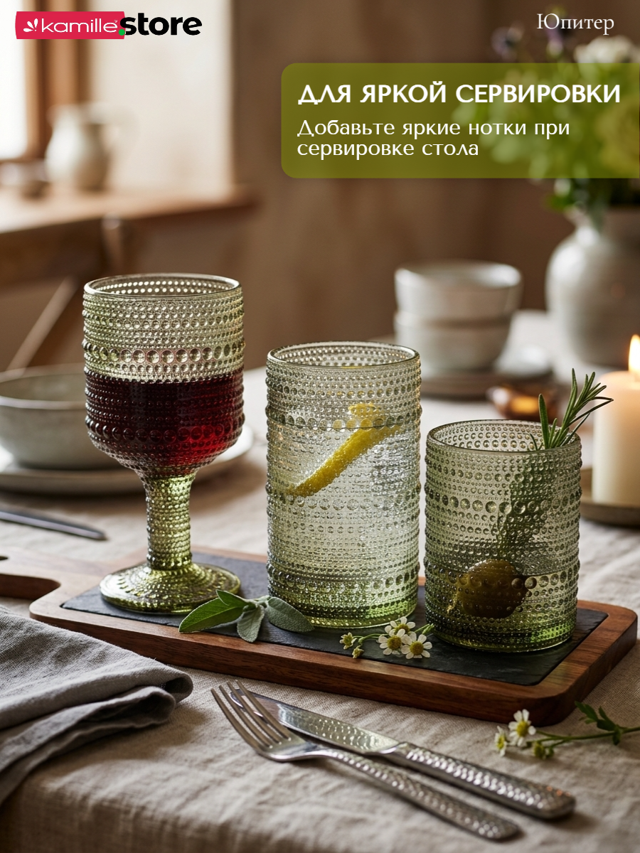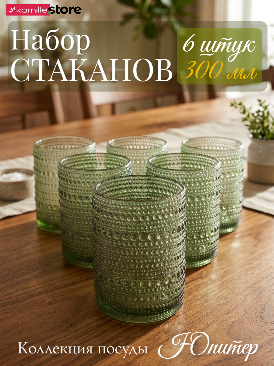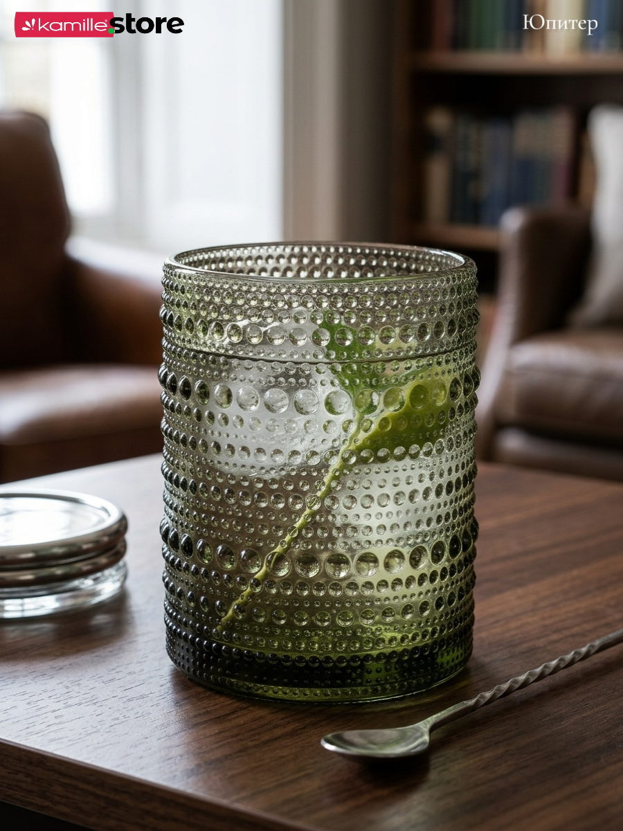 - Цветное стекло и рельефная отделка на поверхности стаканов придает им уникальный и привлекательный вид.