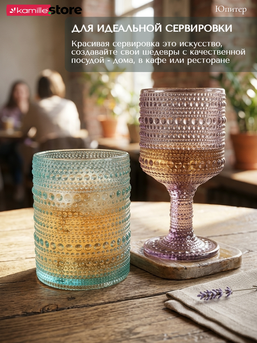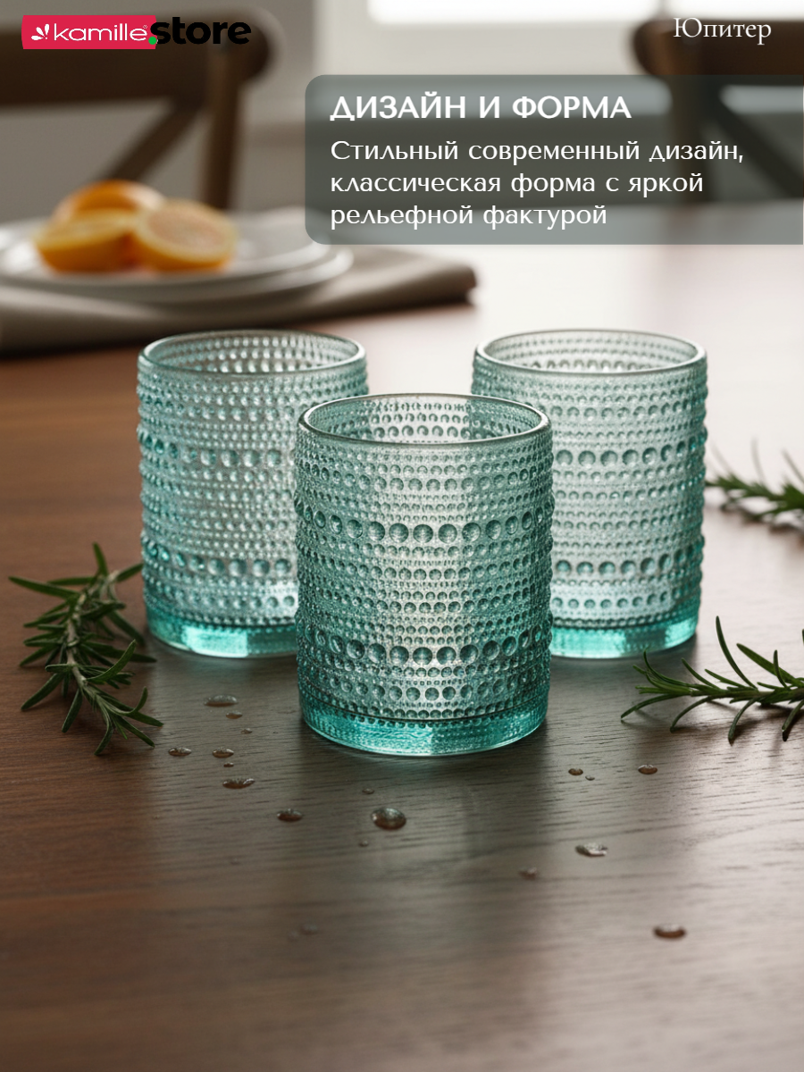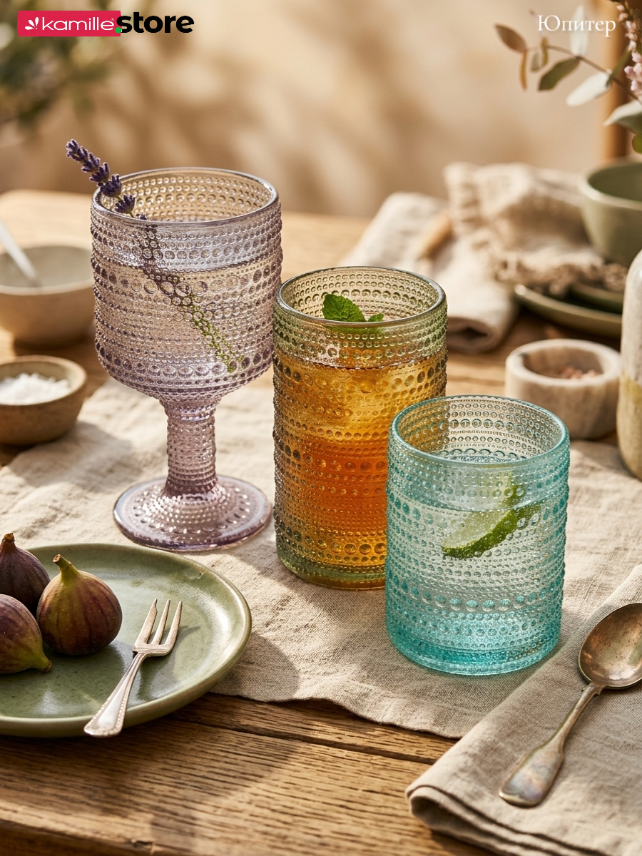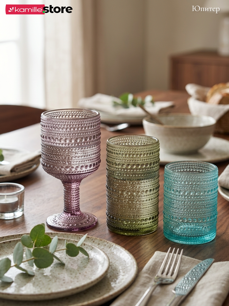 - Цветное стекло и рельефная отделка на поверхности стаканов придает им уникальный и привлекательный вид.