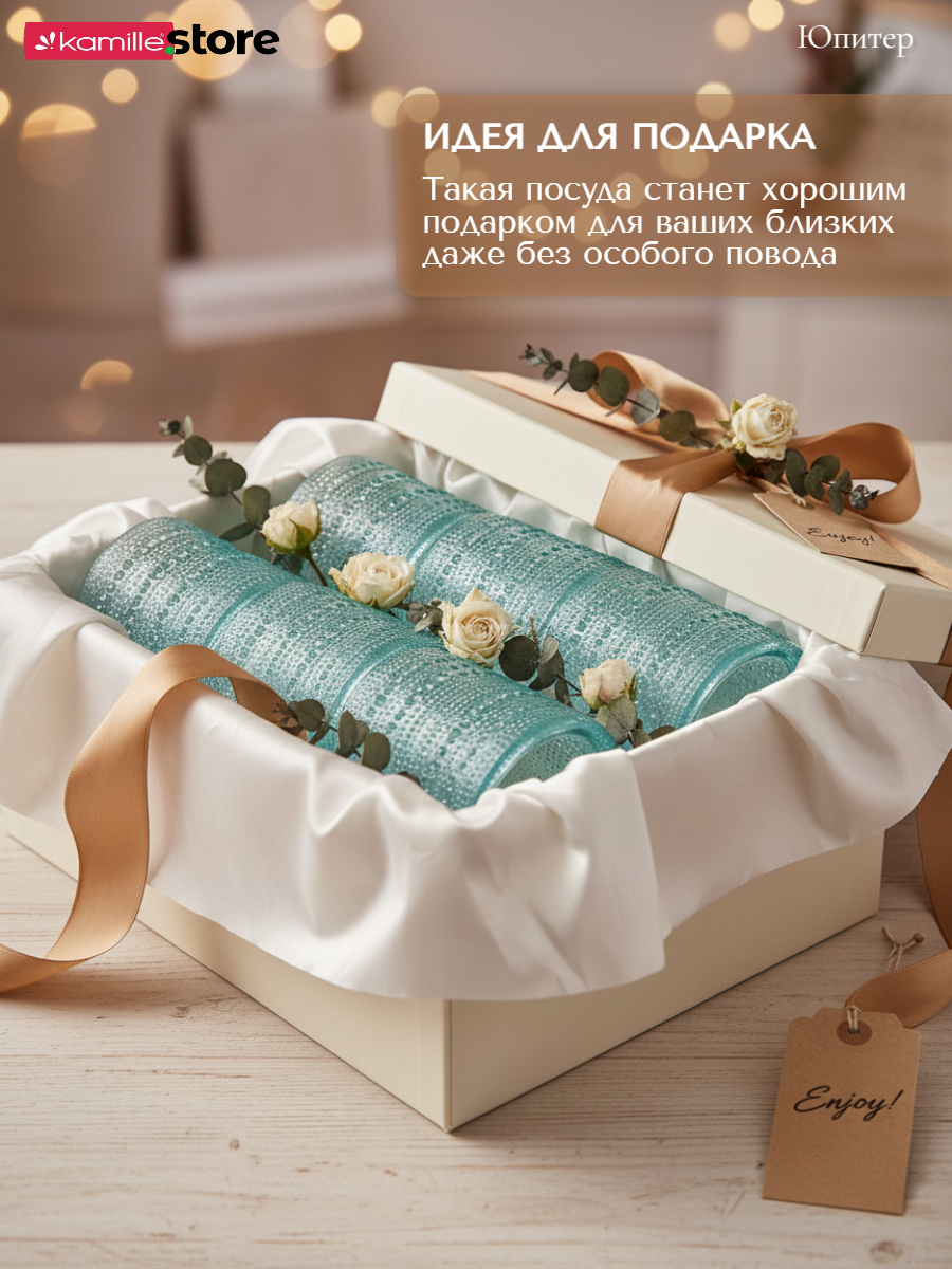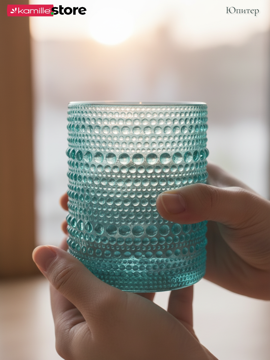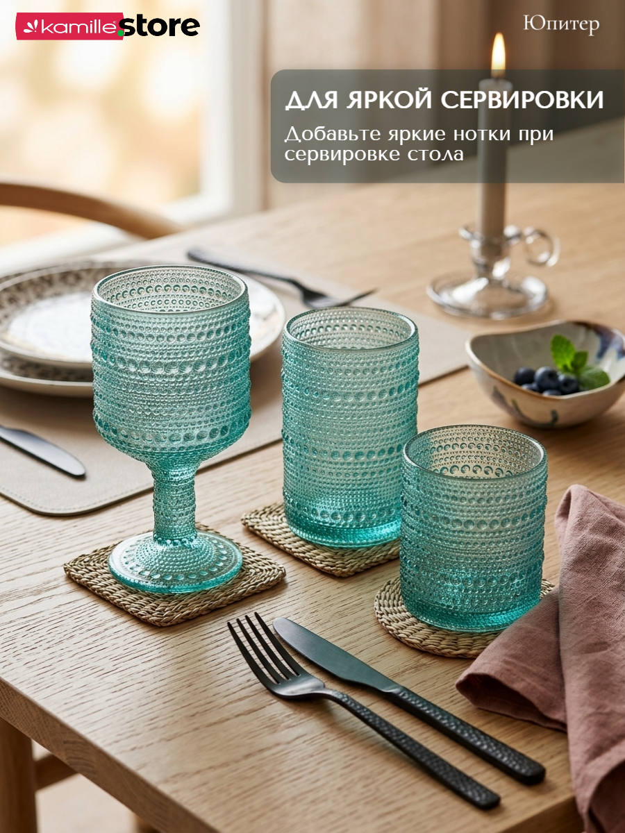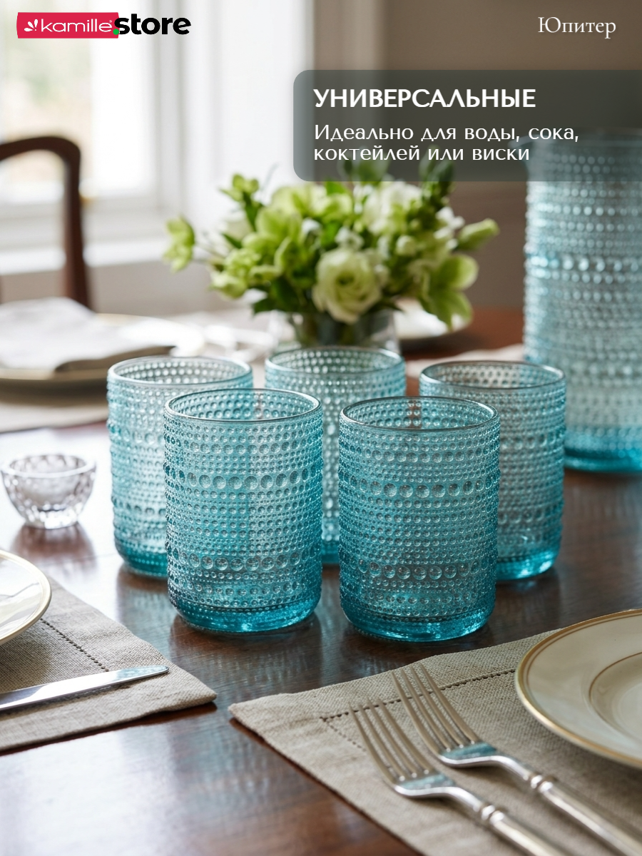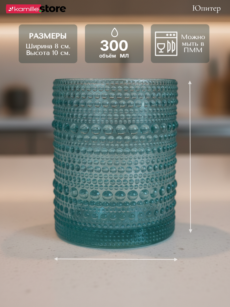 - Цветное стекло и рельефная отделка на поверхности стаканов придает им уникальный и привлекательный вид.