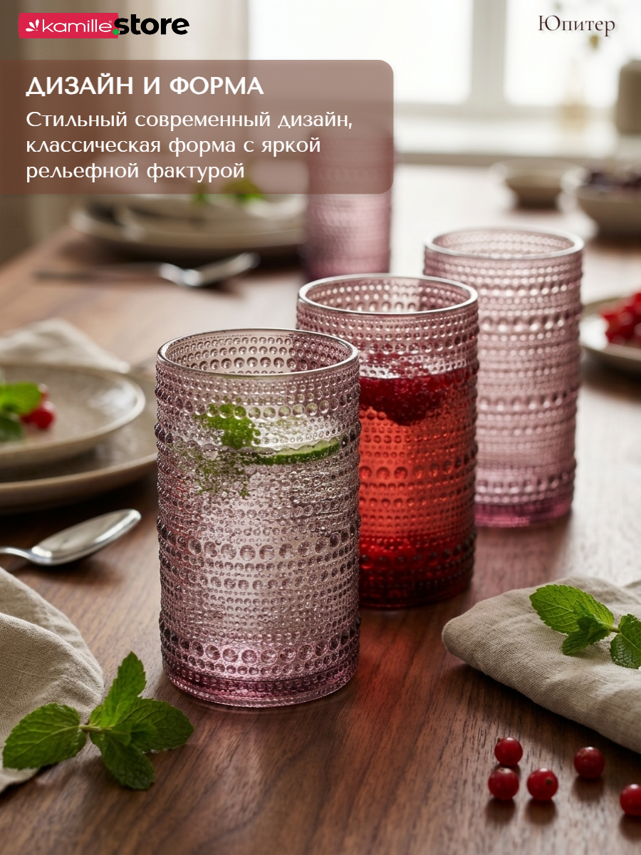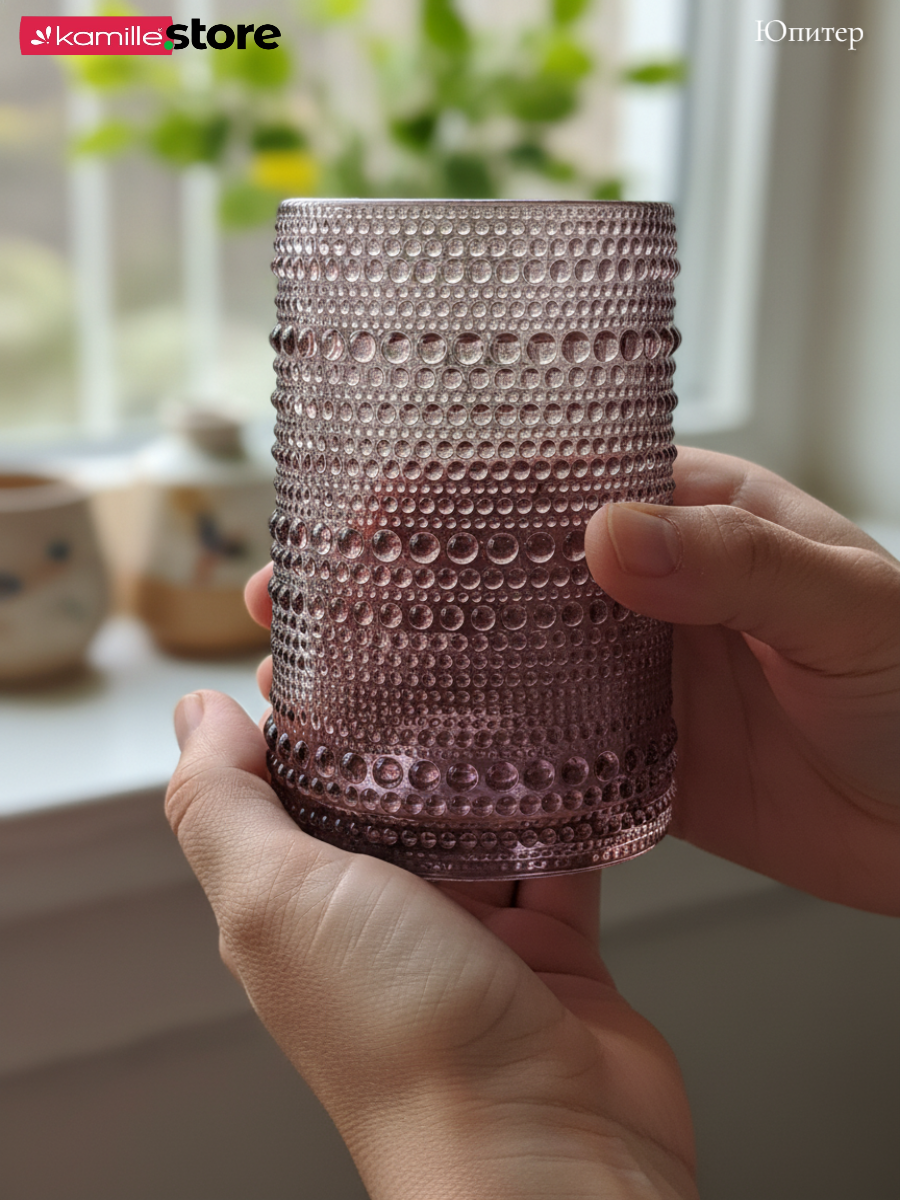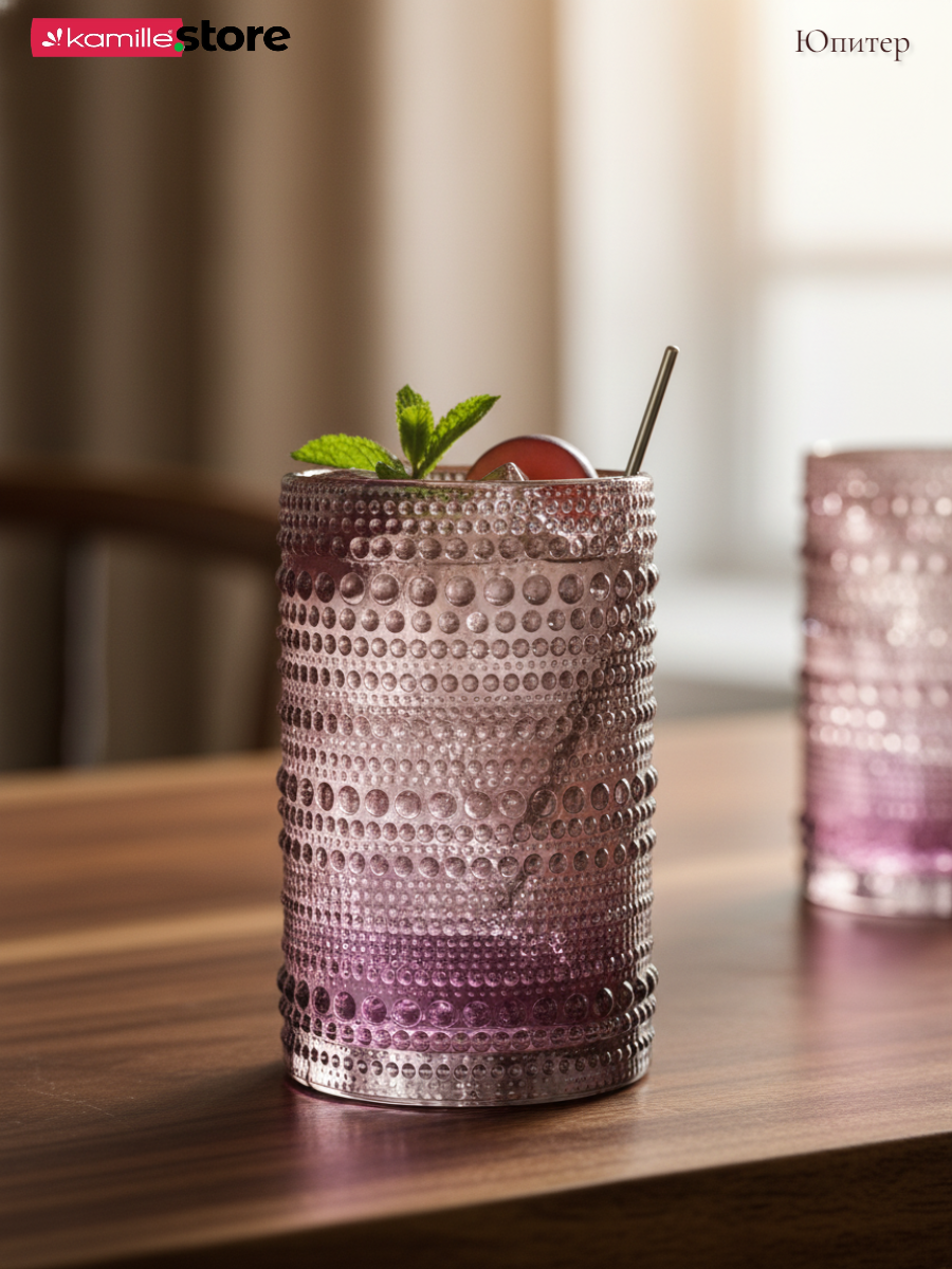 - Цветное стекло и рельефная отделка на поверхности стаканов придает им уникальный и привлекательный вид.