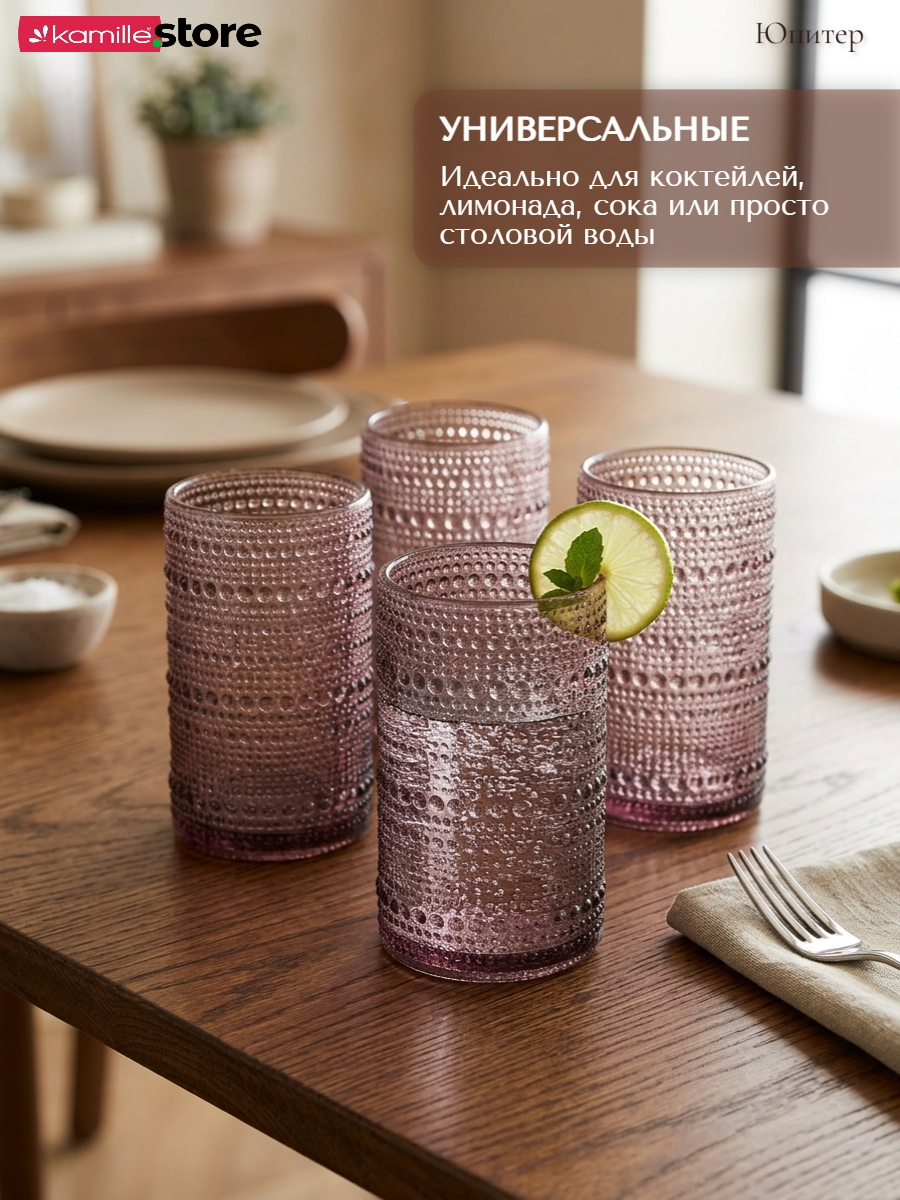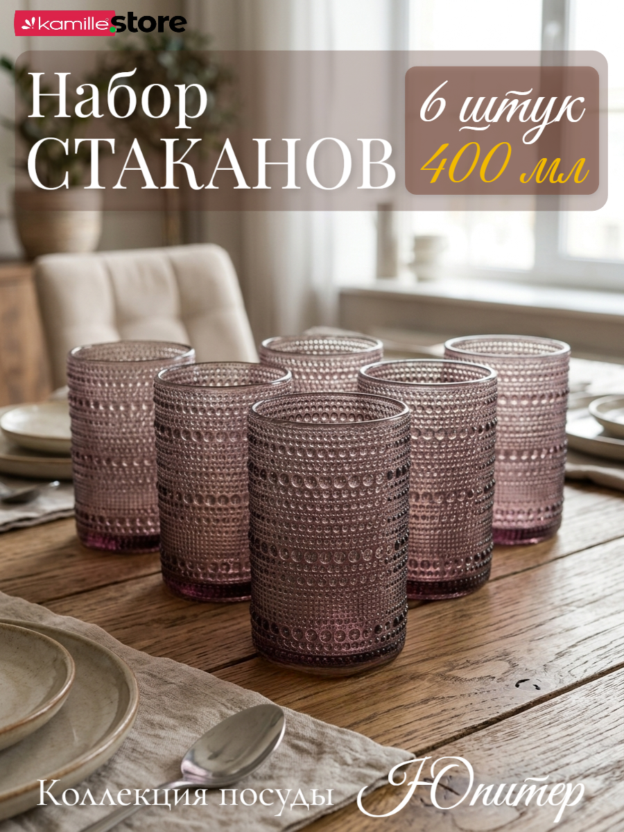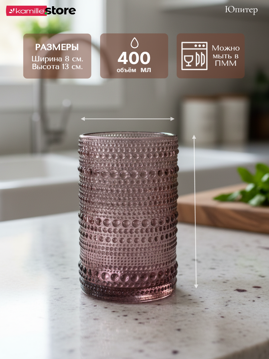 - Цветное стекло и рельефная отделка на поверхности стаканов придает им уникальный и привлекательный вид.