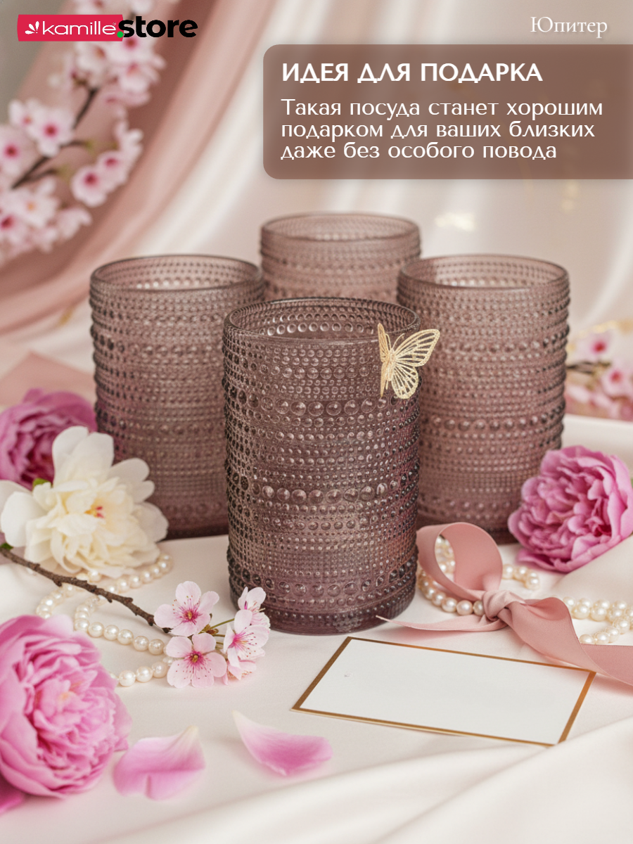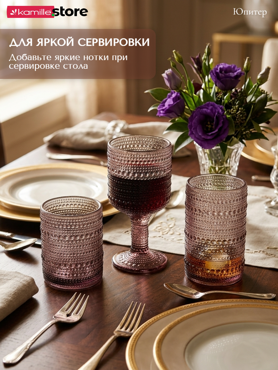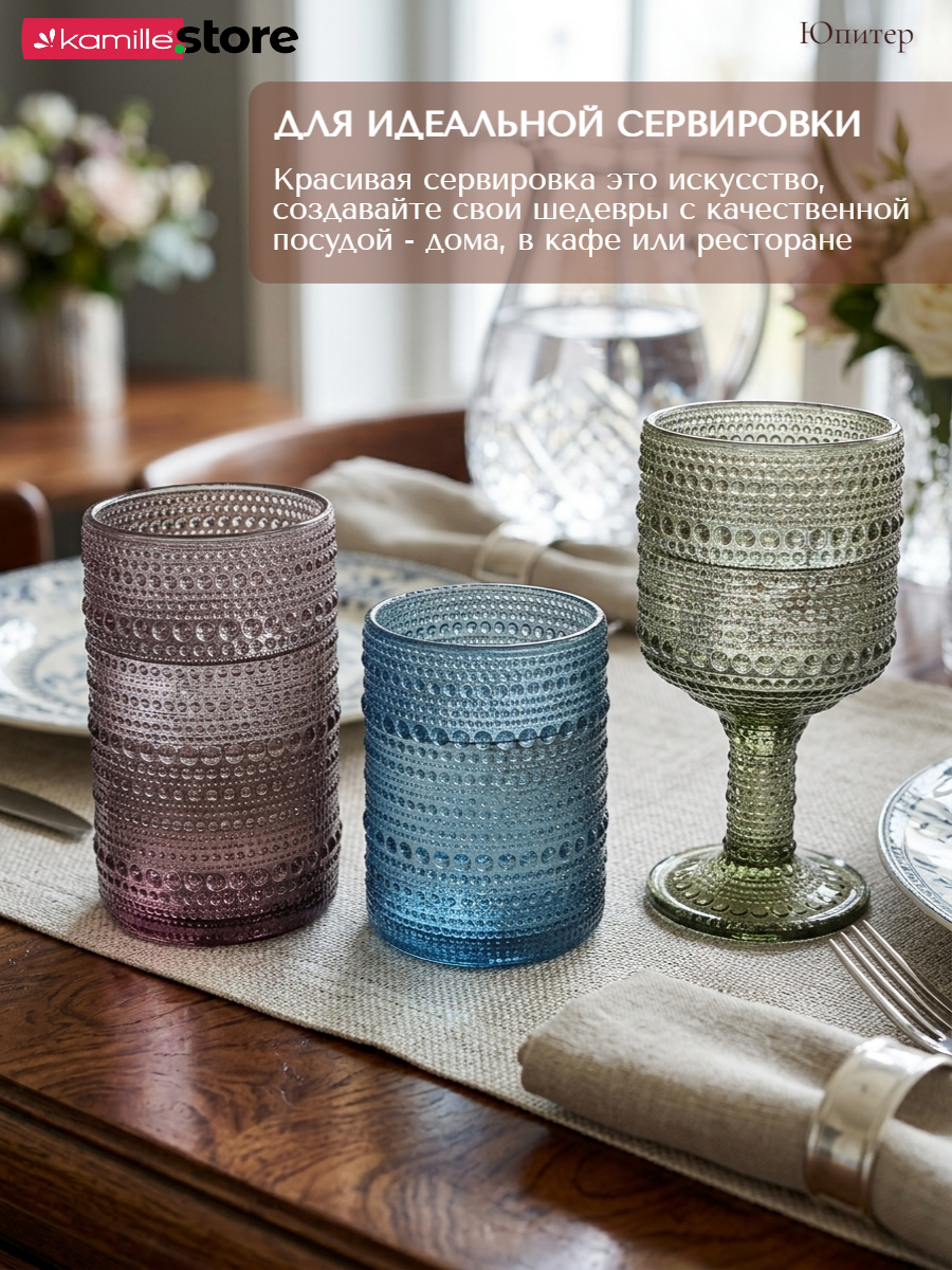 Стаканы Юпитер, выполнены из цветного стекла и смогут добавить яркости любому столу, стильный дизайн с отделкой в виде бусин добавляет элегантности. Такая посуда станет идеальным решением для праздничной или повседневной сервировки. Прочное стекло обеспечит прочность, долговечность и превосходный внешний вид изделиям надолго.