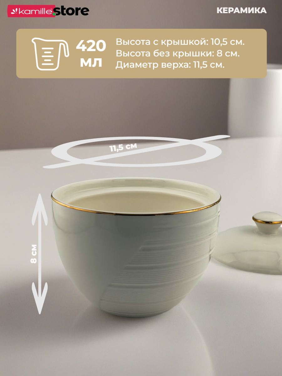 Материал: керамика с глазурованным покрытием. Цвет: белый с золотой обводкой. Объем: 420 мл. Высота с крышкой: 10,5 см. Высота без крышки: 8 см. Диаметр верха: 11,5 см. Комплектация: сахарница, крышка. Мытье в посудомоечной машине: нет. Ящик: 48 шт.