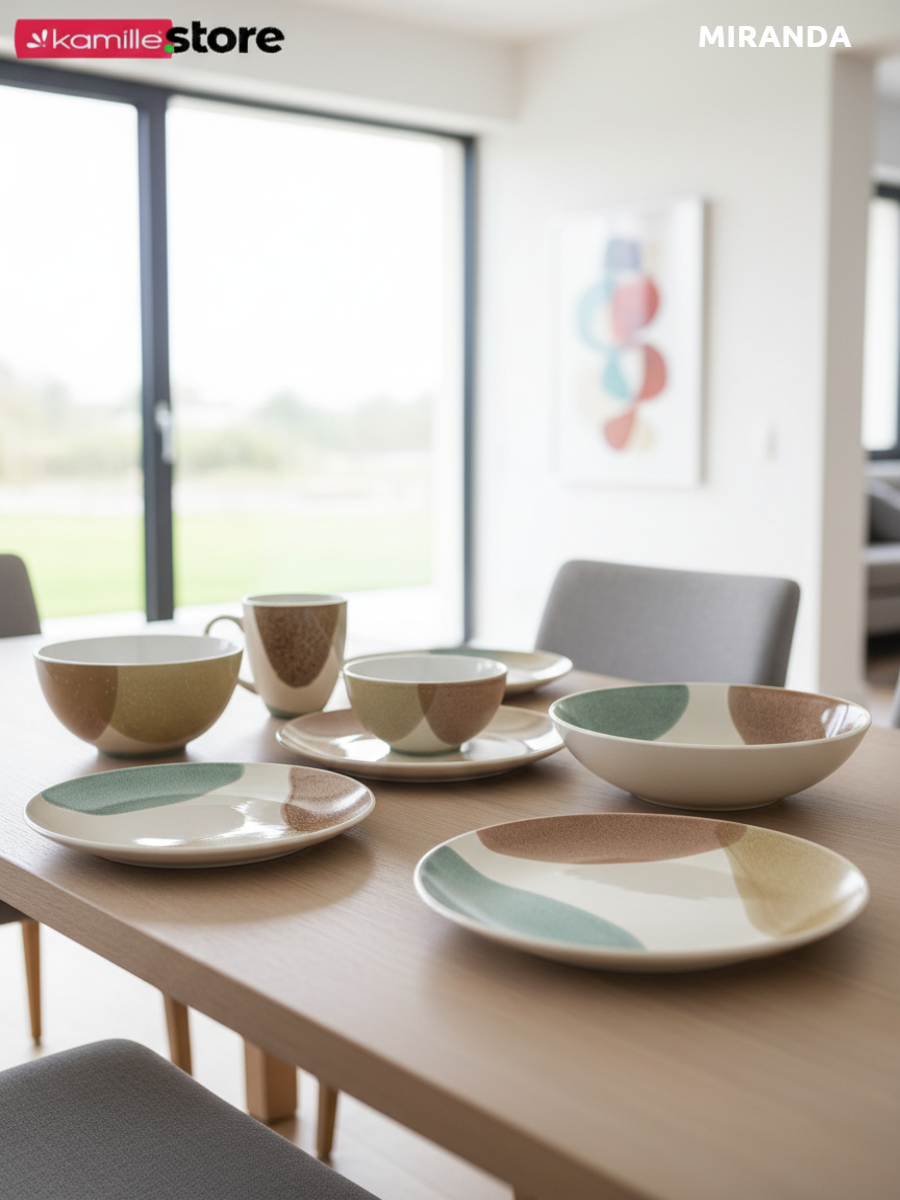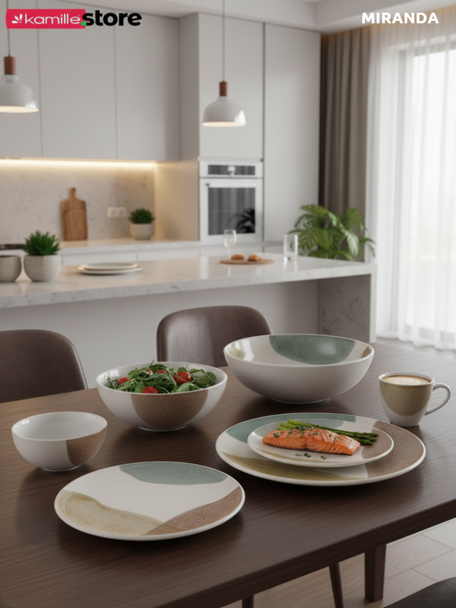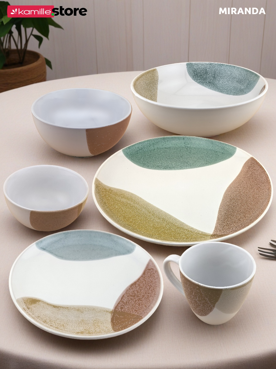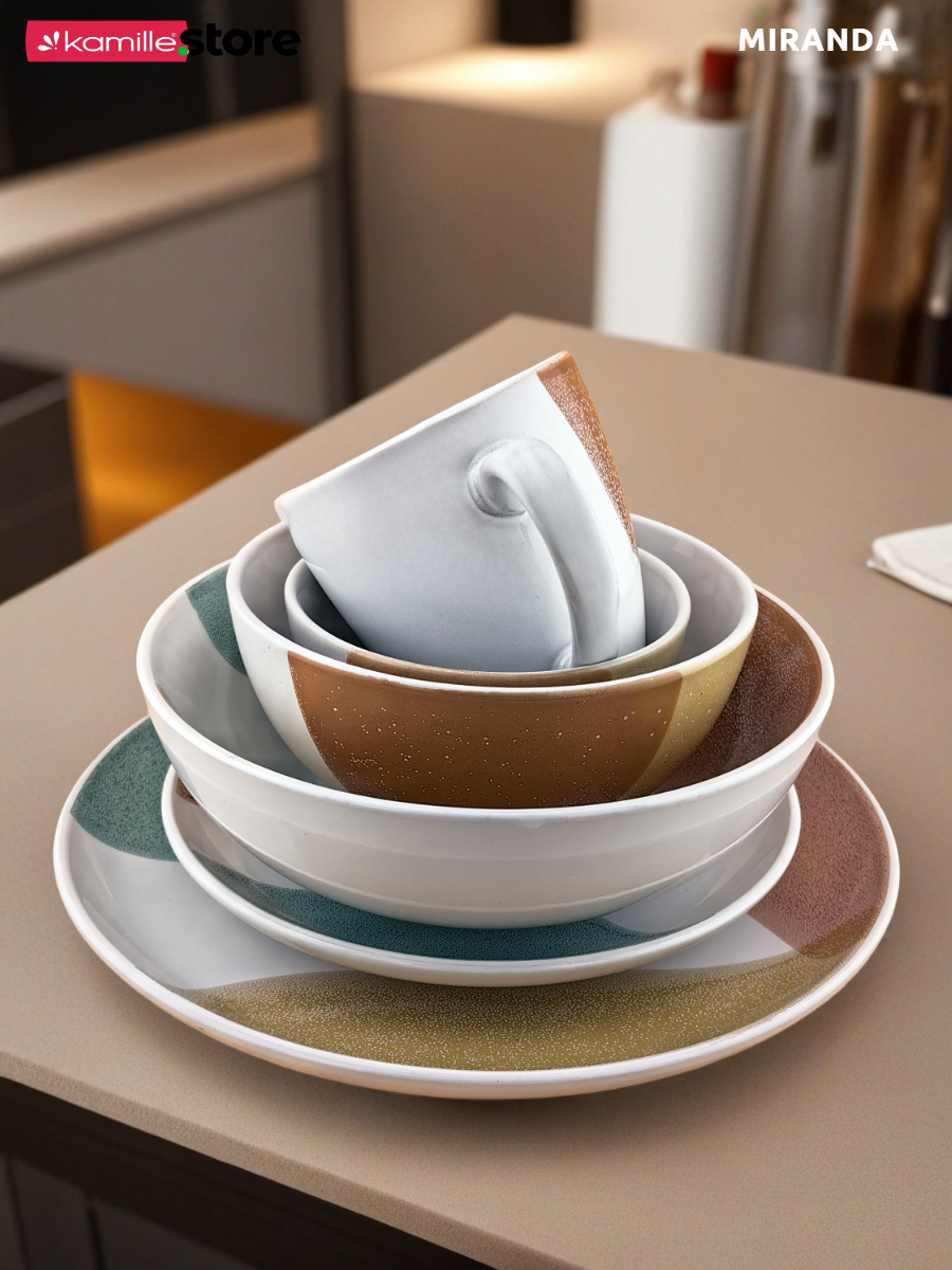 Столовый обеденный сервиз из коллекции MIRANDA - это яркая, качественная, привлекательная и очень практичная посуда. Все изделия изготовлены по технологии высокотемпературного обжига из качественной керамики, рисунок нанесен методом подглазурной окраски, цвета в этом случае яркие и более стойкие, в сочетании с прочной глянцевой глазурью посуда прослужит вам не один год.