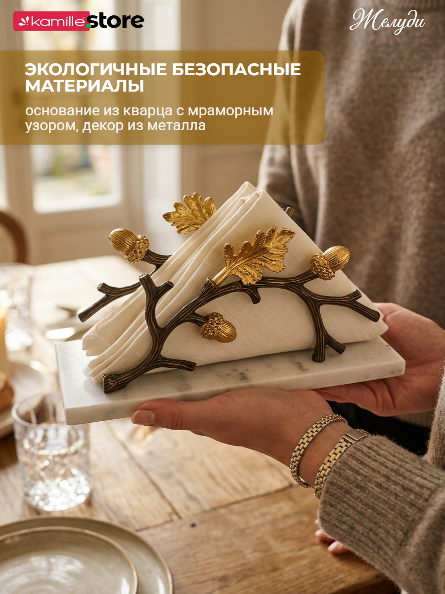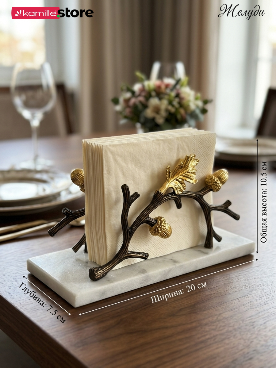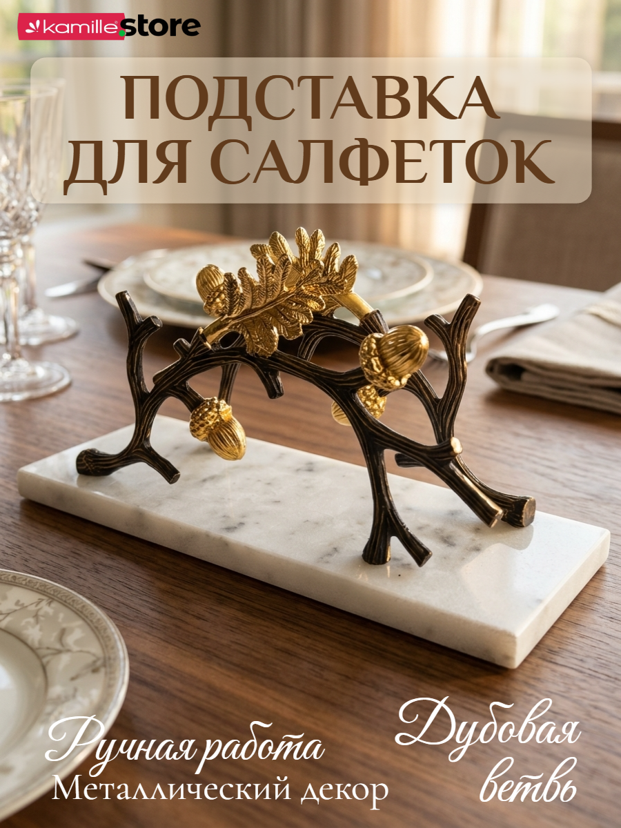 Представляем вашему вниманию, шикарную салфетницу - изготовлена вручную, основание из кварцевого камня с мраморным узором, с изящным металлическим декором "Дубовая ветвь". Создана для того, чтобы добавить изысканности вашему интерьеру и придать уютной обстановке штрих оригинальности. Такой аксессуар станет украшением любого дома, одновременно привнося в него красоту и функциональность.