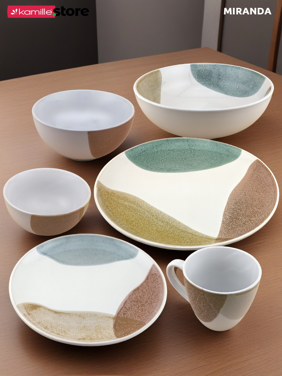 Столовый обеденный сервиз из коллекции MIRANDA - это яркая, качественная, привлекательная и очень практичная посуда. Все изделия изготовлены по технологии высокотемпературного обжига из качественной керамики, рисунок нанесен методом подглазурной окраски, цвета в этом случае яркие и более стойкие, в сочетании с прочной глянцевой глазурью посуда прослужит вам не один год.