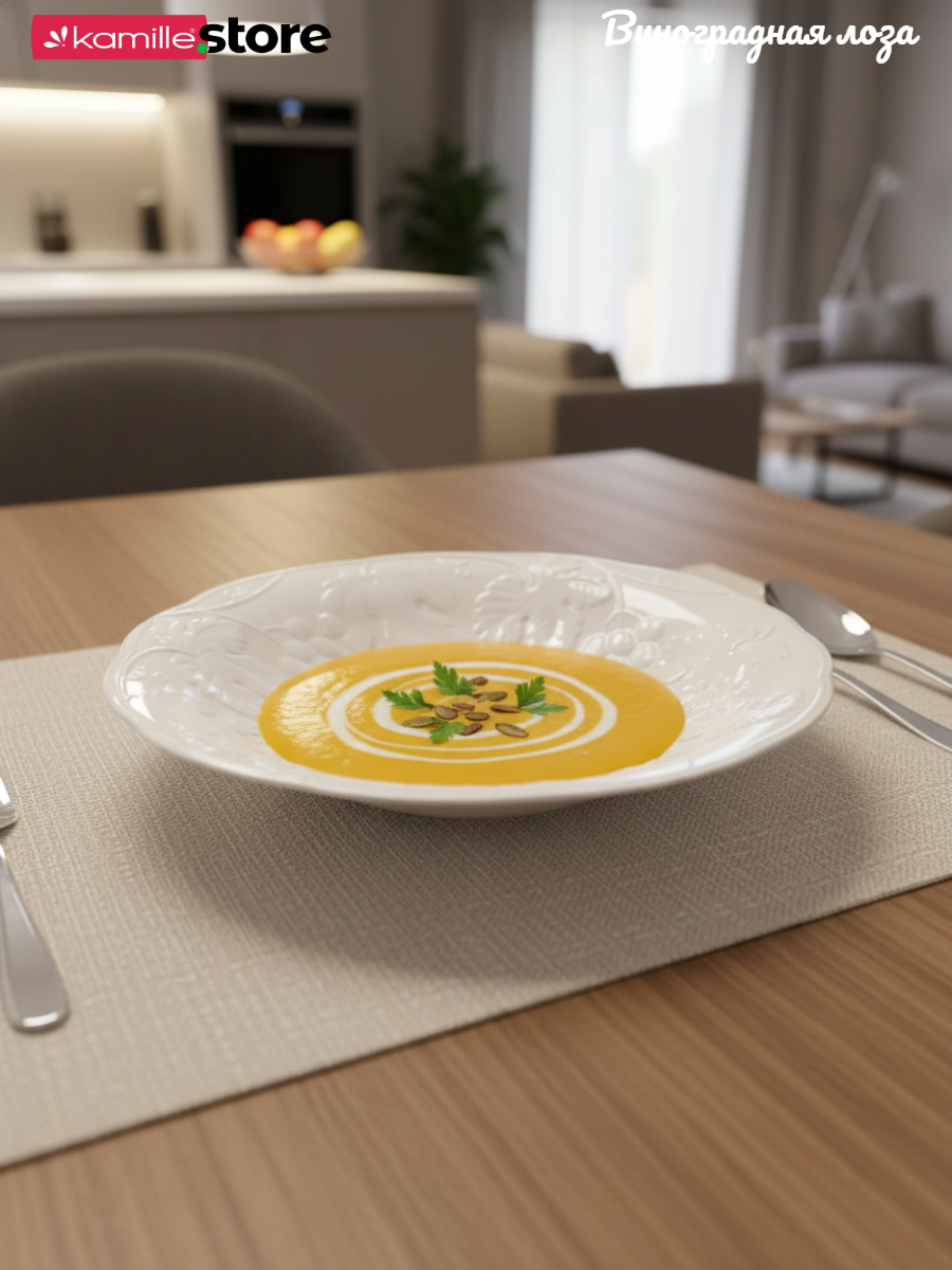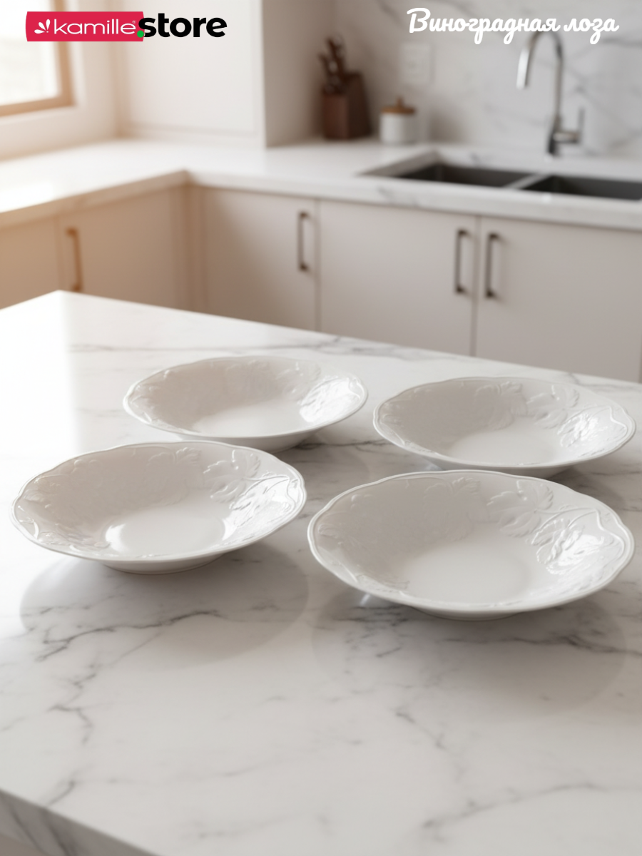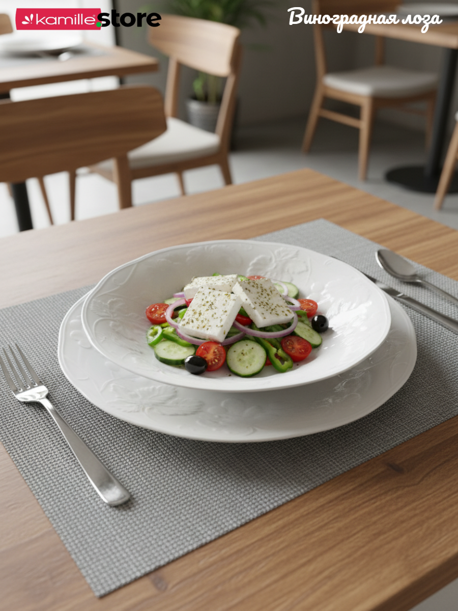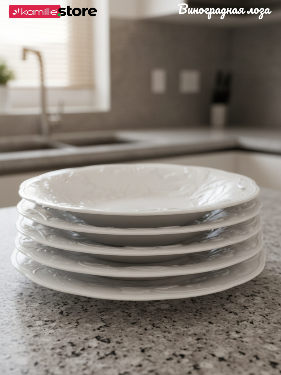 Столовая посуда серии "Виноградная лоза" - это необычная, изящная, привлекательная, белоснежная и очень практичная посуда. Все предметы из этой коллекции можно мыть в посудомоечной машине и использовать в микроволновых печах. Фарфор этой серии обладает такими характеристиками как: укрепленный край от сколов, особо прочная глазурь, минимальная пористость, практичность и долговечность. Это стильный выбор для сервировки вашего стола.