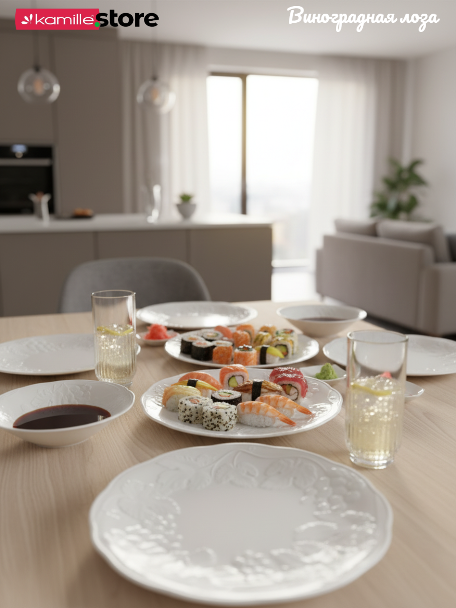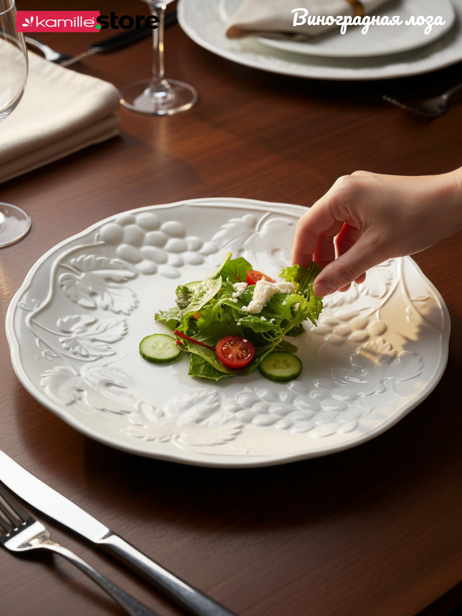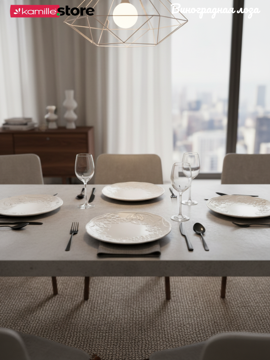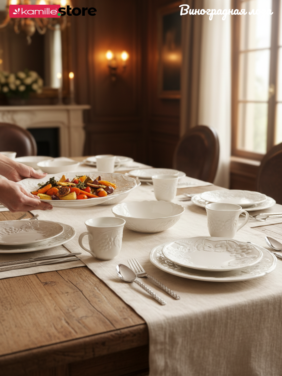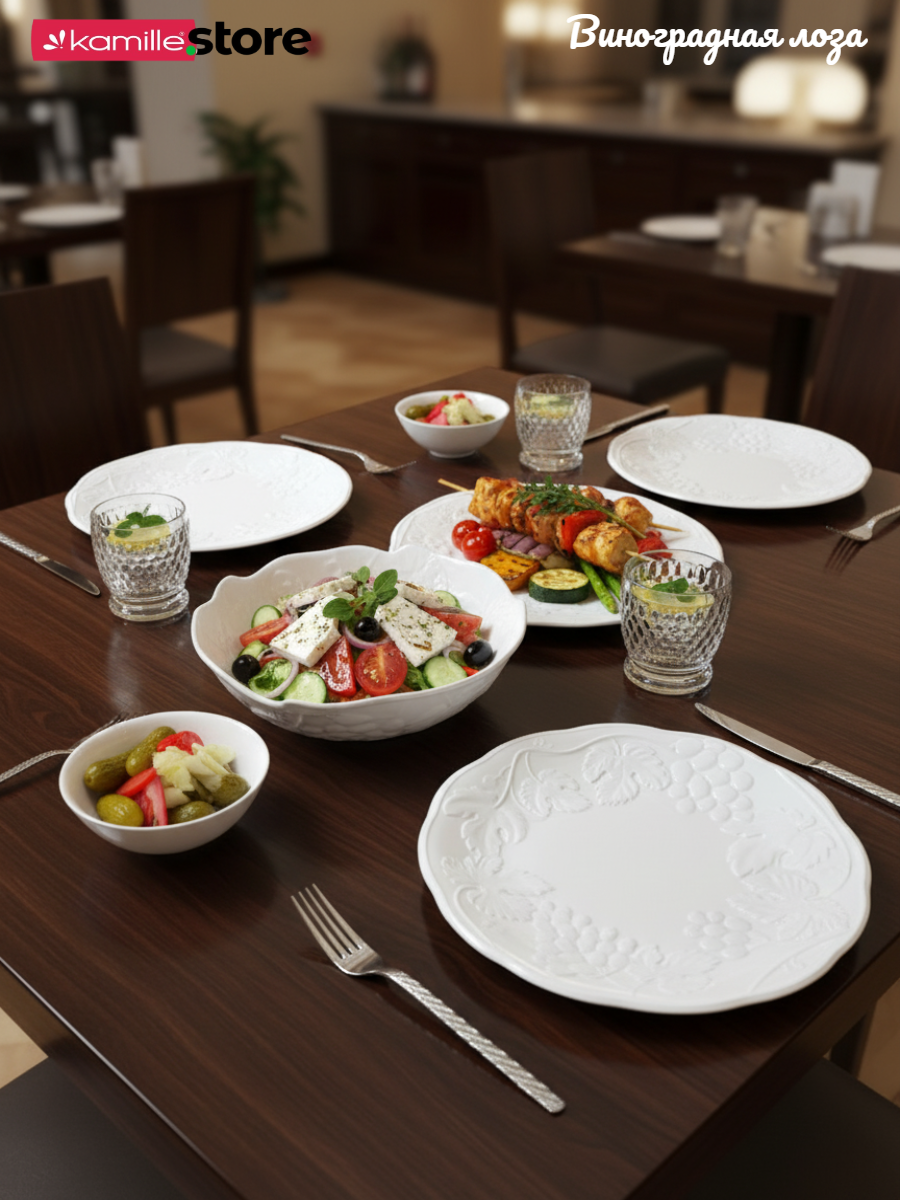 Коллекция посуды "Виноградная лоза" универсальна, как для дома, так и для кафе, и ресторанов.