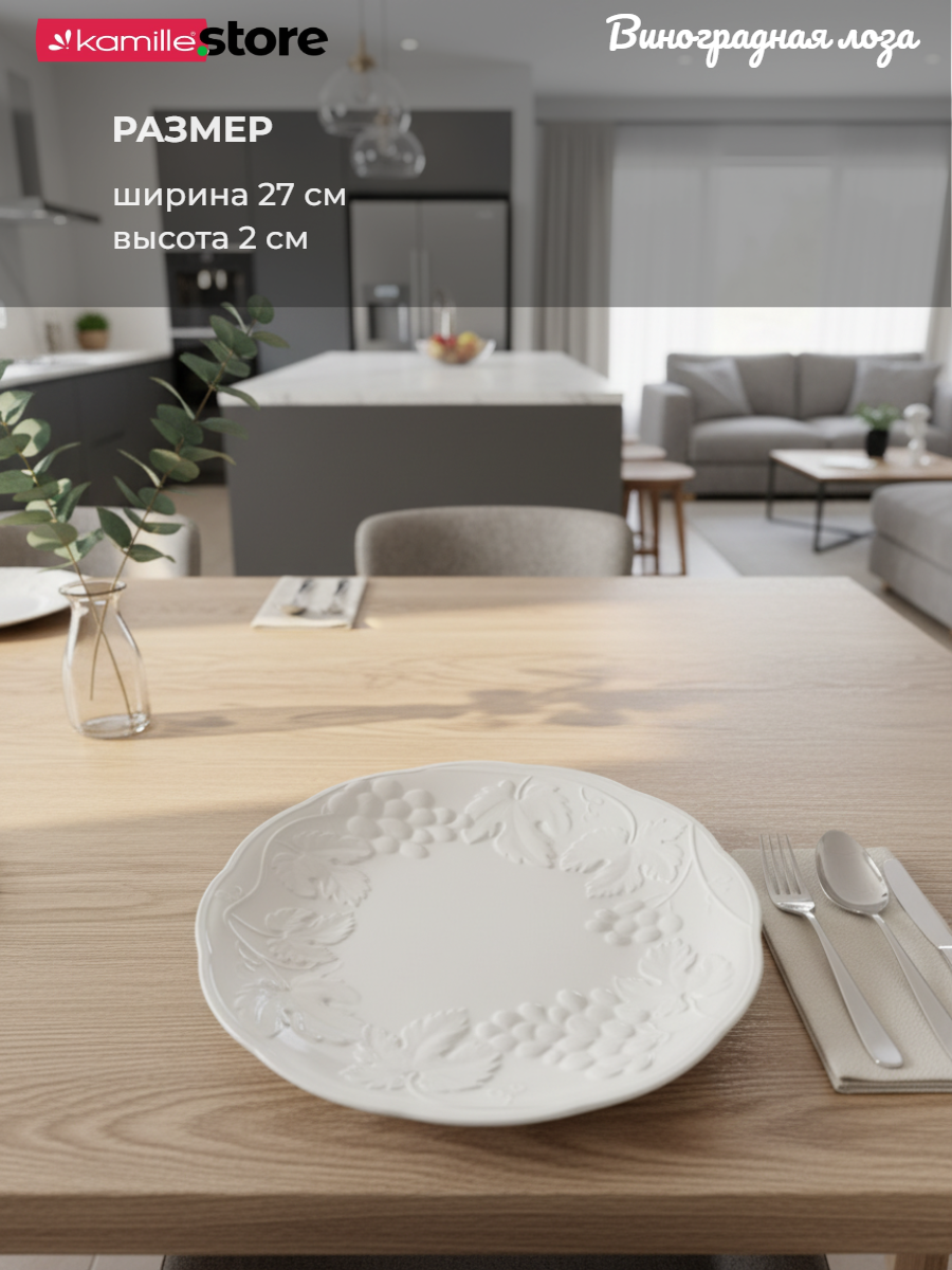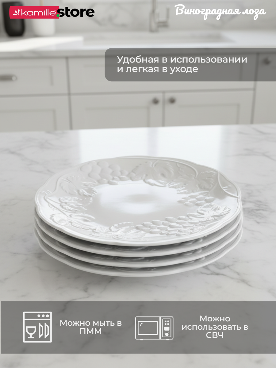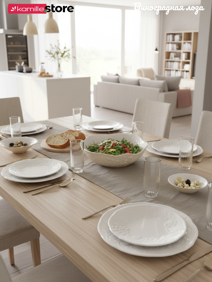 Столовая посуда серии "Виноградная лоза" - это необычная, изящная, привлекательная, белоснежная и очень практичная посуда. Все предметы из этой коллекции можно мыть в посудомоечной машине и использовать в микроволновых печах. Фарфор этой серии обладает такими характеристиками как: укрепленный край от сколов, особо прочная глазурь, минимальная пористость, практичность и долговечность. Это стильный выбор для сервировки вашего стола.