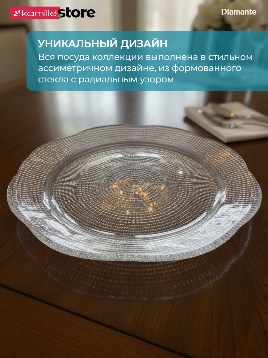 Коллекция посуды Diamante - это предметы сервировки премиального уровня, которые позволят впечатлить ваших гостей у вас дома, или стать отличным подарком для ваших близких. Сделана из формованного стекла, на внешней стороне рельефная, с особым блеском, приятная на ощупь. Внутренняя поверхность идеально гладкая. Дарите радость и красоту в каждой детали - удивляйте своих близких прекрасными подарками!