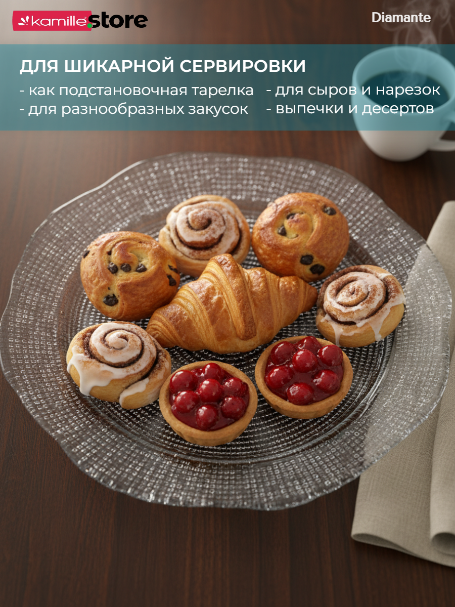 Представляем вашему вниманию красивую и необычную фигурную сервировочную тарелку из коллекции Diamante - яркая, стильная, притягивающая взгляд. Тарелка универсальная, используйте её как блюдо для сервировки и подачи сыра, закусок, десертов, выпечки и не только, или как подстановочную тарелку для праздничной сервировки. Такая посуда создана для того, чтобы добавить изысканности вашему интерьеру и придать уютной обстановке штрих оригинальности.
