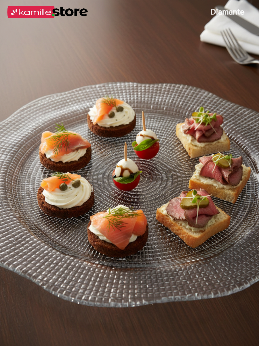 Красивое блюдо из стекла, представляет собой неотъемлемый элемент красивого сервировочного инвентаря на кухне или праздничном столе.