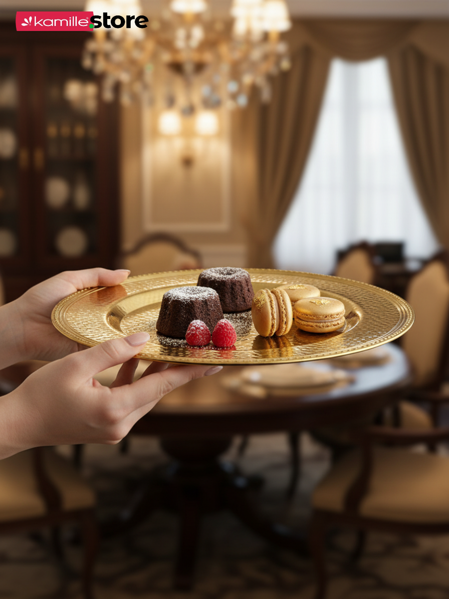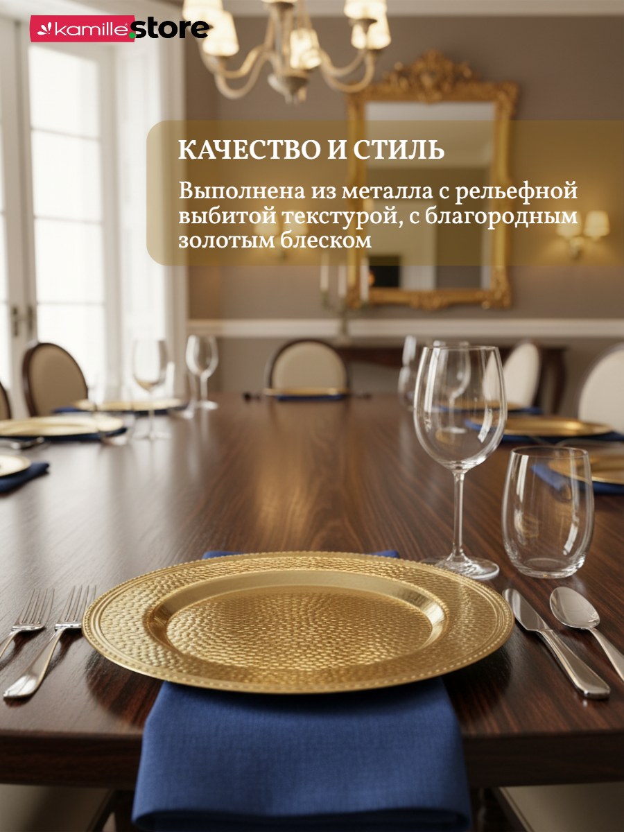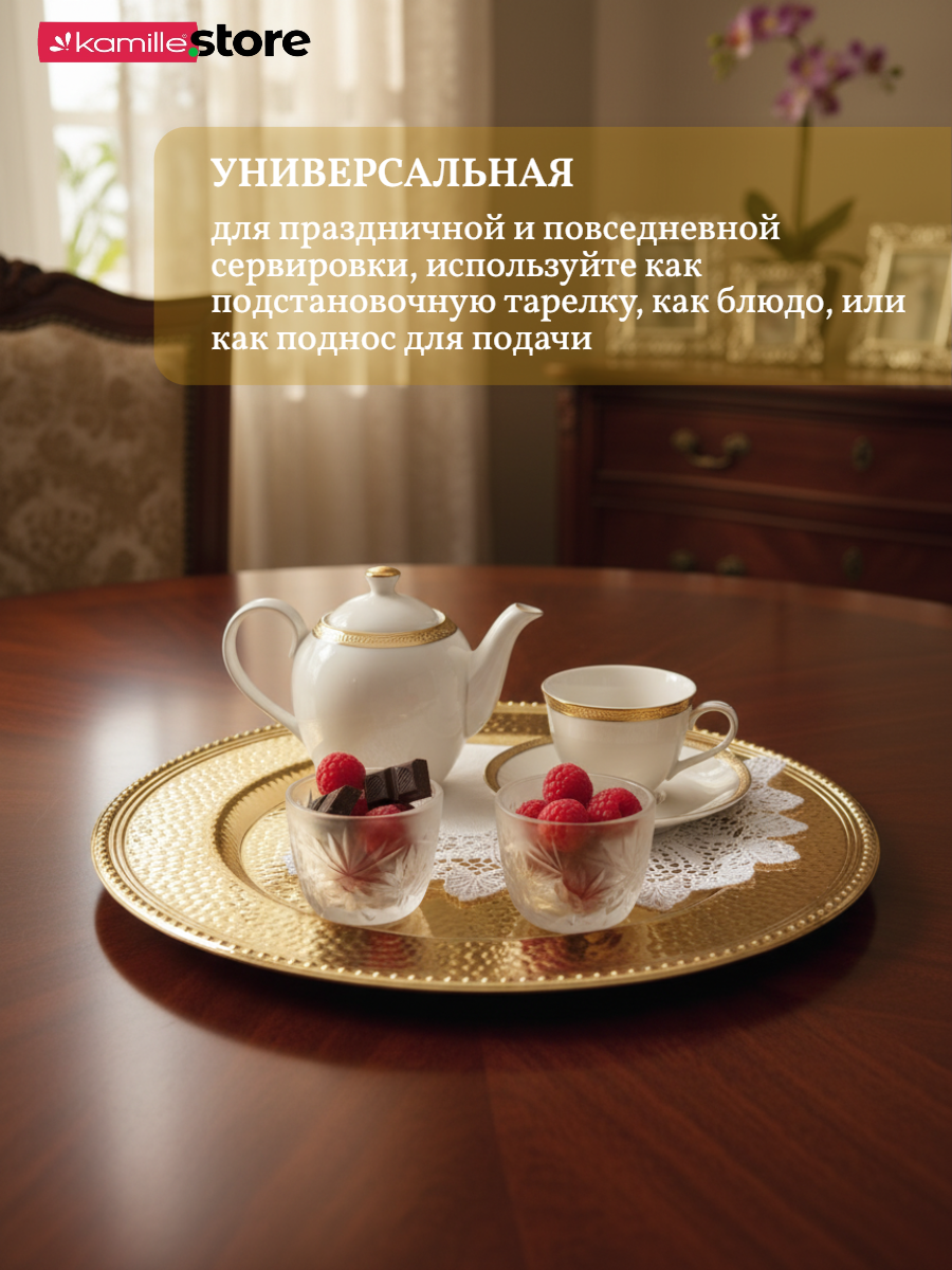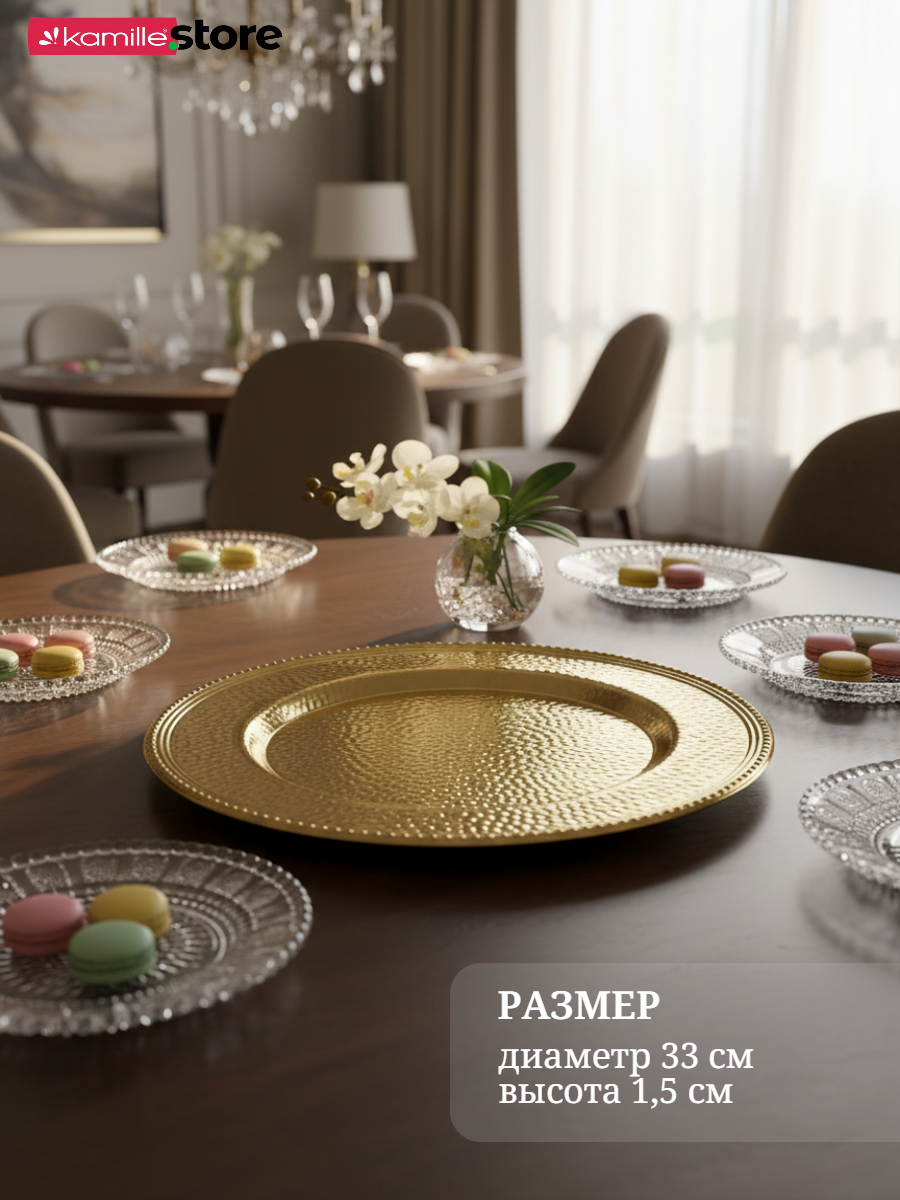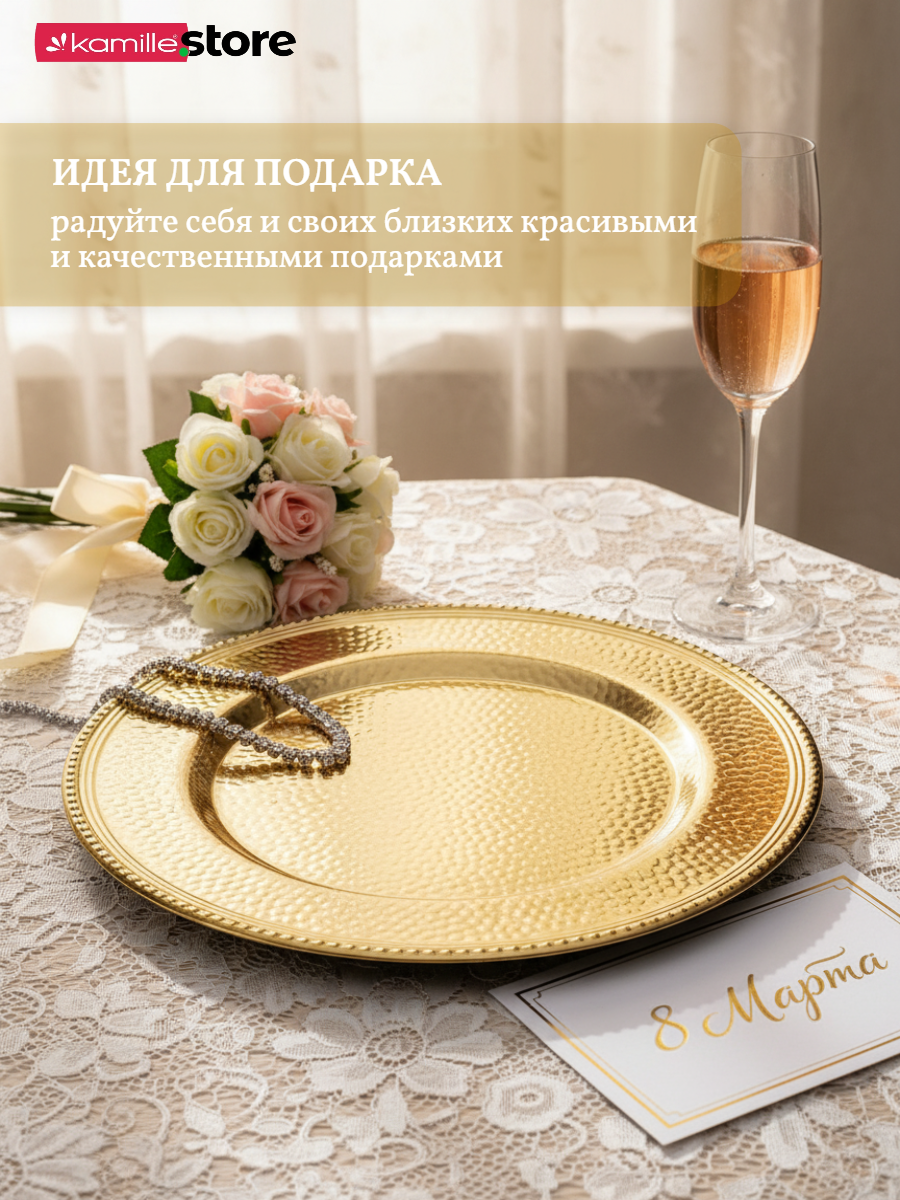 Представляем вашему вниманию стильную сервировочную тарелку диаметром 33 см! Это универсальная посуда - используйте её как подстановочную тарелку для яркой праздничной или повседневной сервировки, как блюдо или поднос для подачи самых разных продуктов.