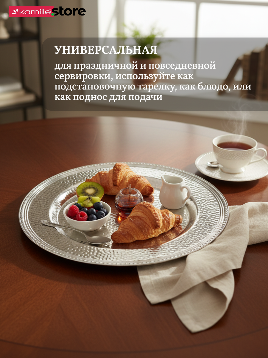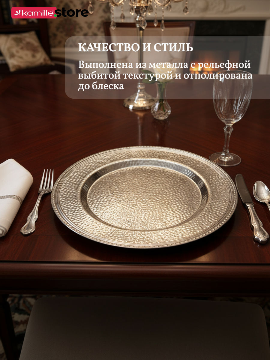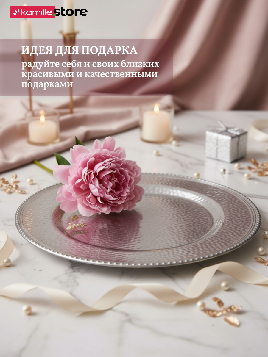 Представляем вашему вниманию стильную сервировочную тарелку диаметром 33 см! Это универсальная посуда - используйте её как подстановочную тарелку для яркой праздничной или повседневной сервировки, как блюдо или поднос для подачи самых разных продуктов.