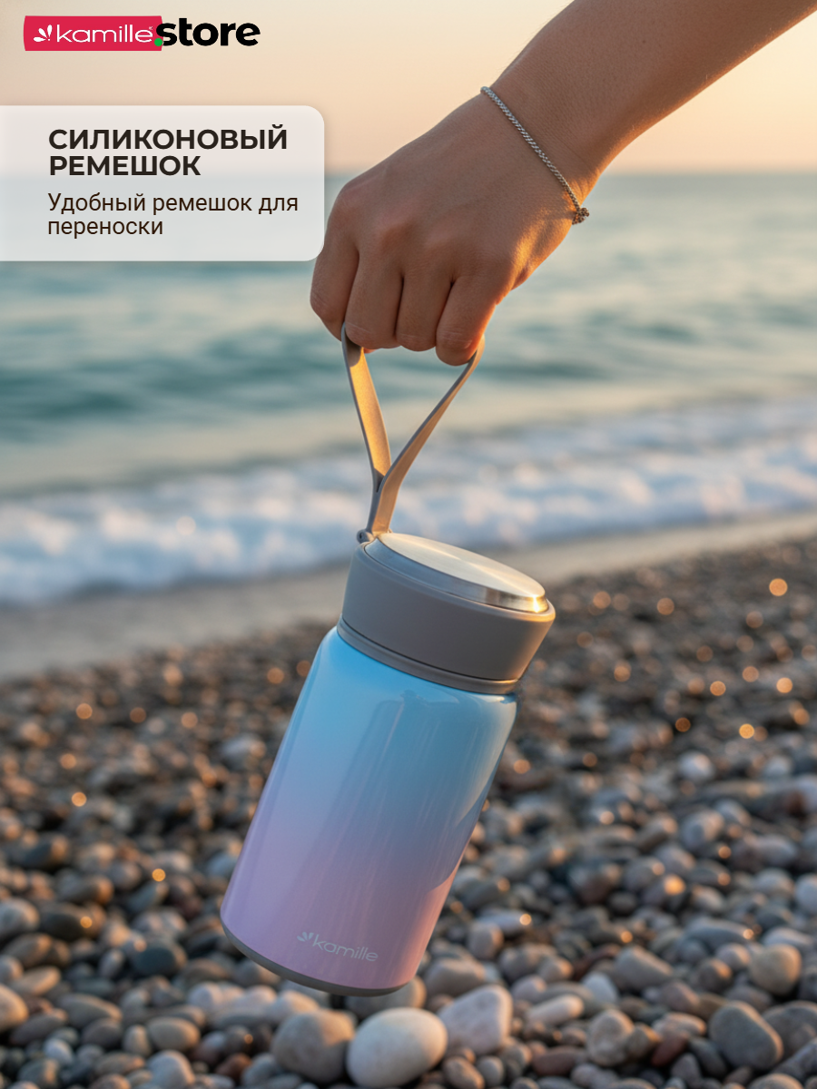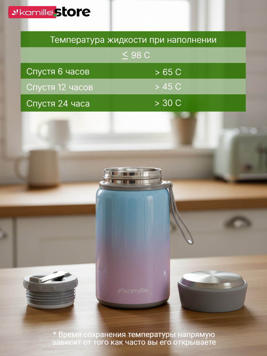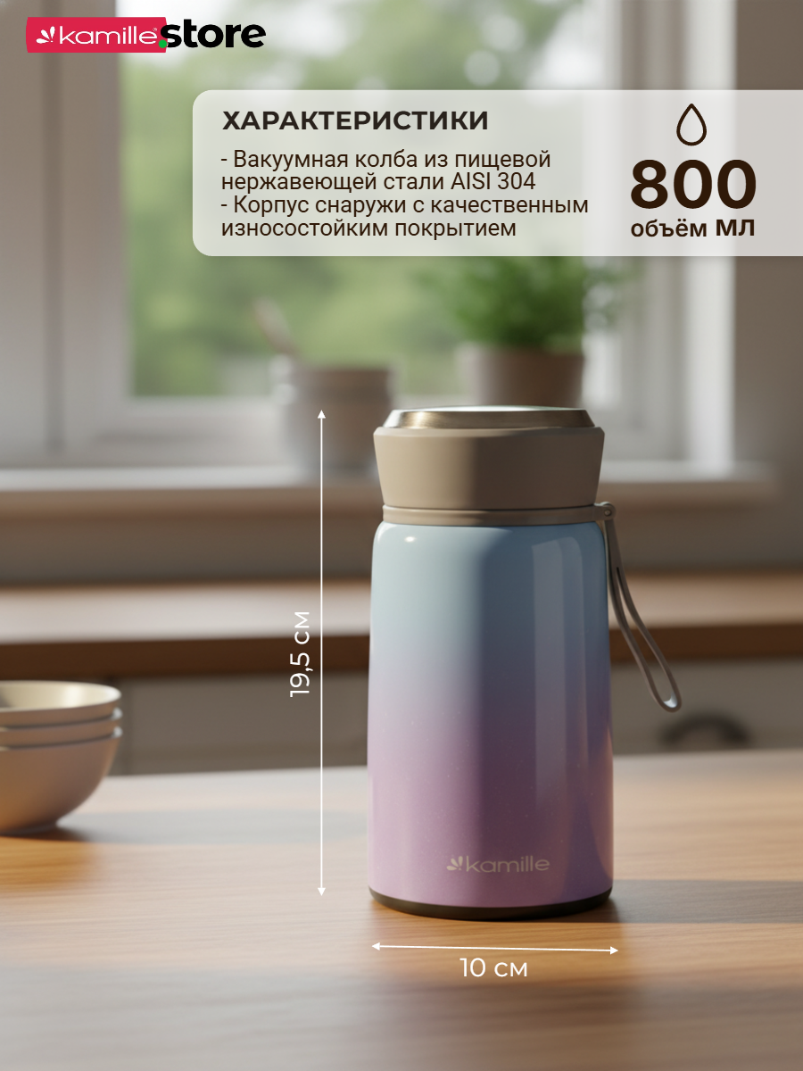 Термос Kamille обладает высоким качеством, надежностью, компактными размерами и эстетичным дизайном. Горячее остается горячим, а холодное — холодным.