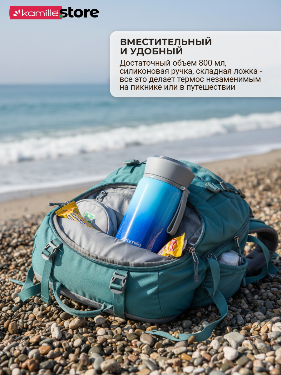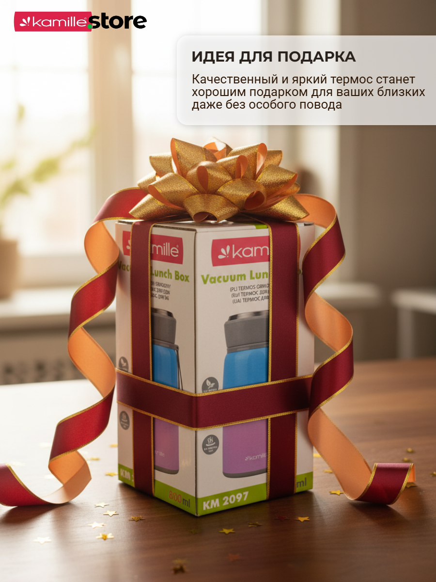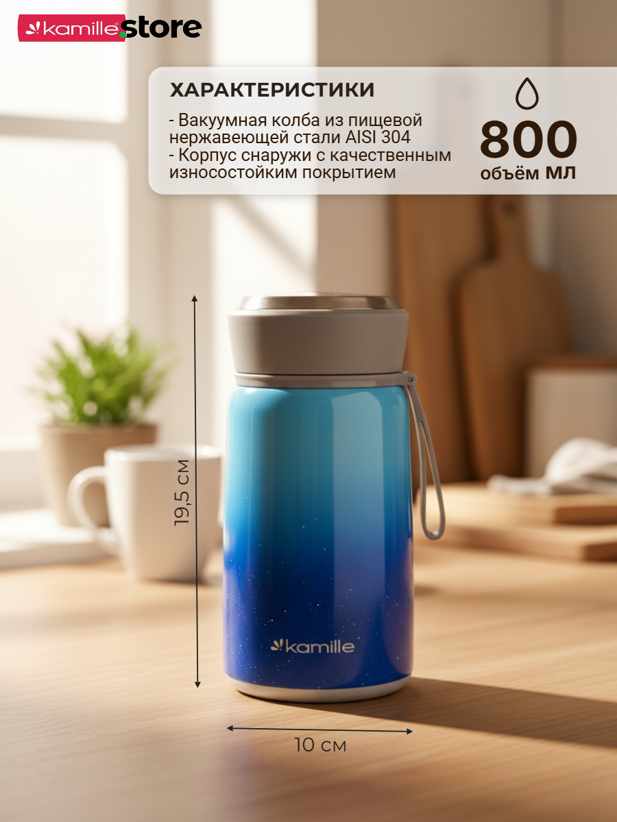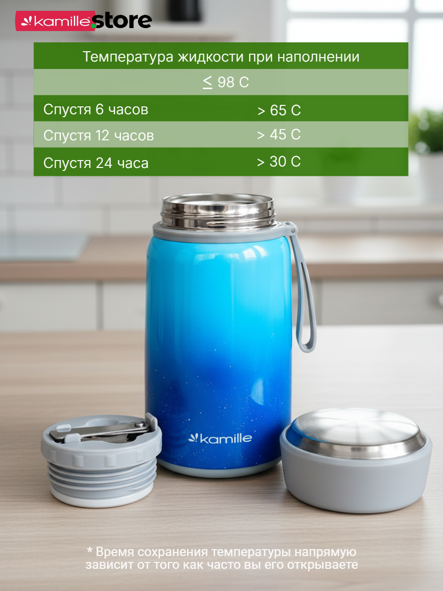Термос Kamille обладает высоким качеством, надежностью, компактными размерами и эстетичным дизайном. Горячее остается горячим, а холодное — холодным.