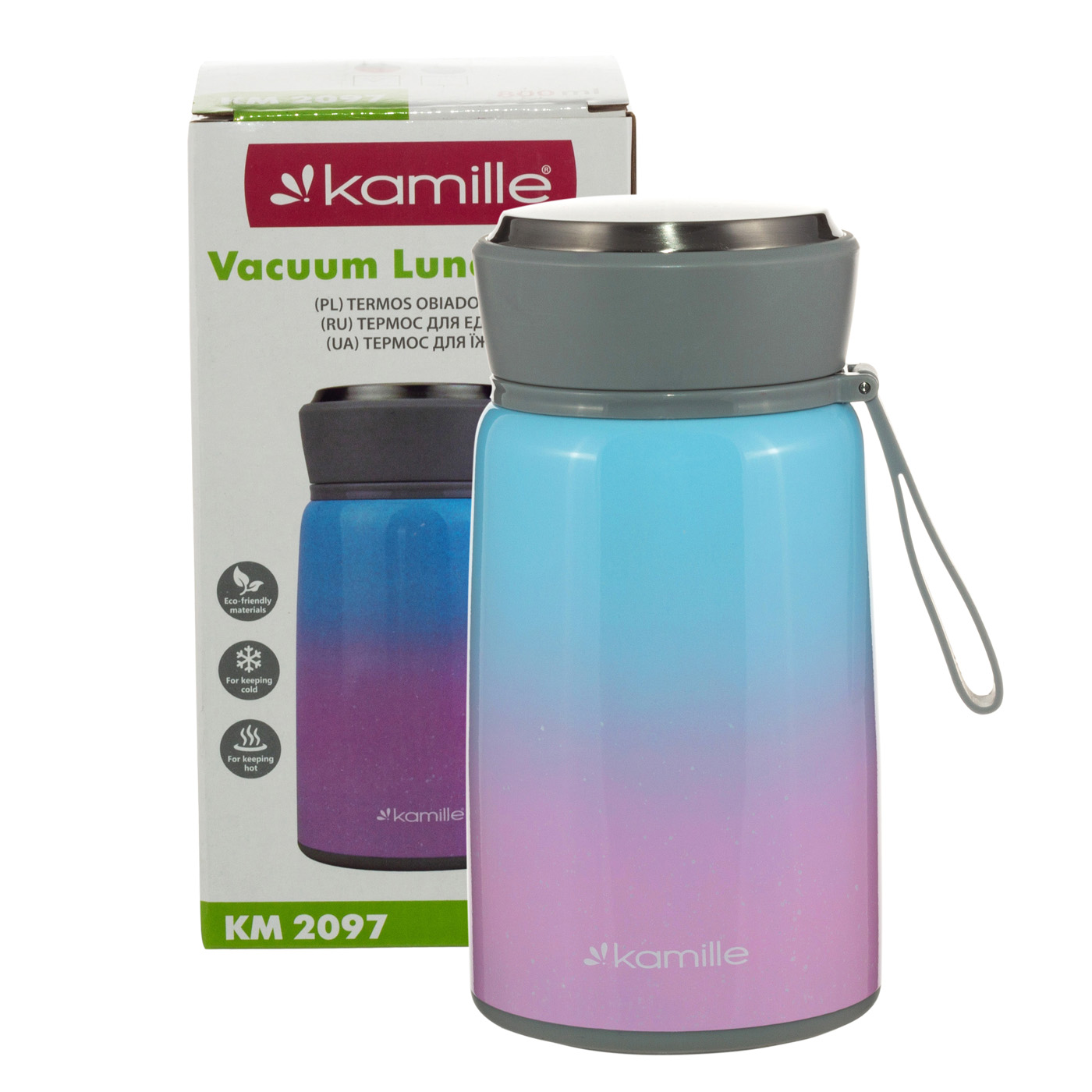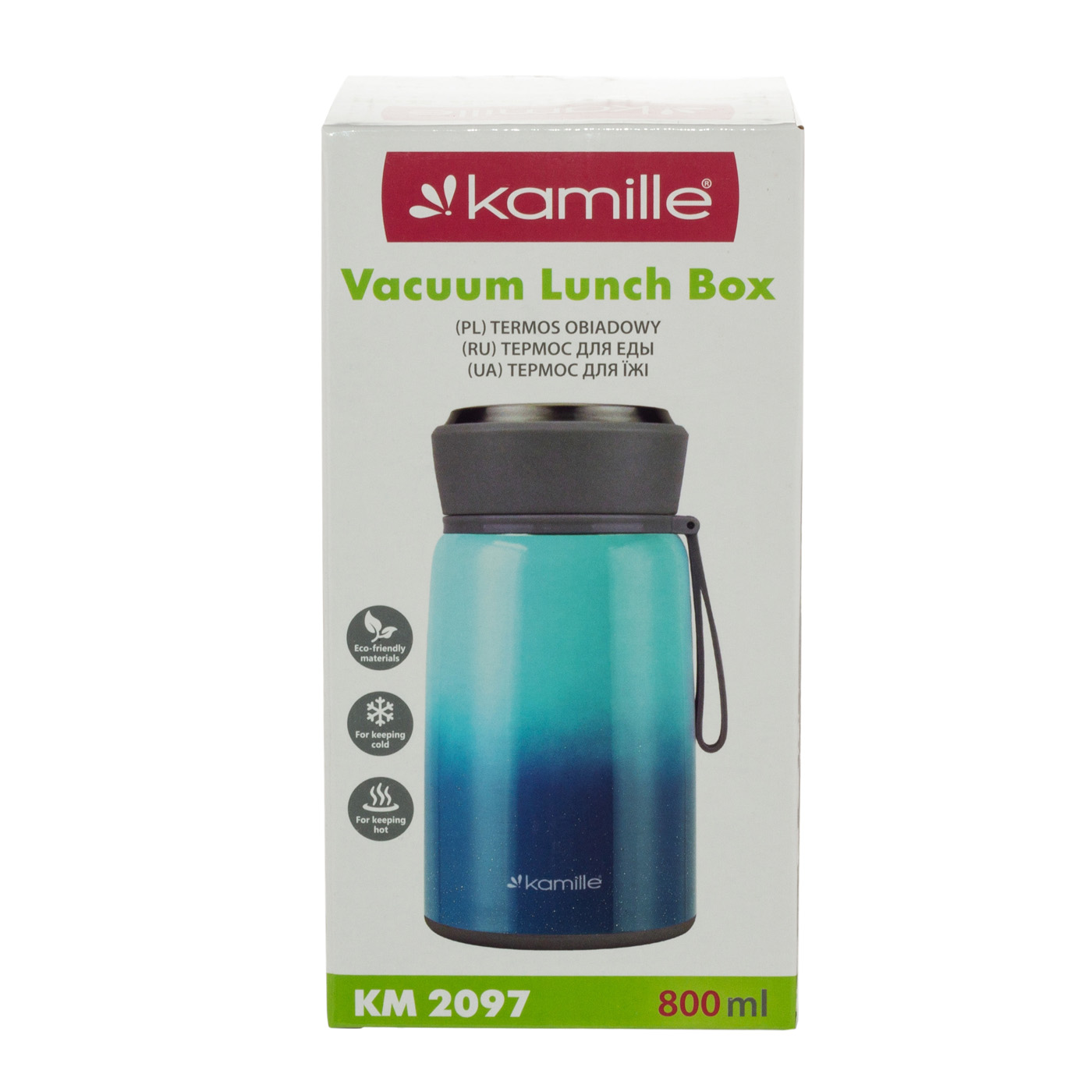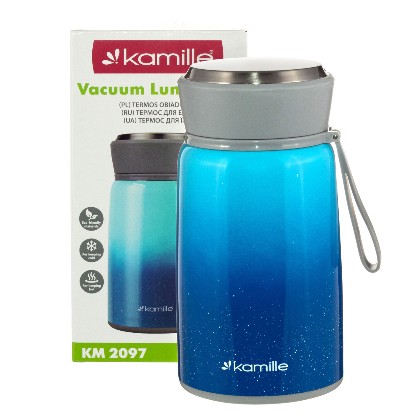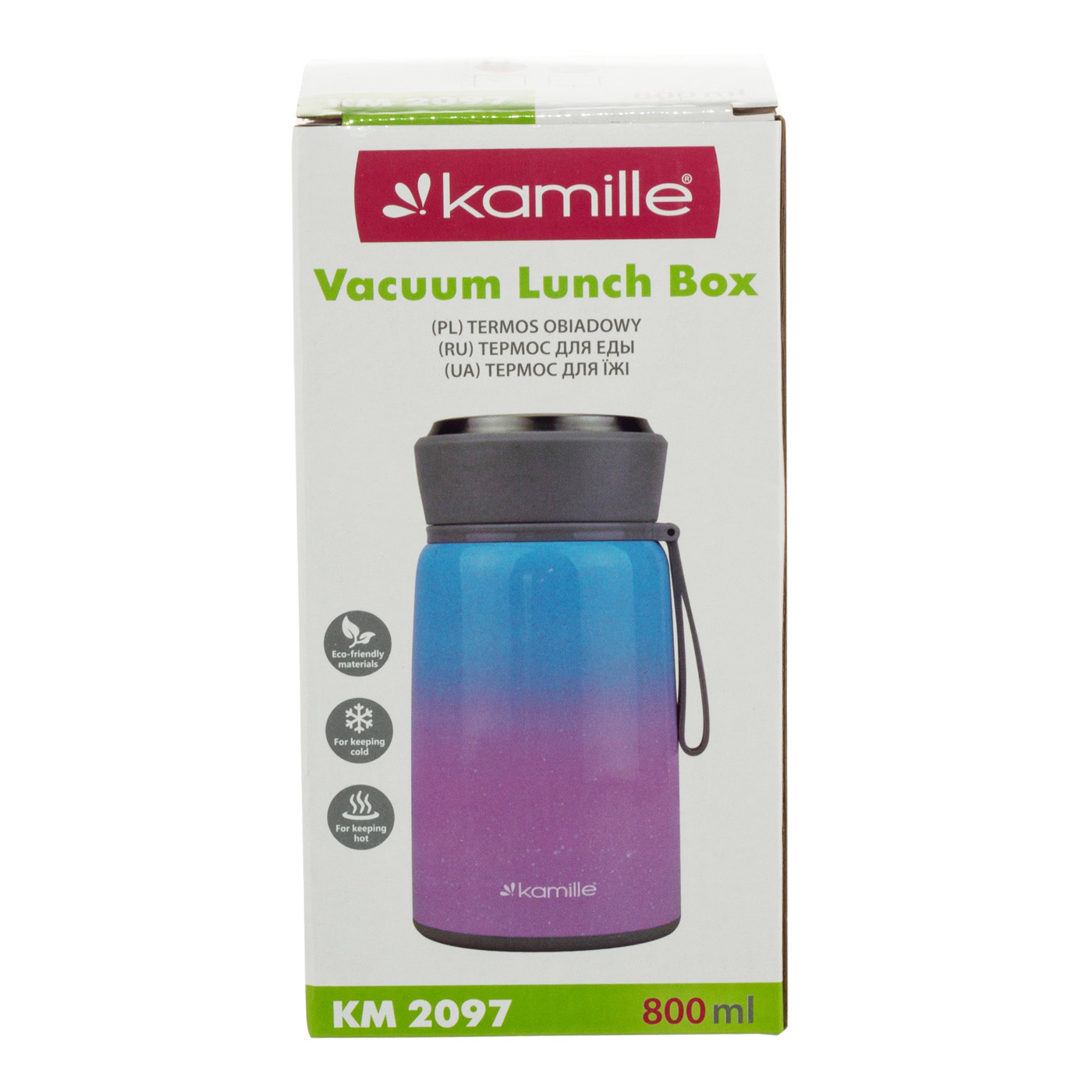 Термос KM 2097 - это идеальное решение для тех, кто ценит удобство и комфорт в повседневной жизни. Он идеально подходит для хранения и транспортировки первых и вторых блюд, или напитков, сохраняя продукты горячими до 8 часов. Изготовлен из качественных и безопасных материалов - нержавеющая сталь и пищевой пластик, которые обеспечивают практичность и долговечность использования, не впитывают запахи и не меняют вкуса. Герметичная крышка предотвращает протекание и сохраняет температуру продуктов на оптимальном уровне. Для исключения потери тепла следует заполнять колбу, не доходя 1 см до внутренней крышки. Широкое горлышко позволяет легко и аккуратно наложить обед и быстро очистить термос от остатков пищи. Компактный размер, делает его идеальным для разных сценариев использования - в путешествии, на пикнике, для работы или учебы.